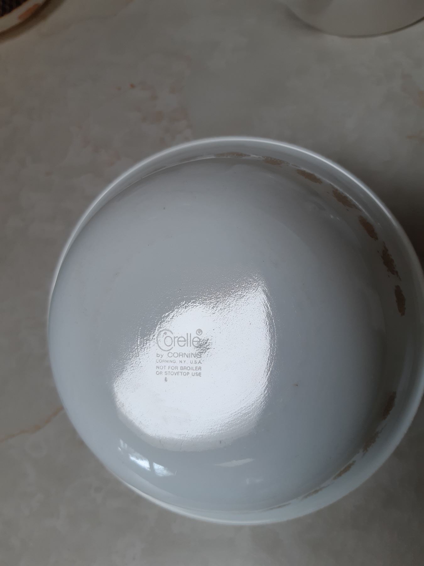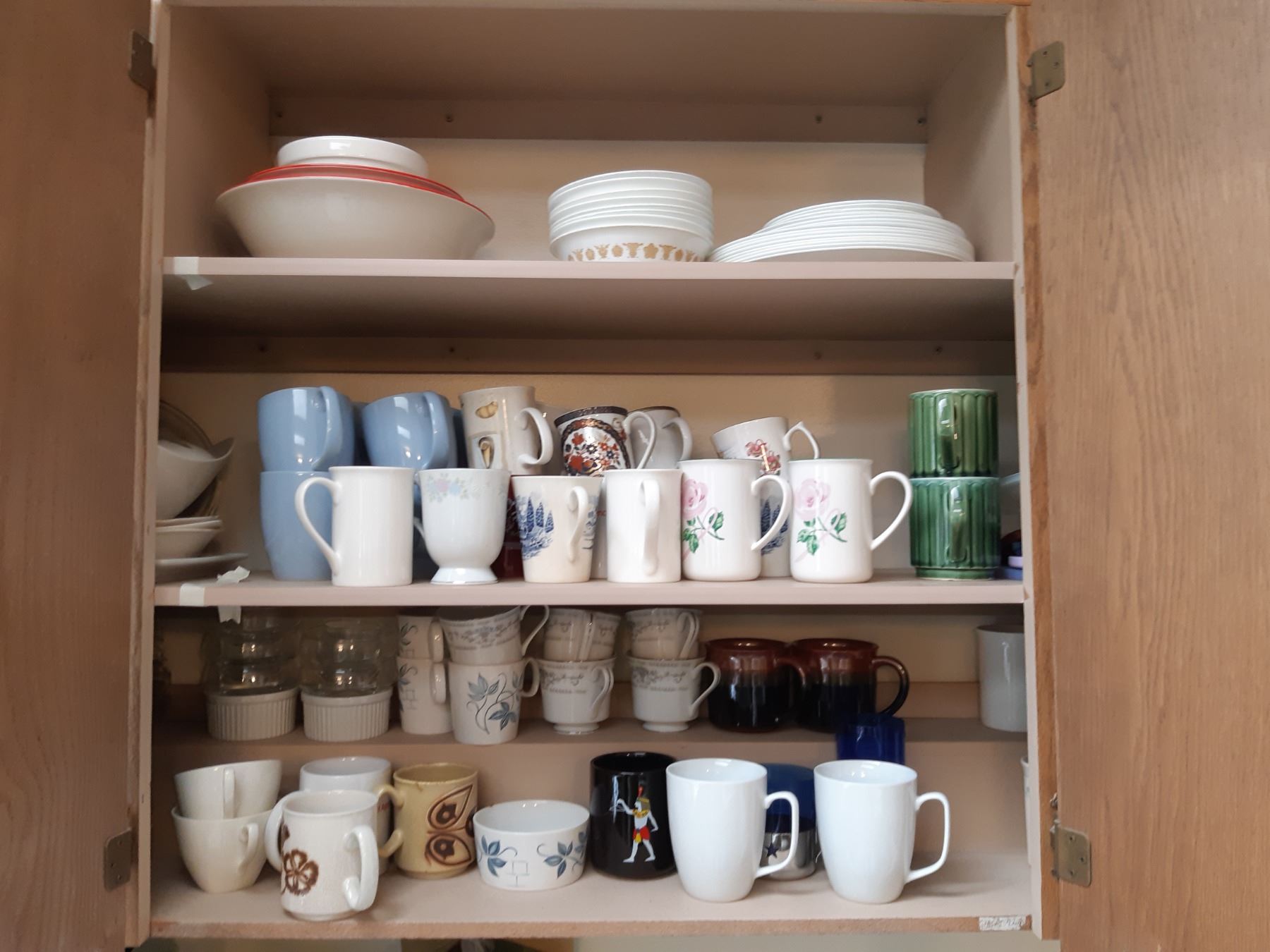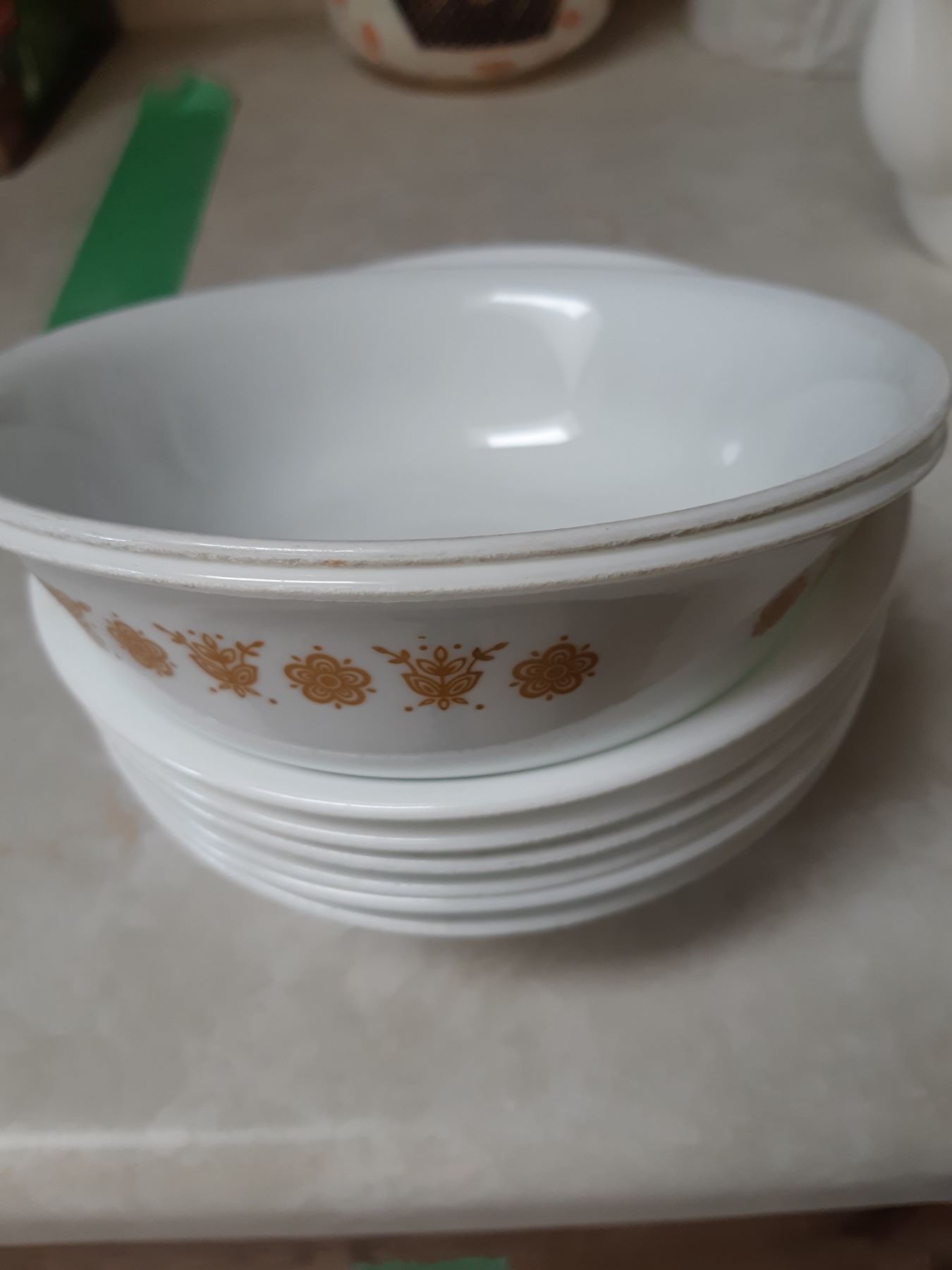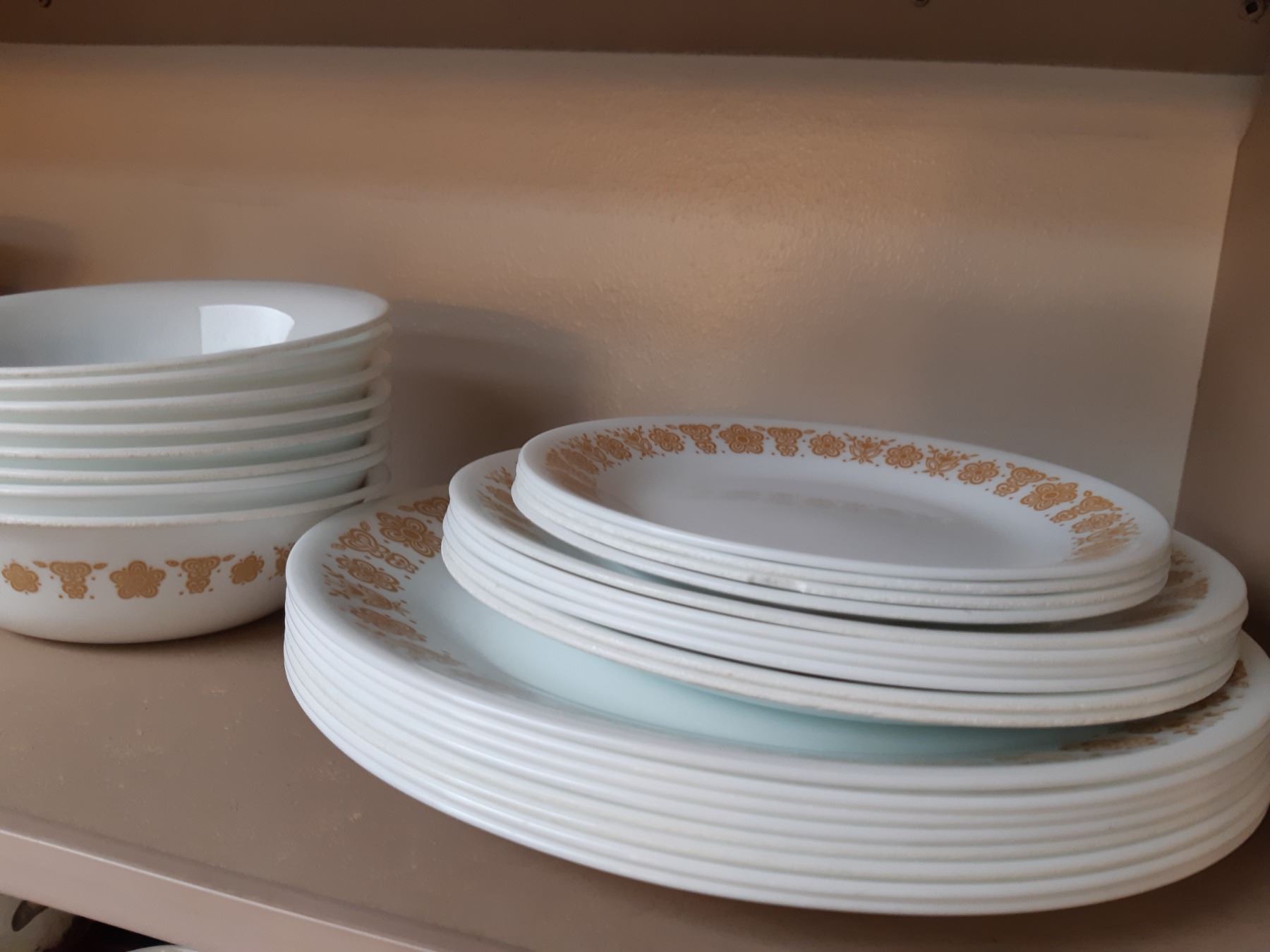 8 plates, 8 bread and butter, please note some have chips, 20 coffee cups, serving bowl 13" and more. Pickup at 9 am. Please bring packing materials.