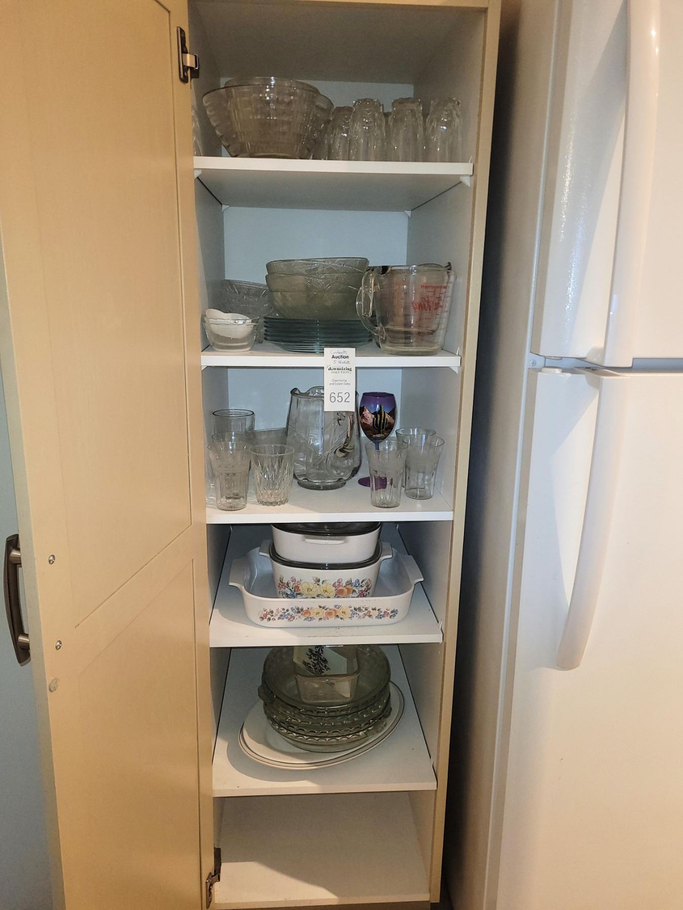3 Corningware, 1 open baker and 2 lidded casseroles. Fireking & Pyrex measuring jugs. Pyrex pie dishes, oblong platters and glass drinking. Pickup at 9 am