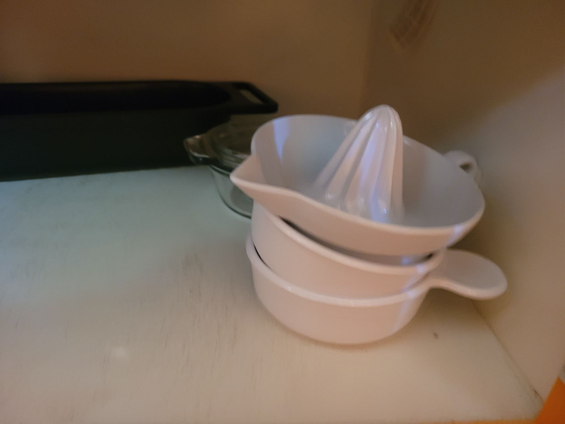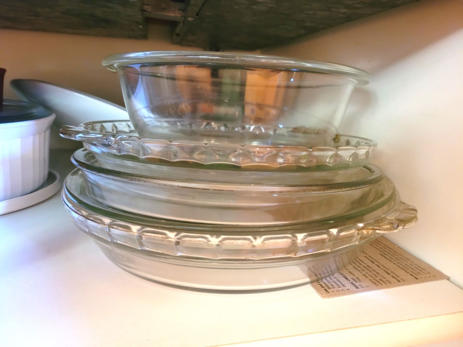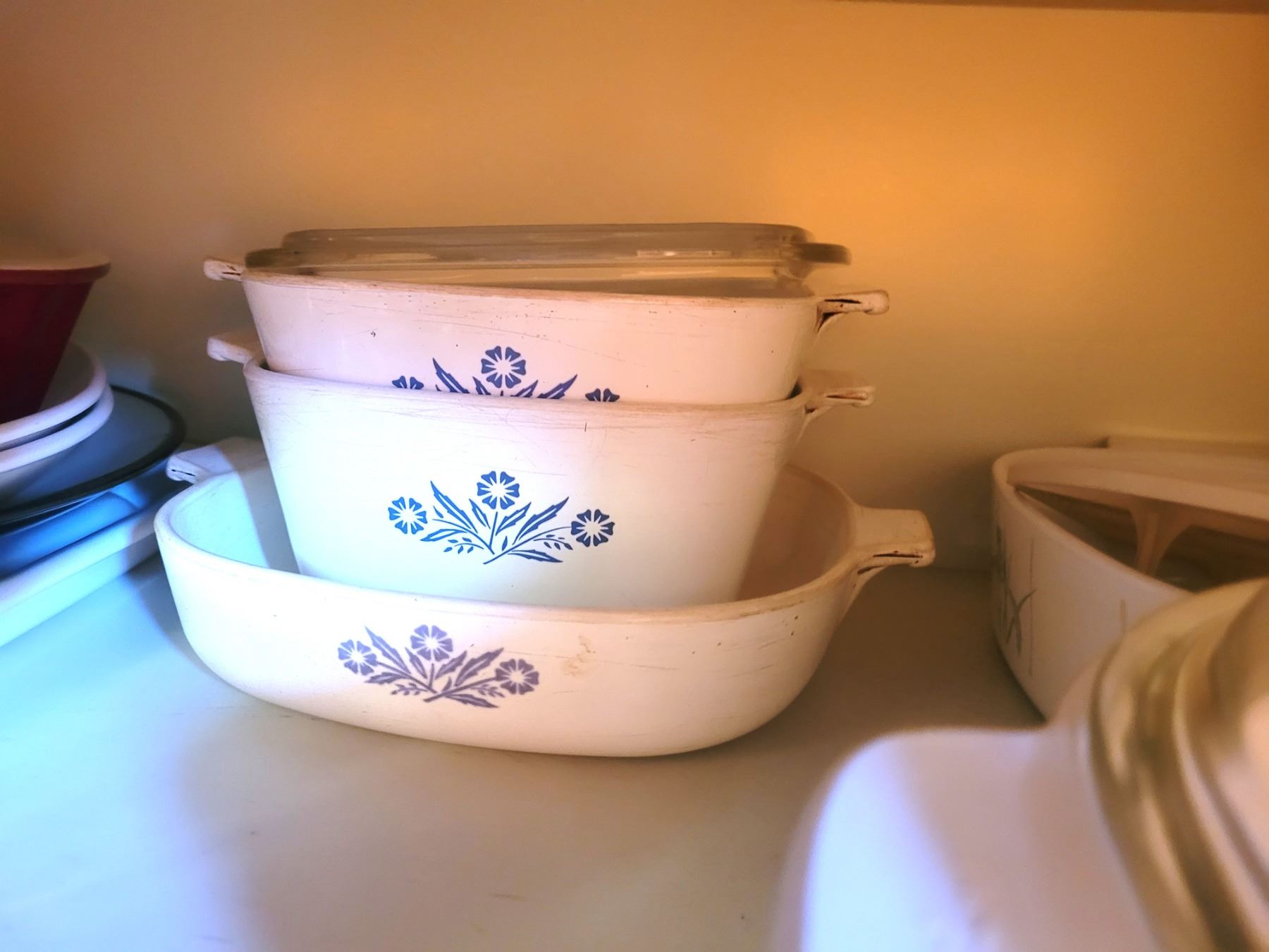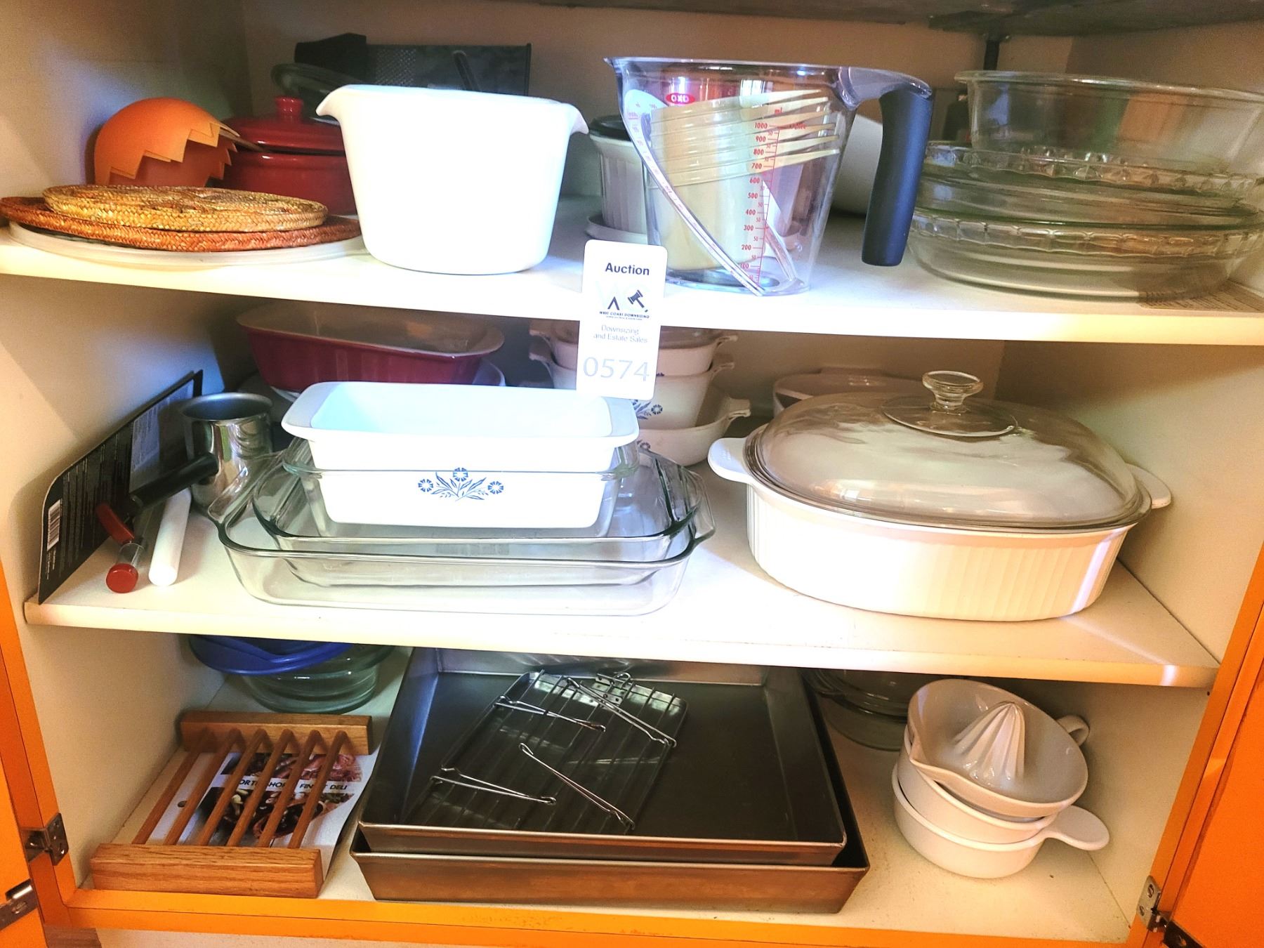 Pyrex bakeware , cookware. Corningware. 3 shelves. Pickup at 9 am