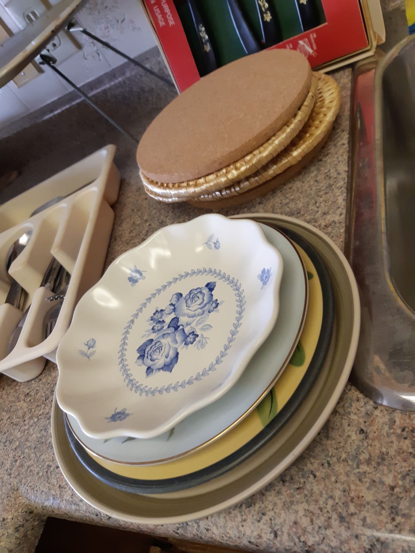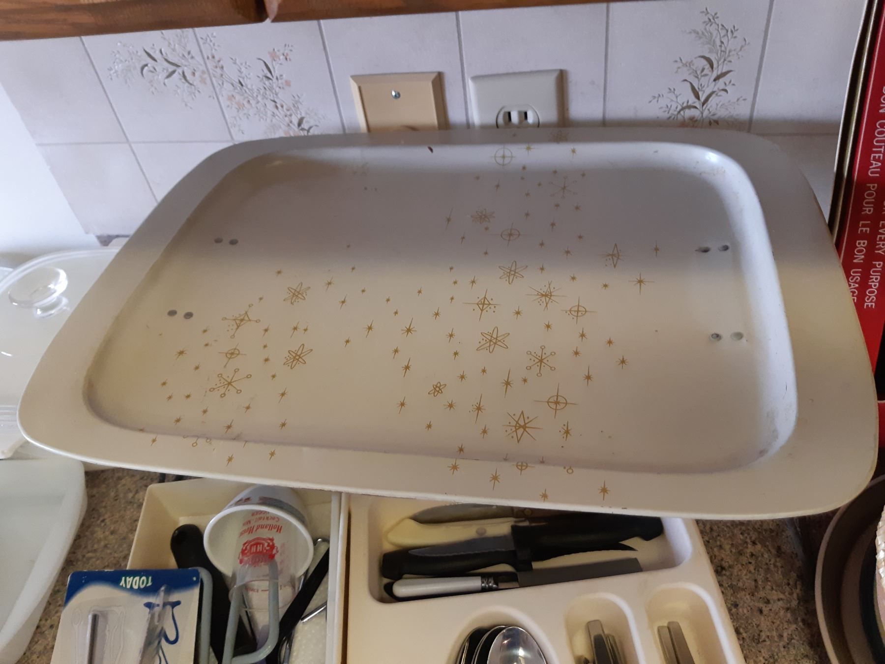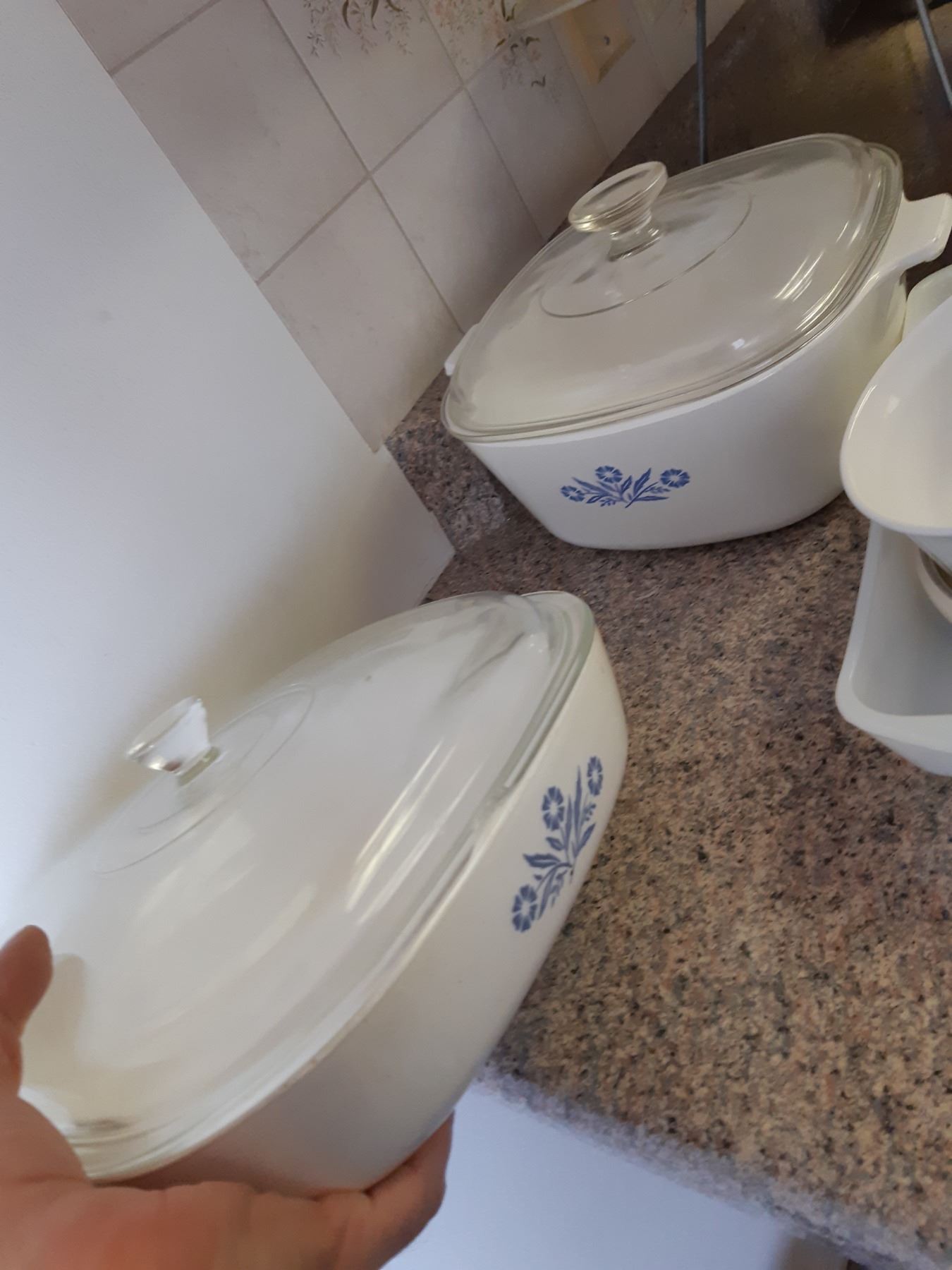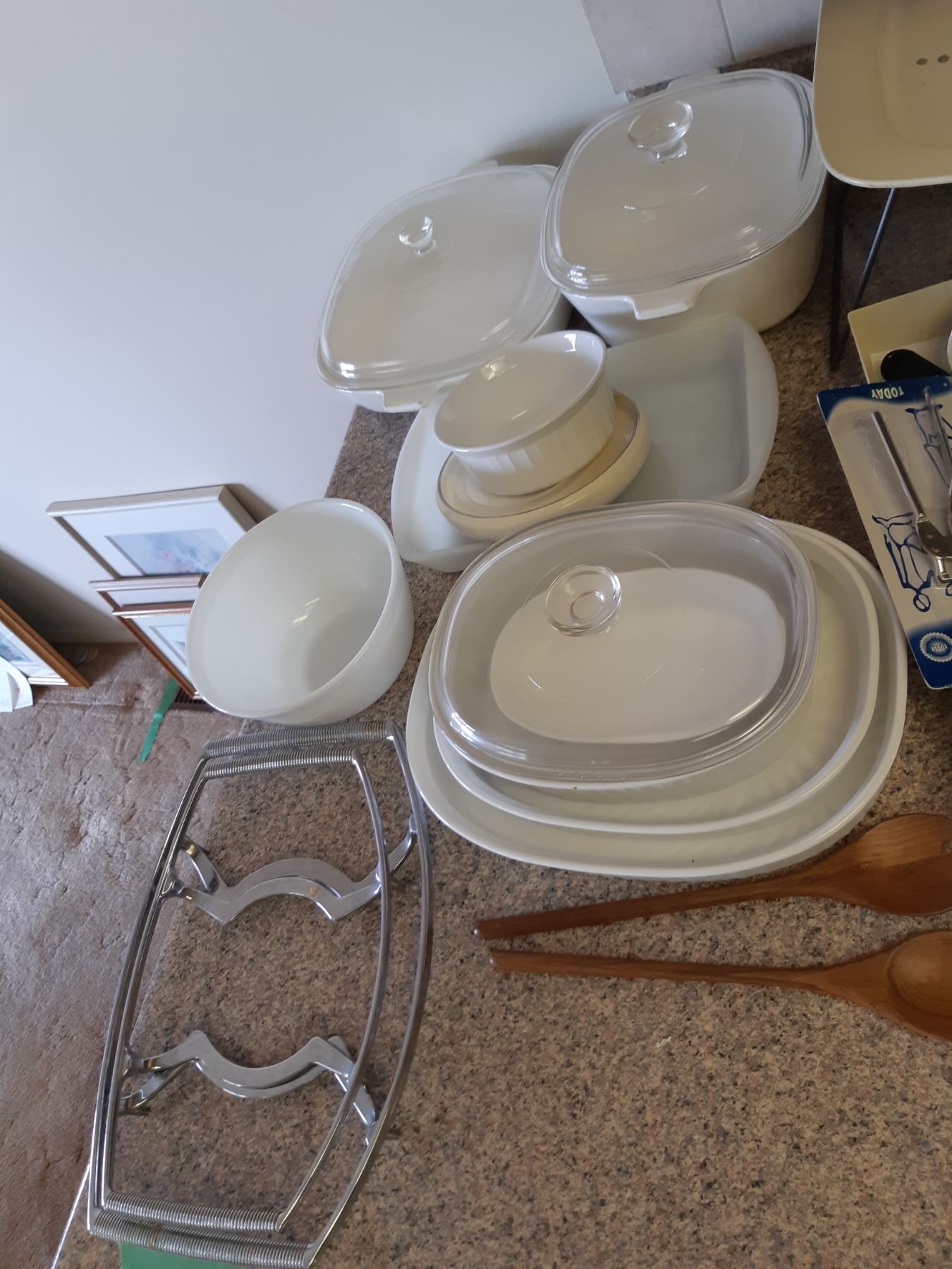 Collection of Corning ware serving and baking dishes(one chip noted), vintage bed tray. Bring packing materials. Pick up at 10:00 am