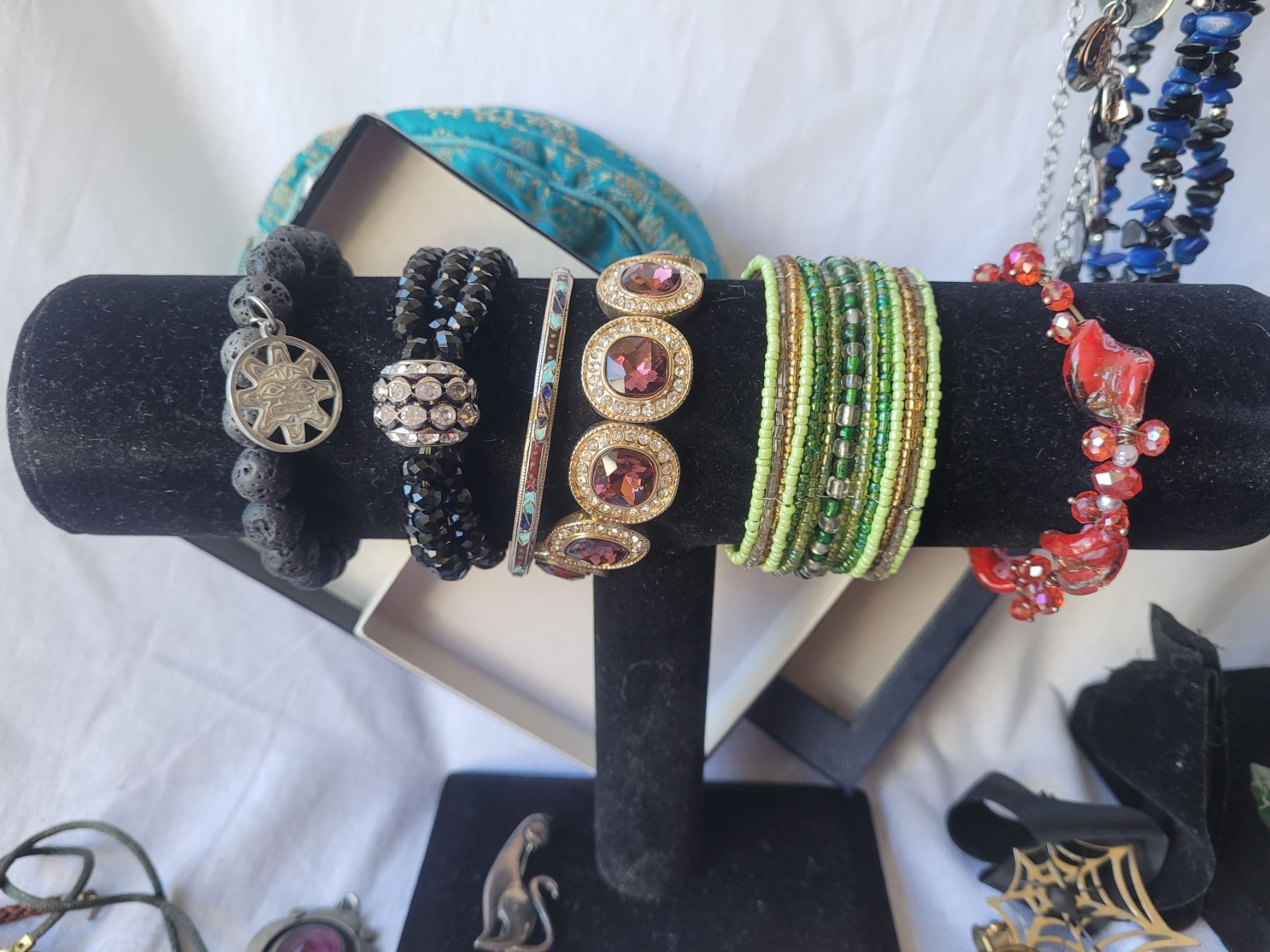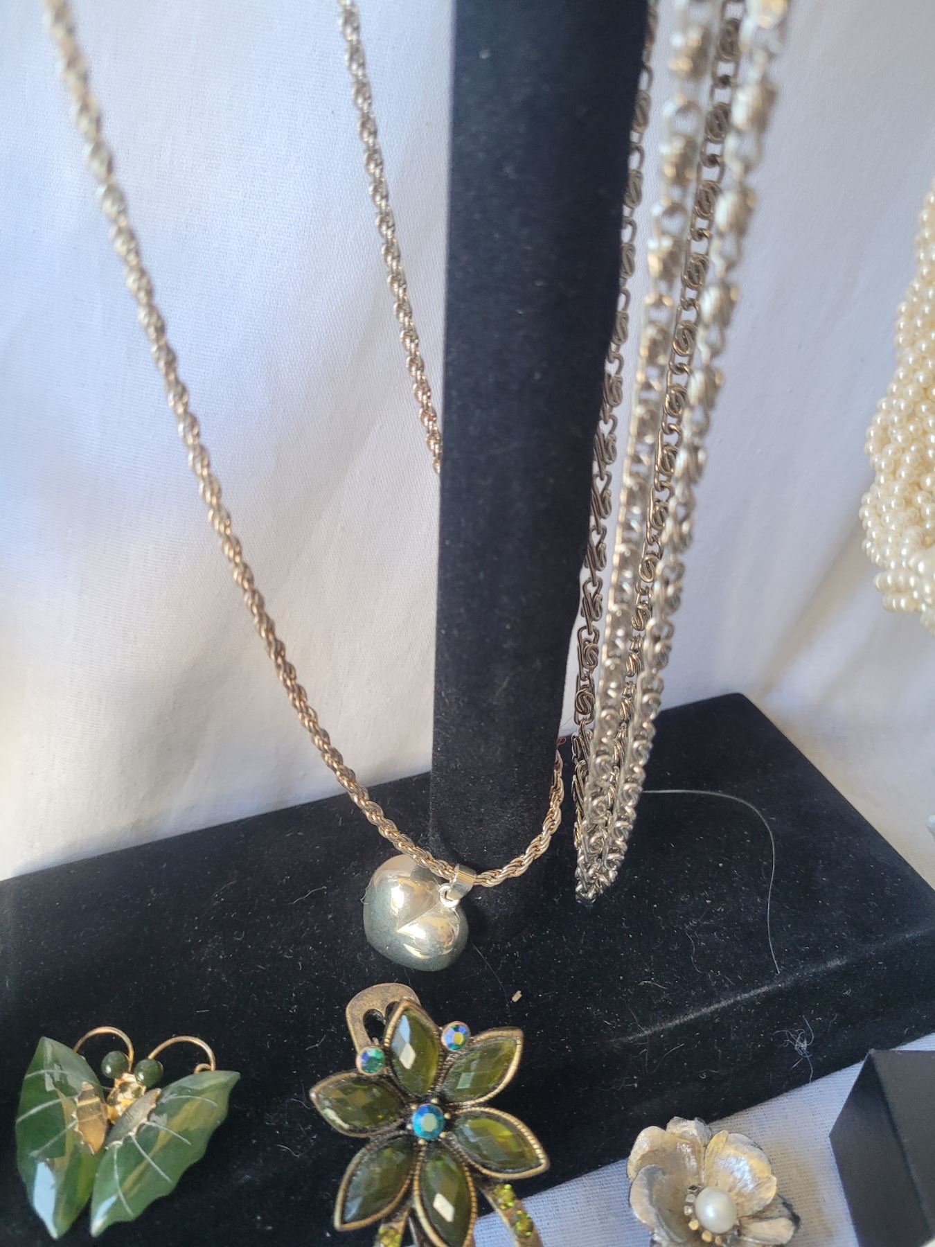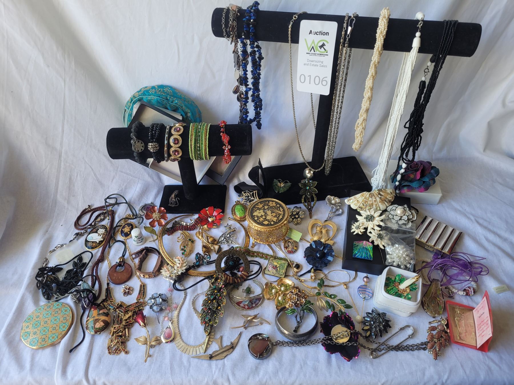 Assortment of necklaces, earrings, brooches, vintage compacts, sterling silver bracelet and more. Pickup at 9 am