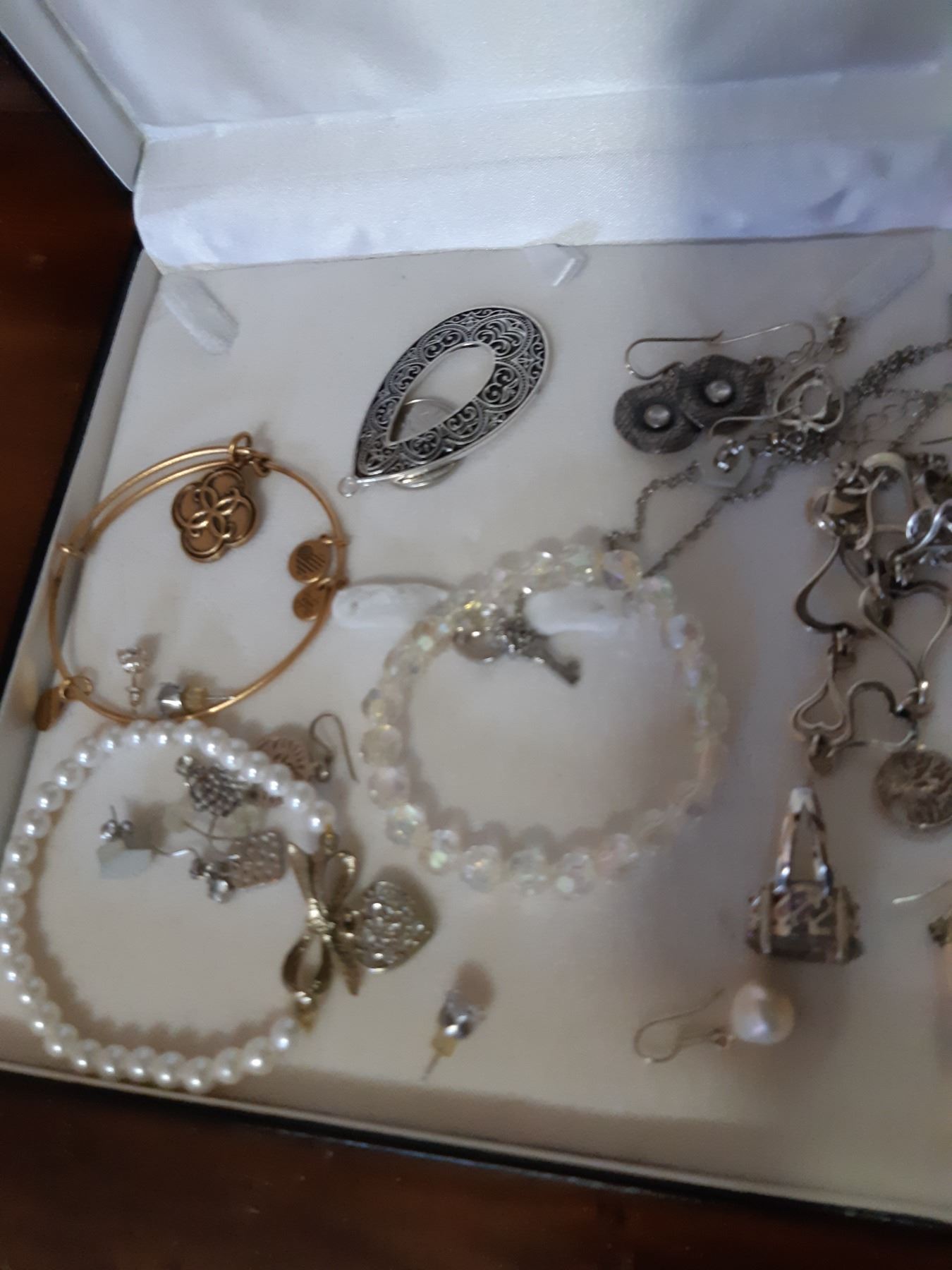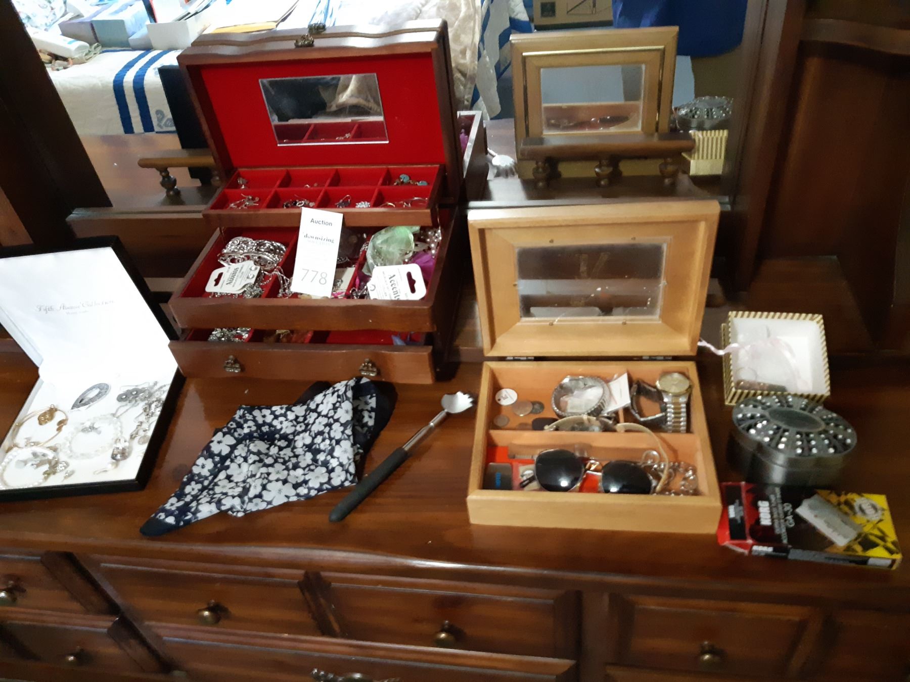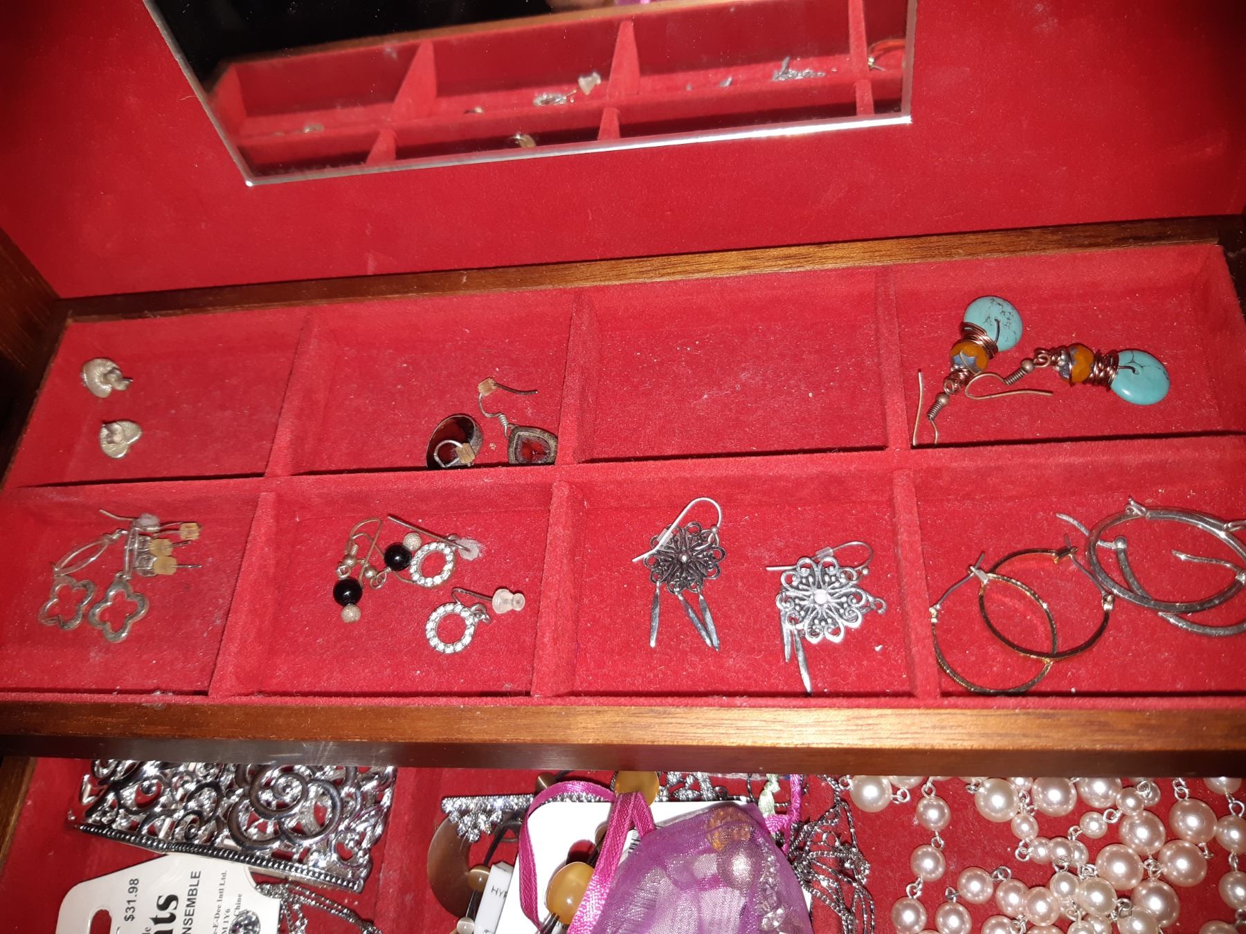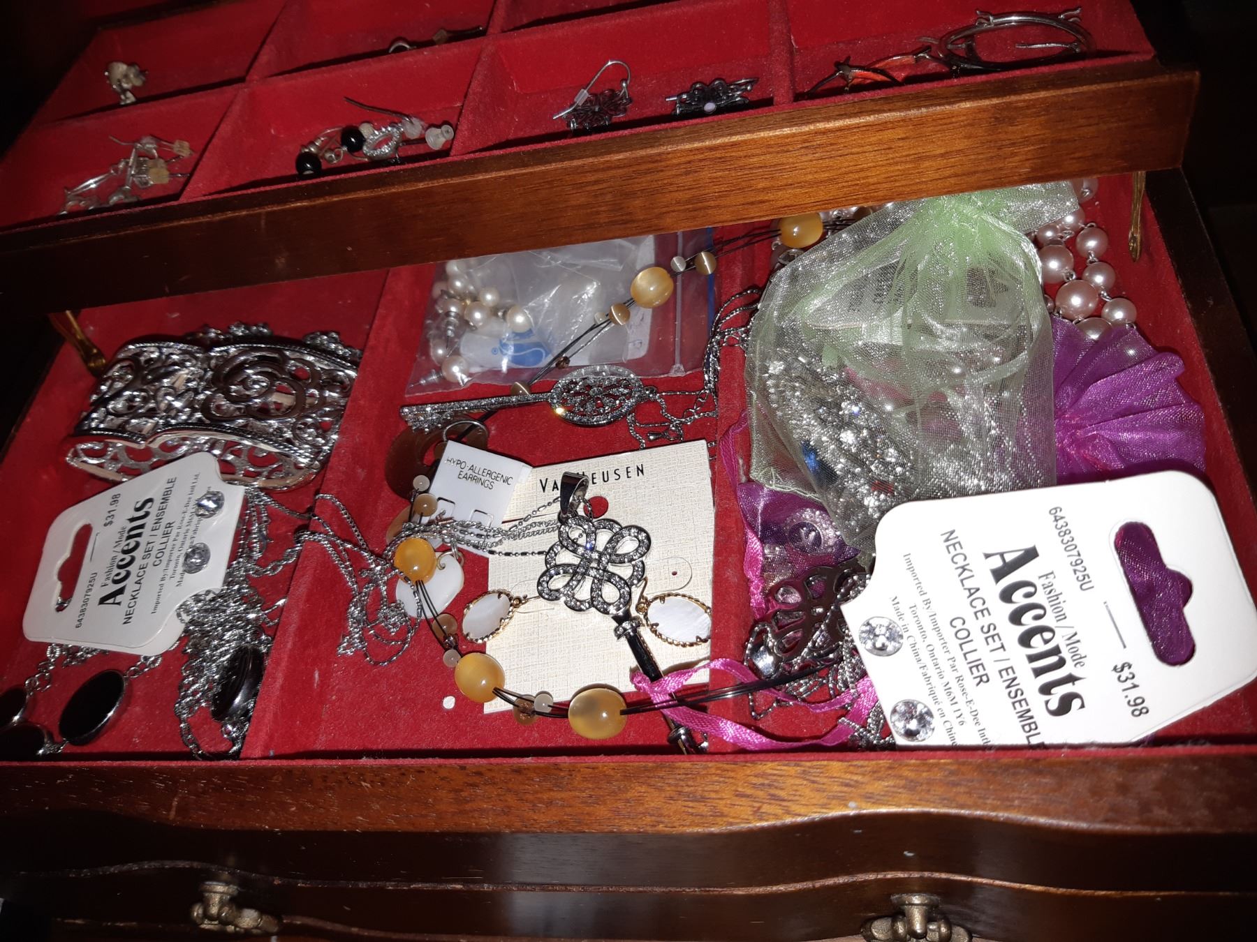Jewery box, ladies and men's watches, bracelets, earrings & neclases. Pickup at 9 am