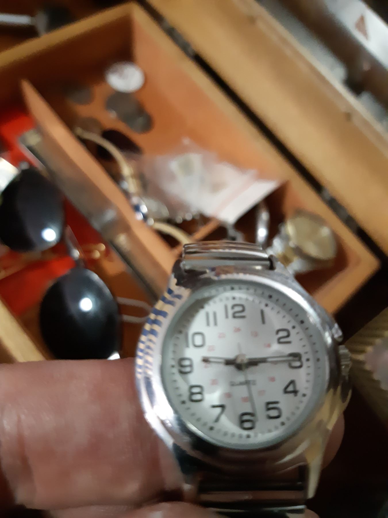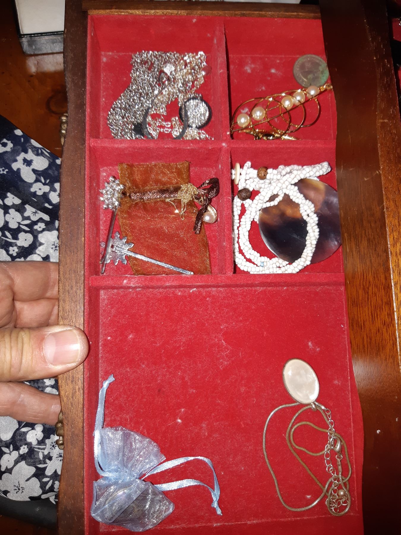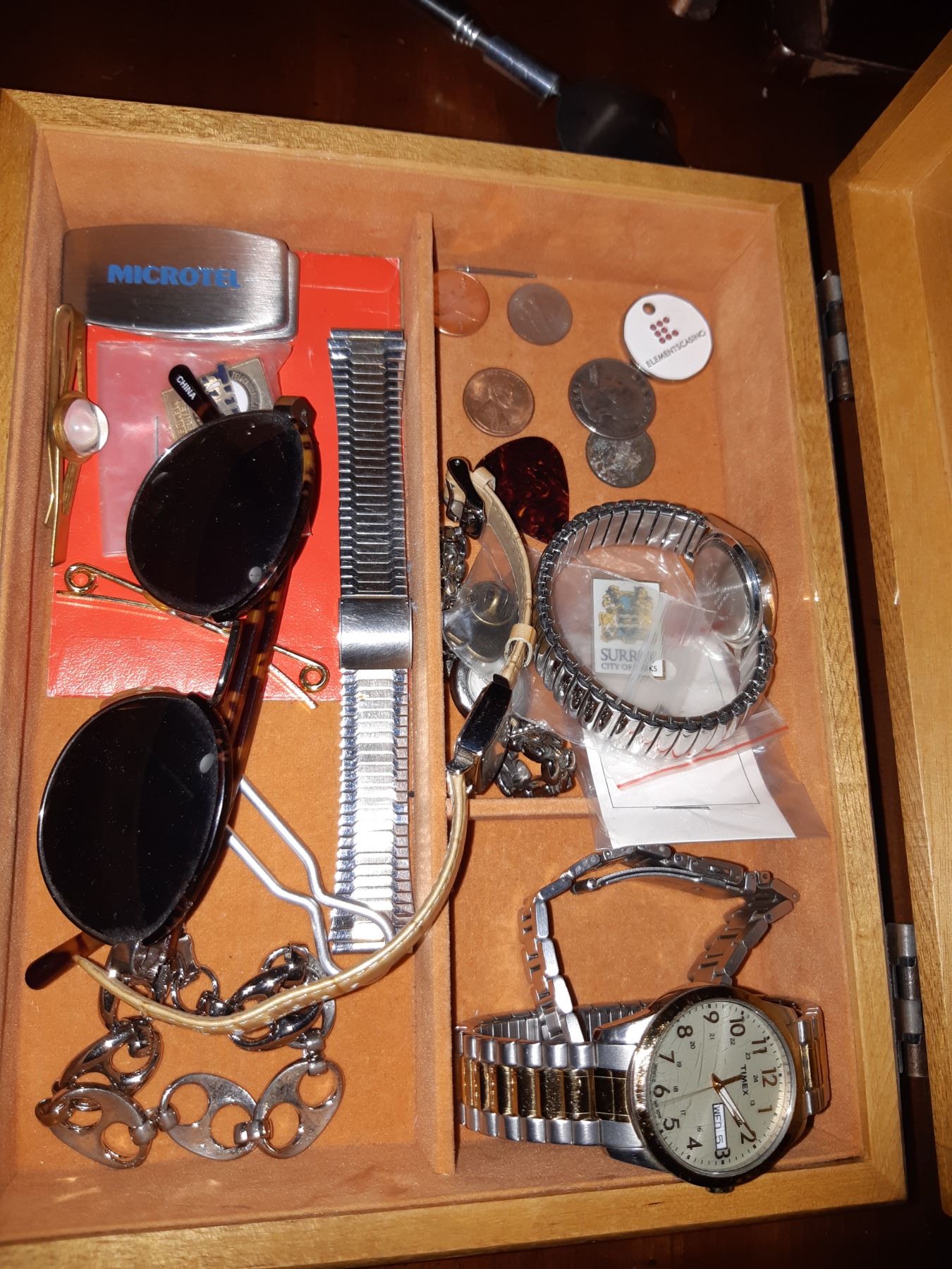 Jewery box, ladies and men's watches, bracelets, earrings & neclases. Pickup at 9 am