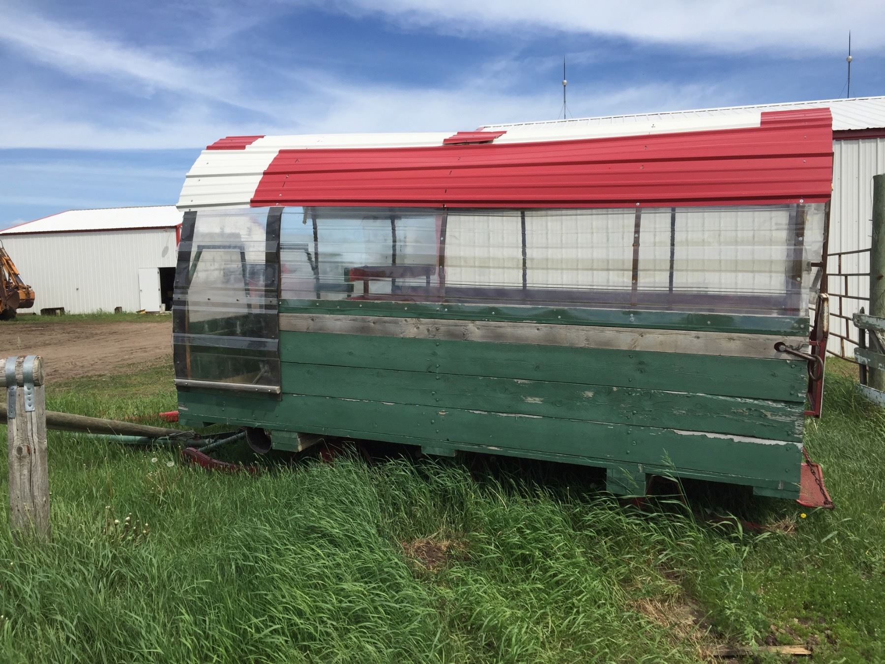 Covered sleigh green in color with tin and plexi glass sides and roof, bench seats