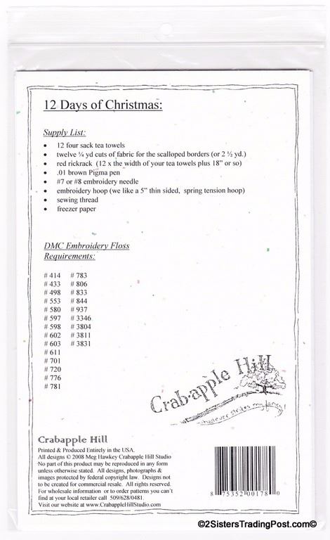 Pattern #416 'Twelve Days of Christmas' tea towels. This pack includes patterns for all 12 days. 2008 design by Meg hawkey for Crabapple Hill Studio.