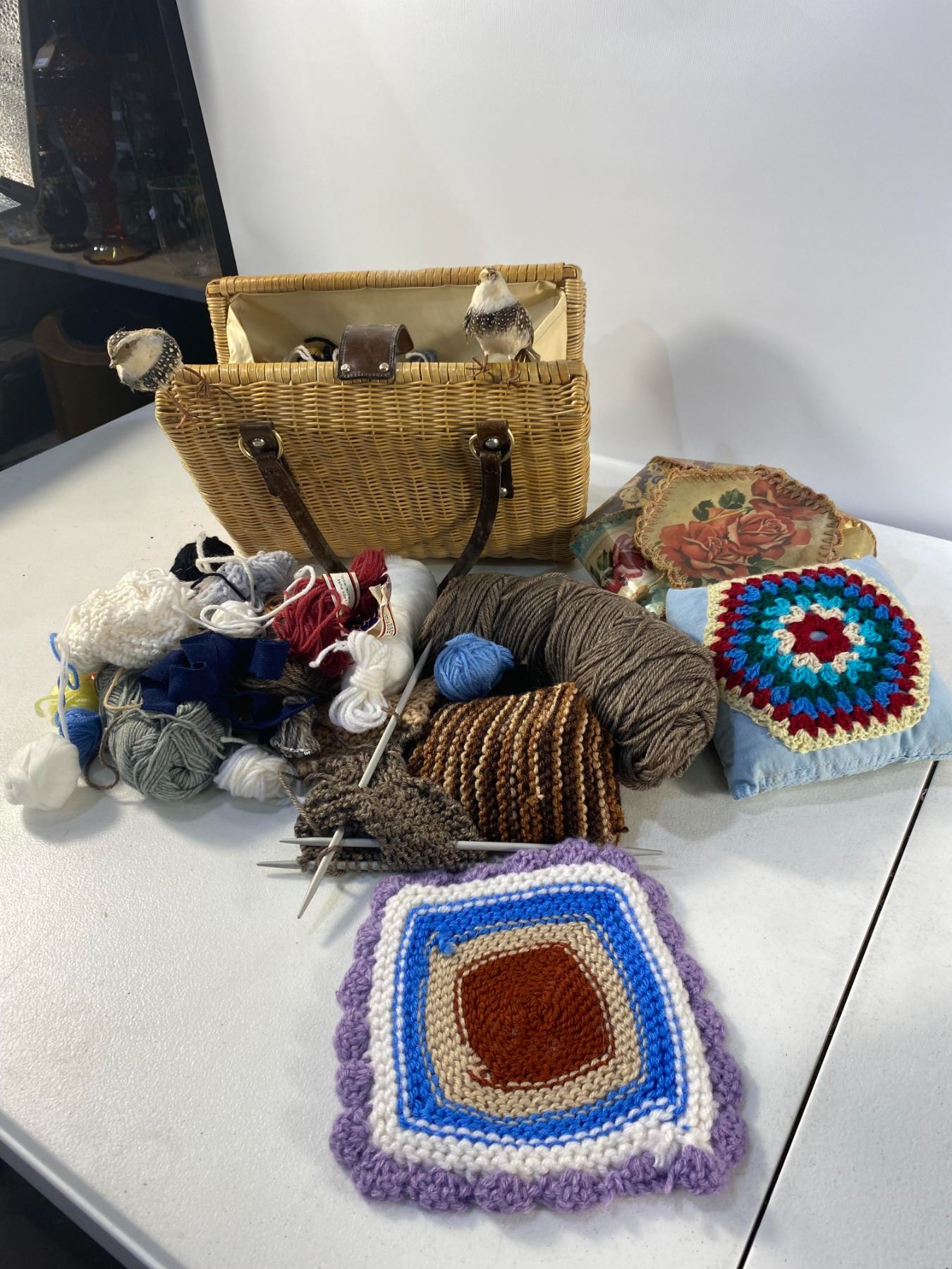 Mixed crafting assortment including wicker basket, yarn, knitting needles, and handmade crochet pieces. Approx. mid late 20th century. Condition: general wear from use.