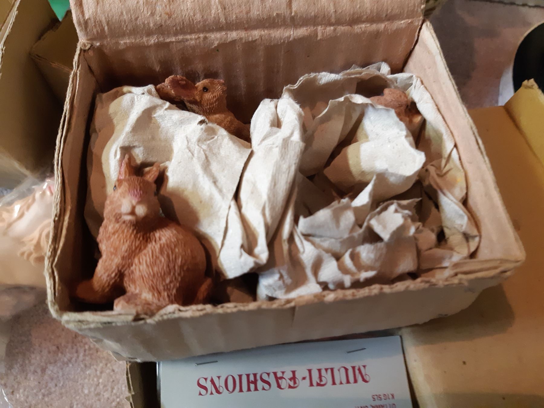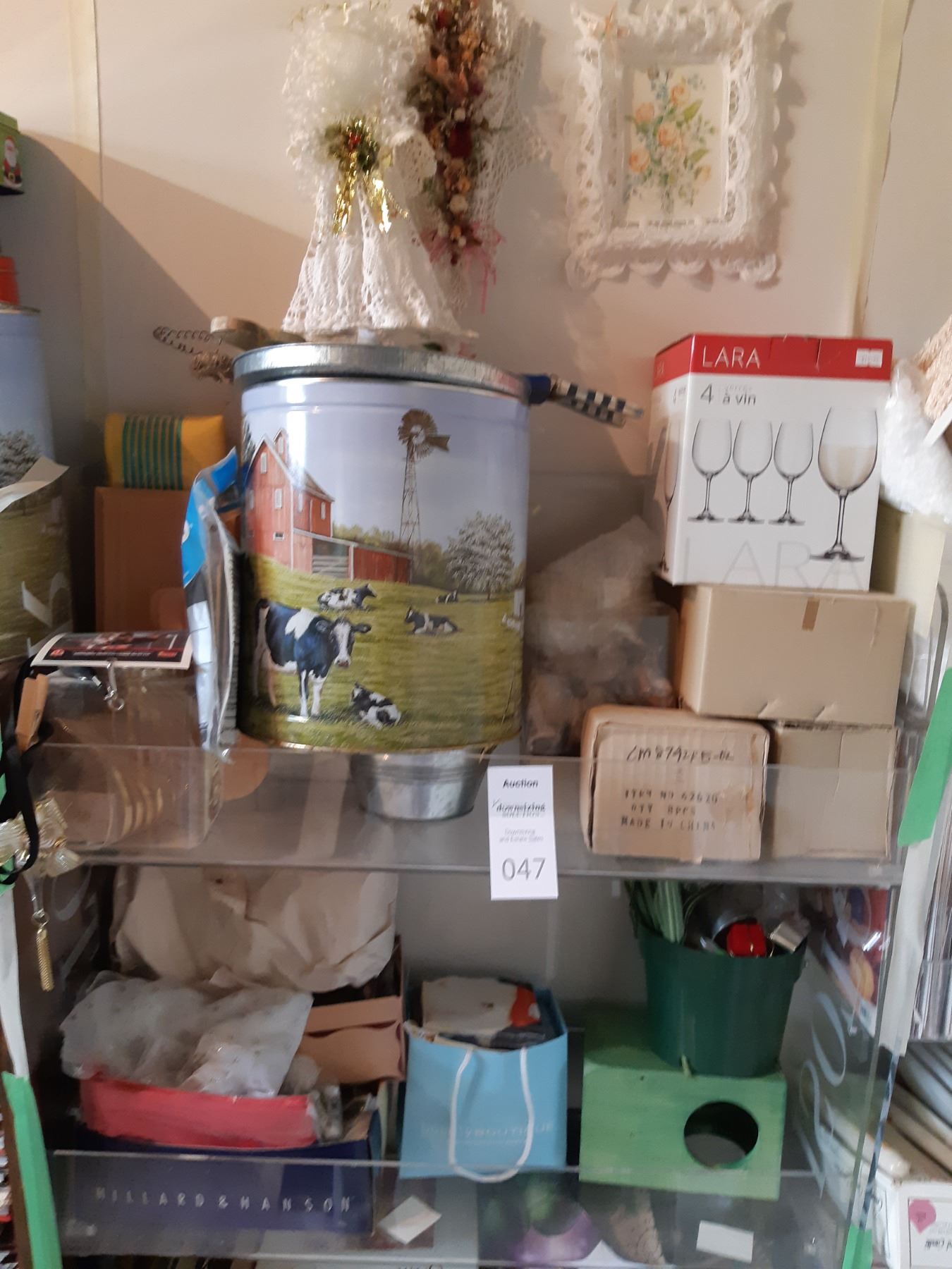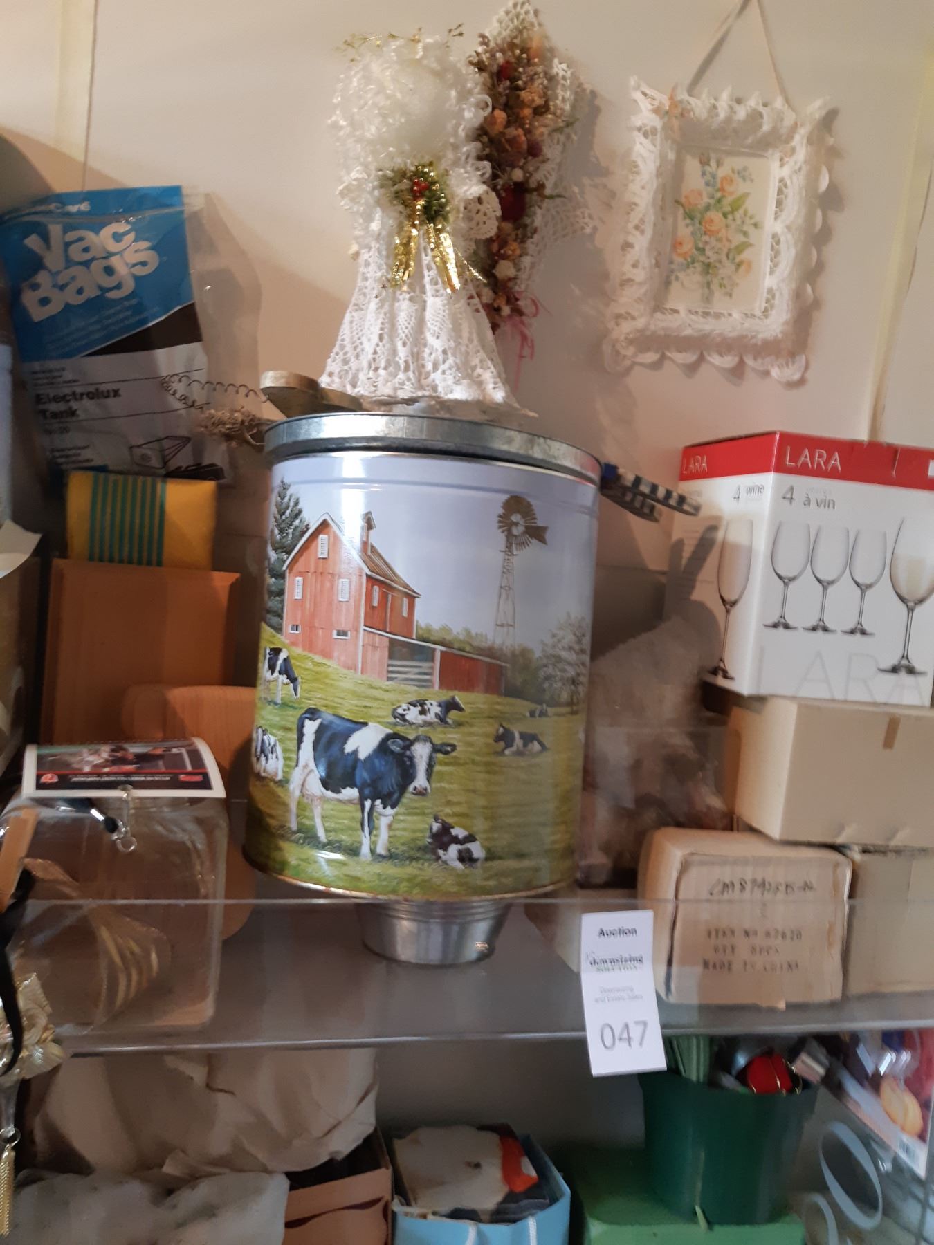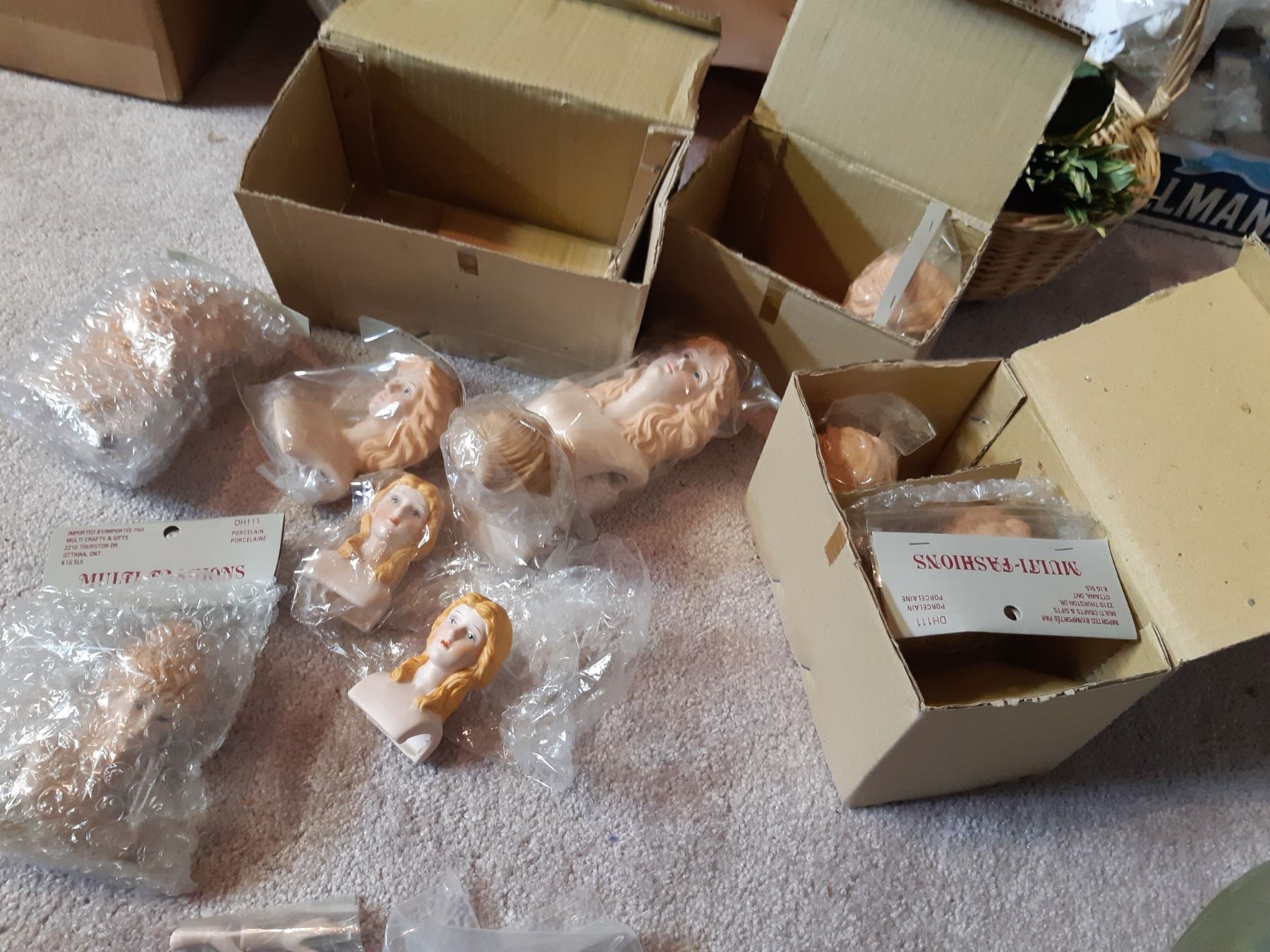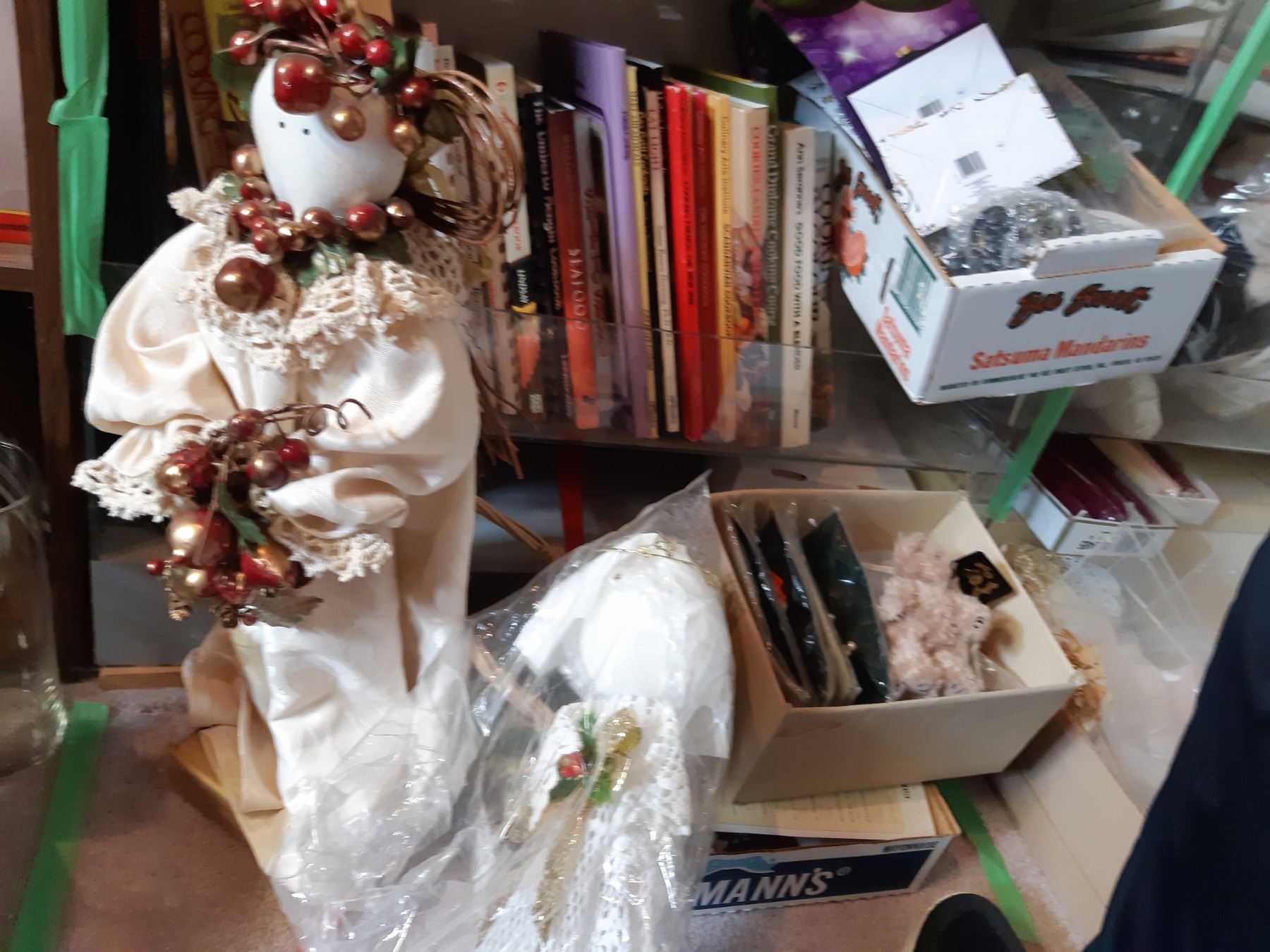 Craft items, ceramic heads, bunnies, tin, angel 24 tall, lace frames, Xmas lights, wine glasses, pickup 11:30