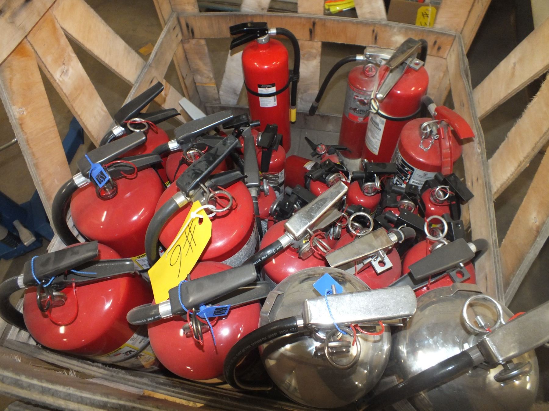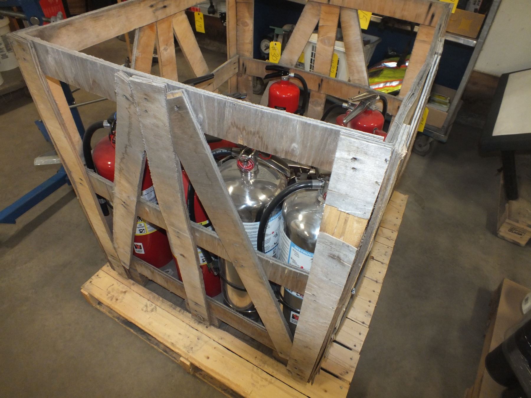 Crate Of Fire Extinguisher's, you get approx 30 pcs, assorted sizes, 5, 10, 15, 20lb tanks...most need a charge...