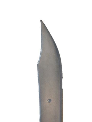 Silver resin sword with brown cord wrapped grips and intricate flame design on the end of the sword near the grip, flame design also on the top of the handle, tip of sword slightly bent.(36x4)