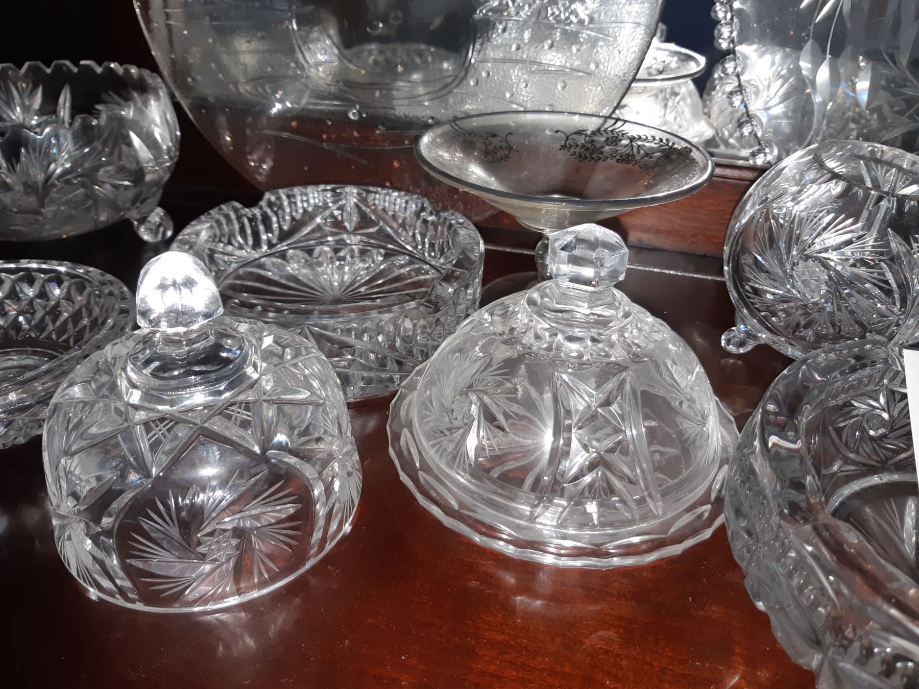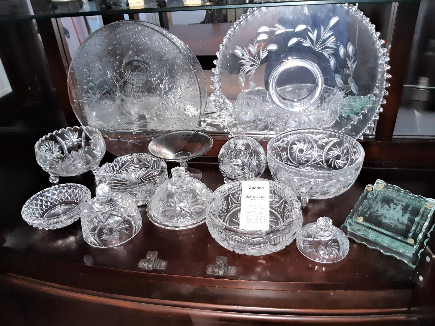 Assortment of crystal and glass servingware. 16" round serving plate with beaded edge has place in the middle for sauce dish. 6" and 5" crystal bowls and more. Pickup at 9 am