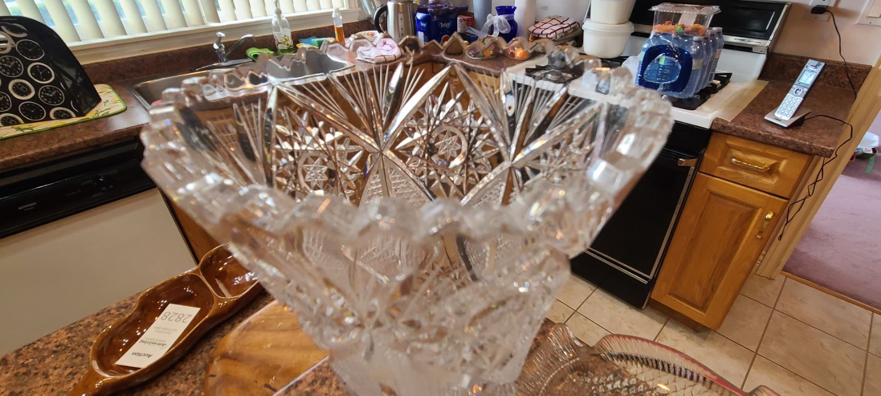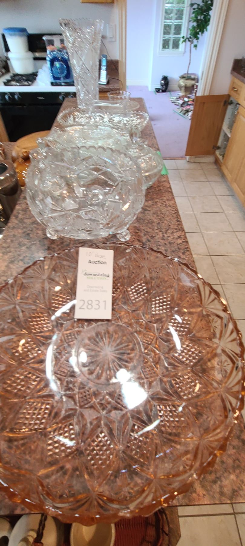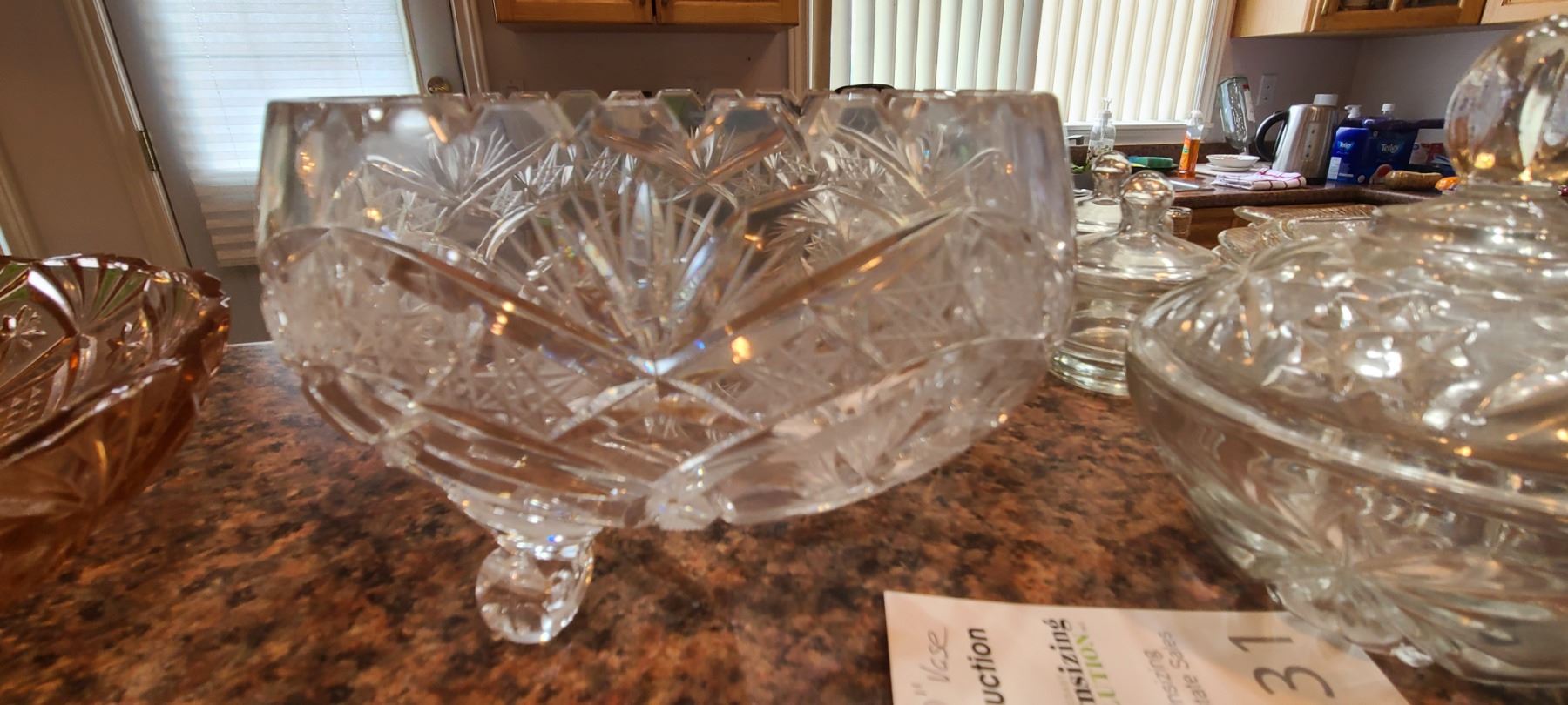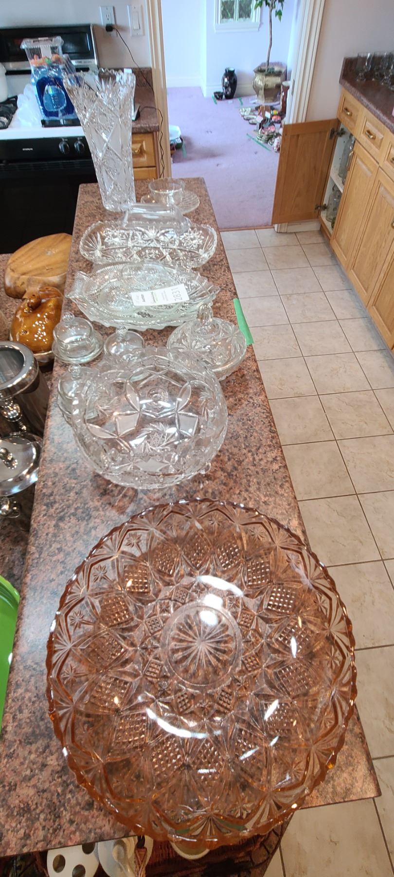 Pink cut glass bowl 16". Crystal vase 10", Footed crystal bowl 8x8x4" and more. Bring packing and pickup at 9 am