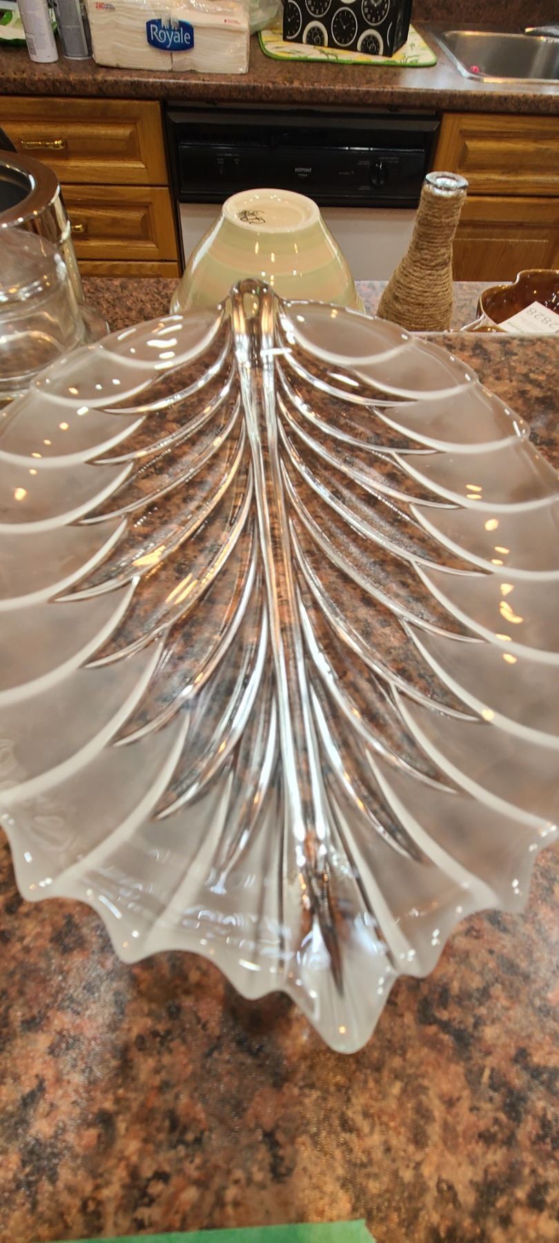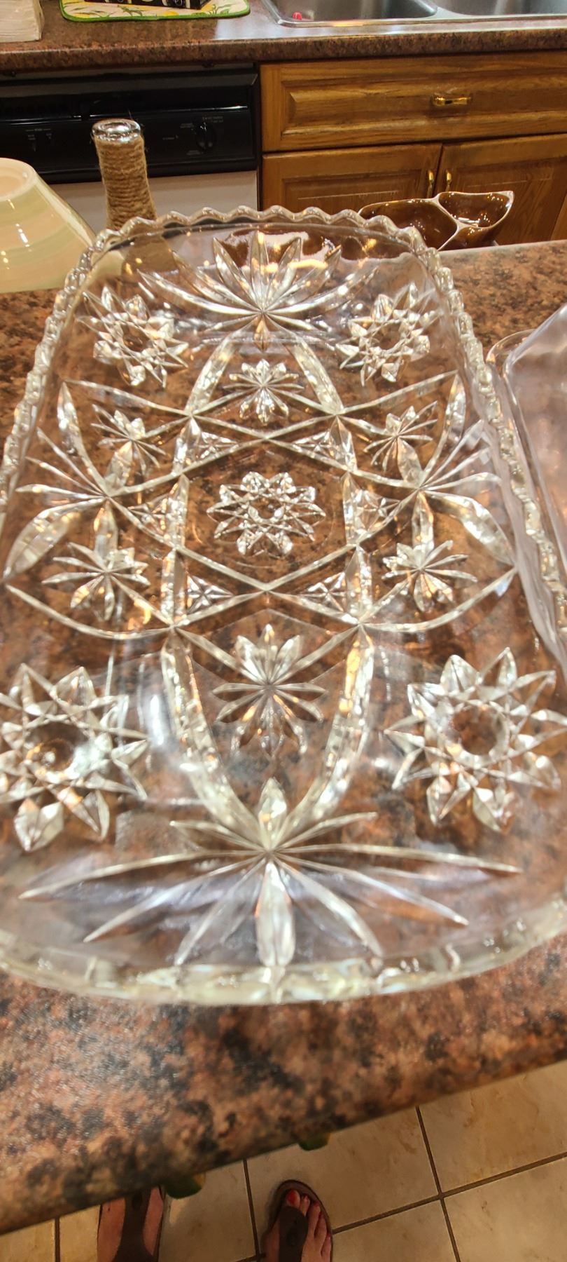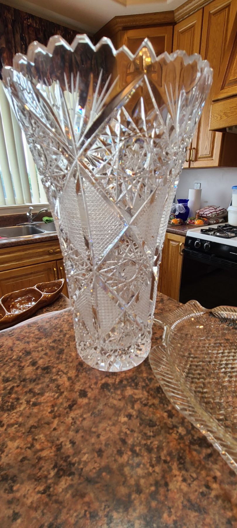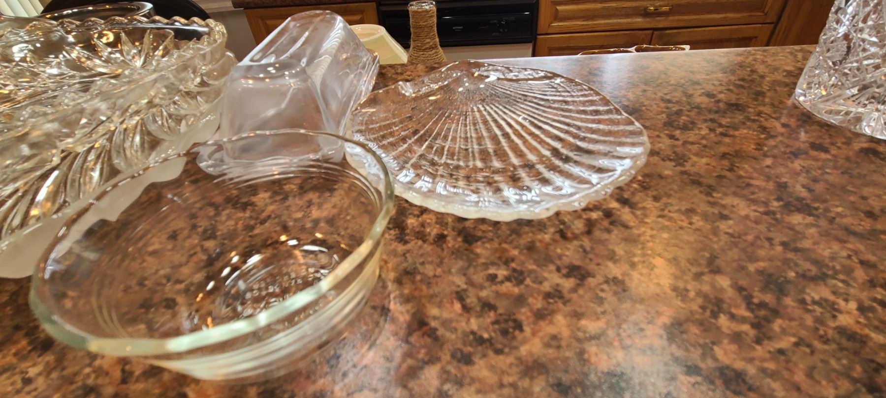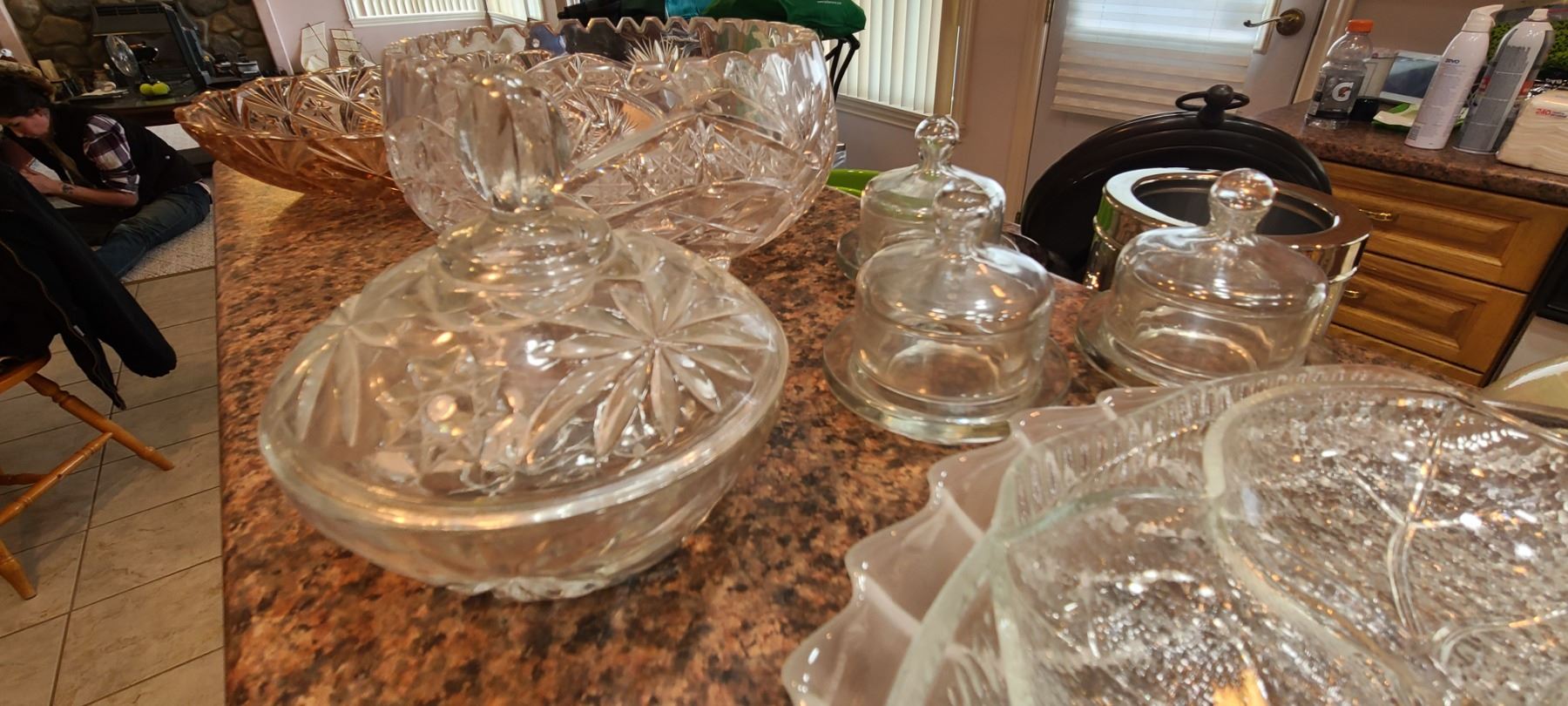 Pink cut glass bowl 16". Crystal vase 10", Footed crystal bowl 8x8x4" and more. Bring packing and pickup at 9 am