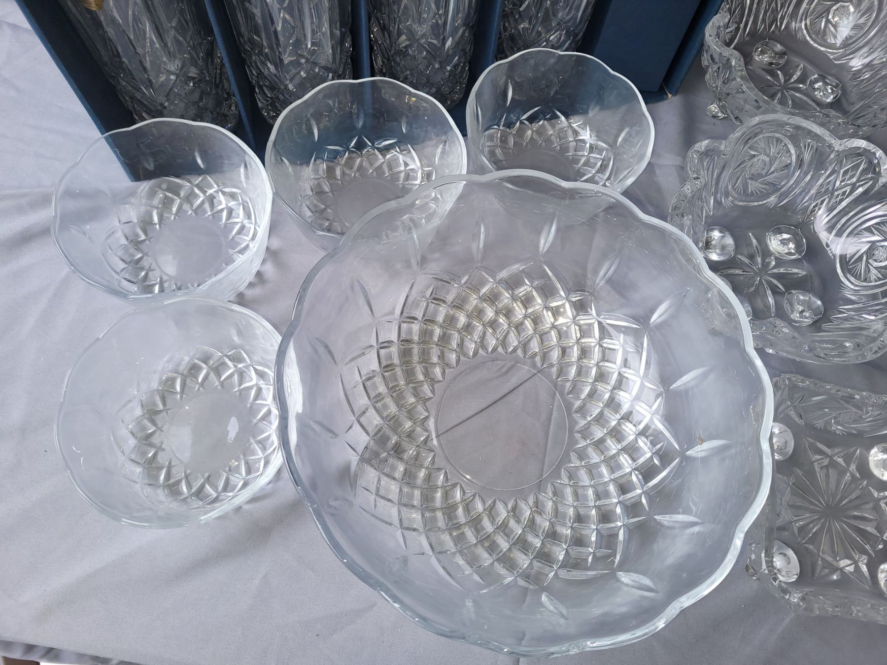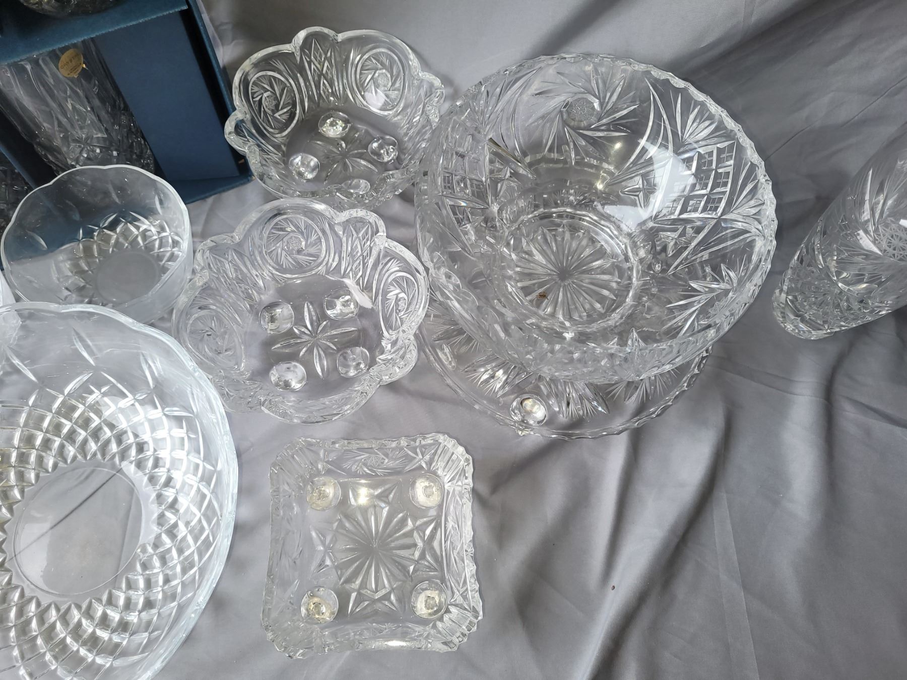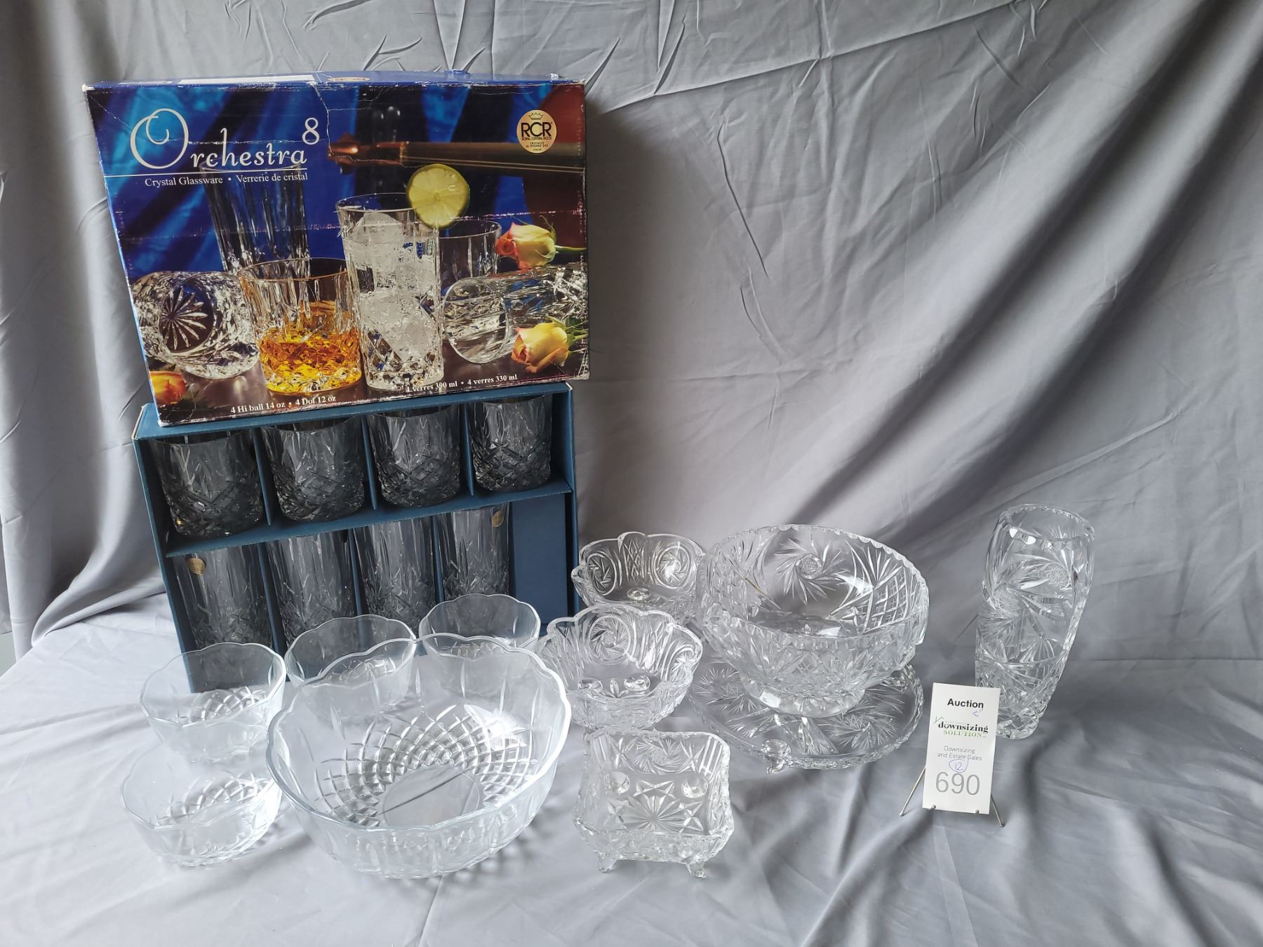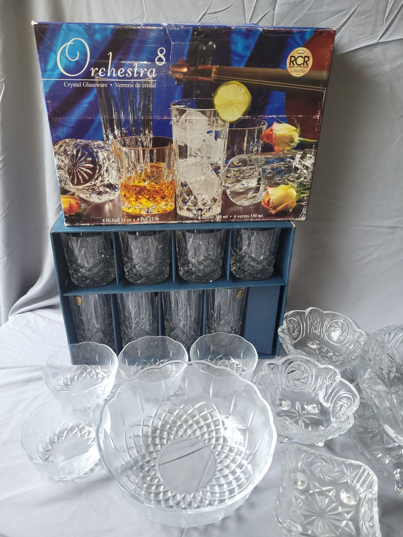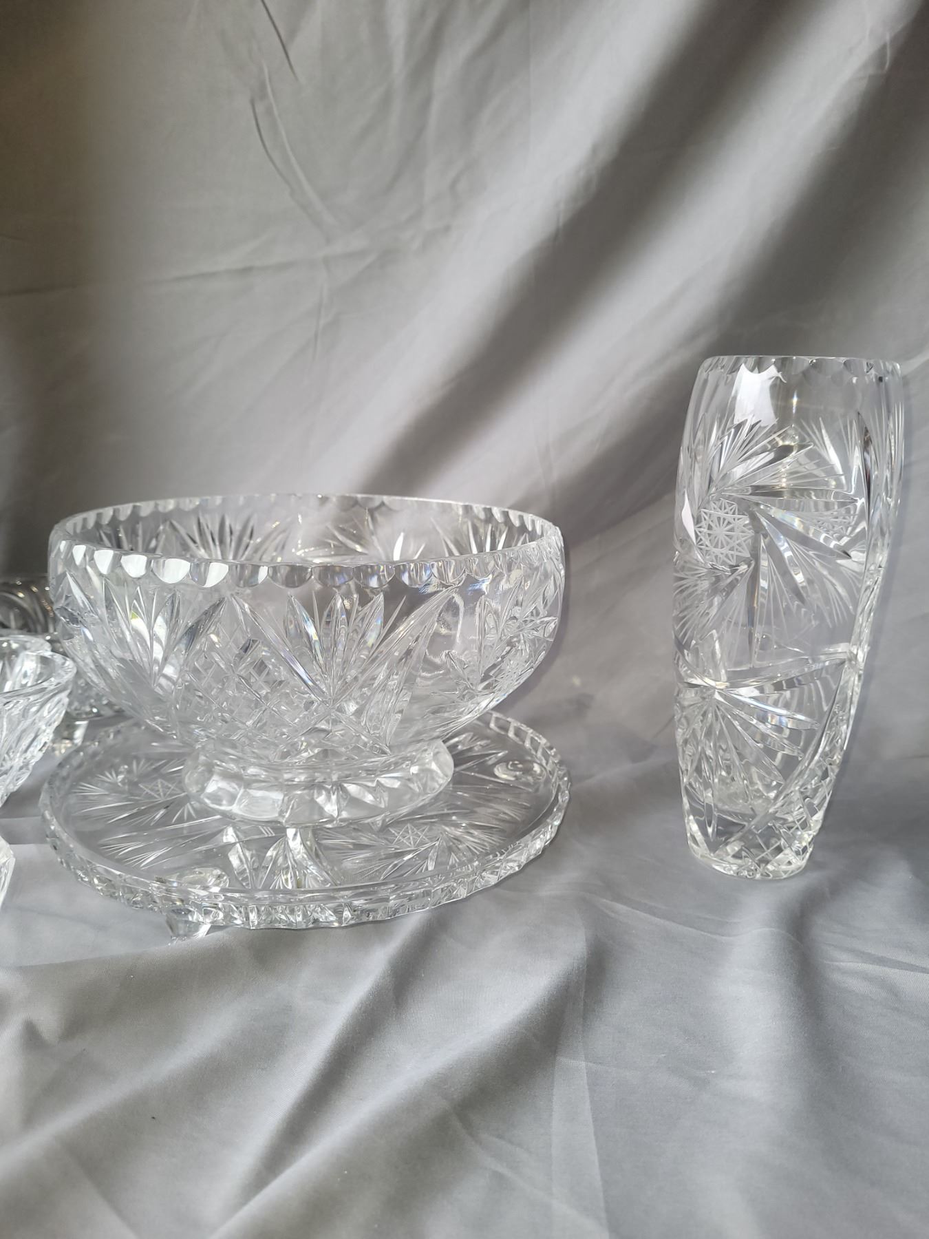 8 piece Orchestra crystal glassware.Glass salad with 4 small bowls. 8" crystal vase. Crystal serving bowl snd dish. Footed crysal cake plate has chip on rim. pickup at 9 am