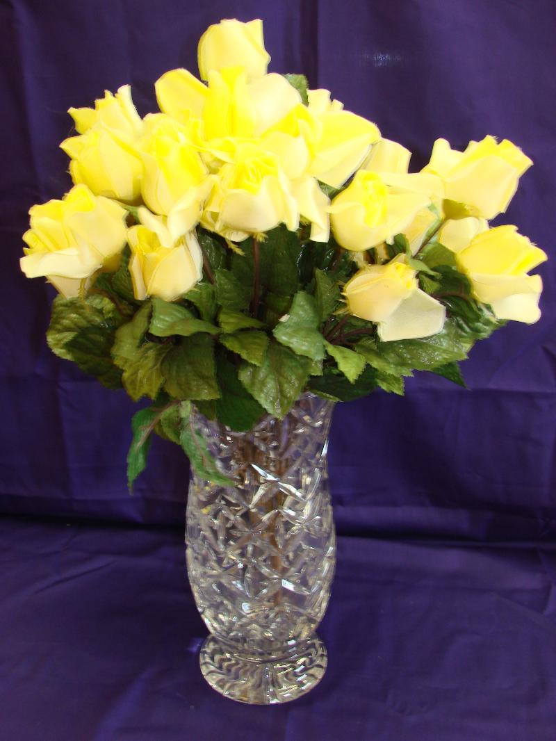 Crystal vase w/yellow silk roses, vase is apprx. 12" tall