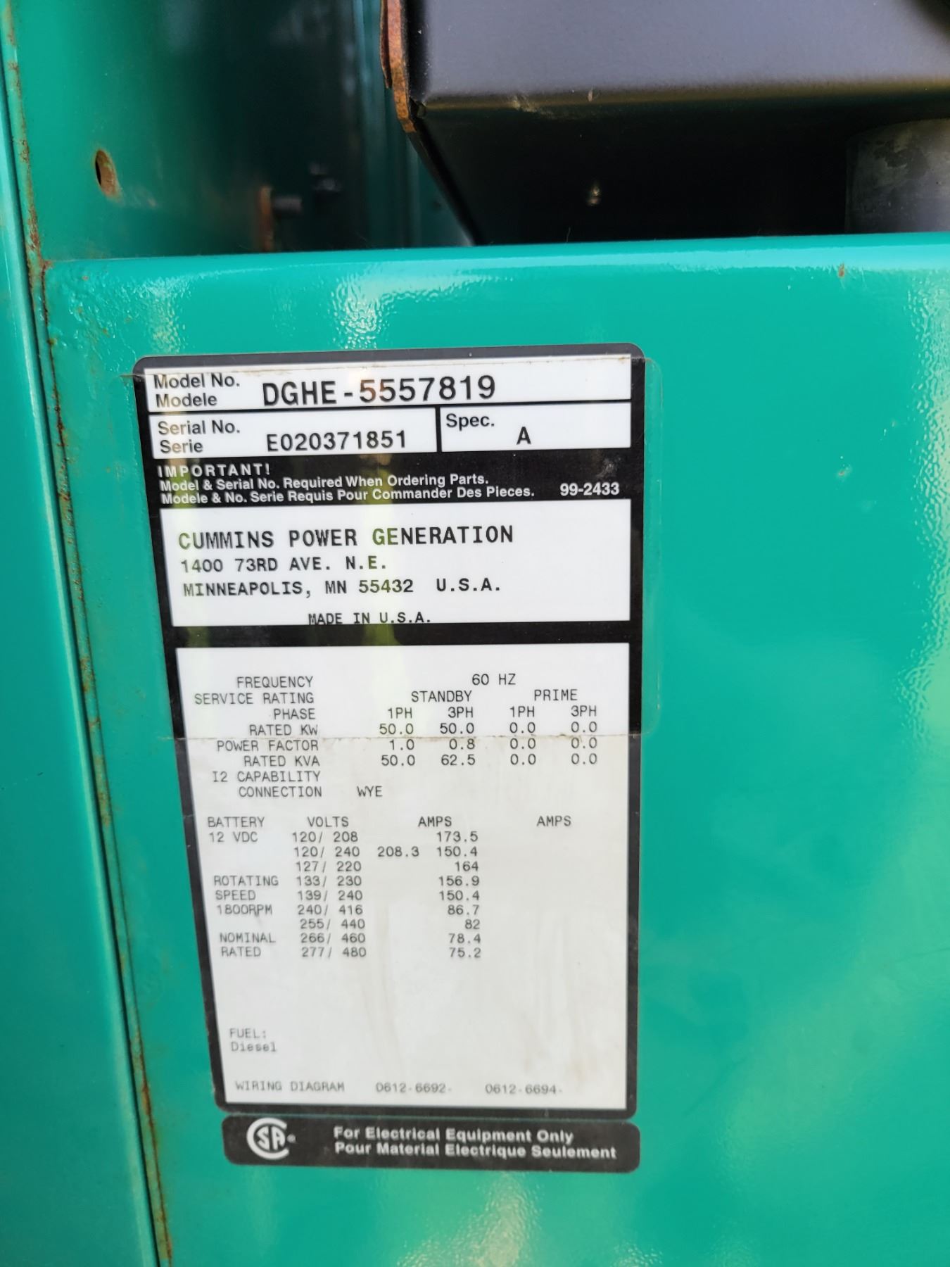 Cummins Power Generation Quiet Site B33, 4-cyl, diesel, GENSET, 120/208V, Model# DGHE-5557819, SN. E02037851, 40"W x 80"H x 102"L, 50-Kilowatts, Running order