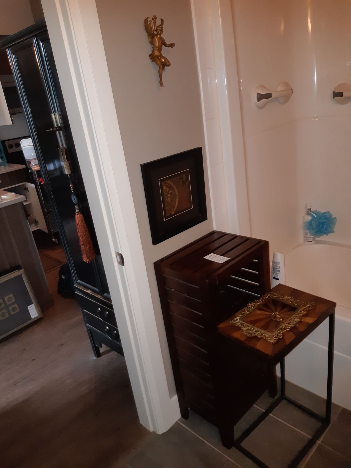 Wood cupboard, 16x12x33, table with inlay, 10x16x26, frame corner broken, angel figurine 9 tall, framed print 13x13. Pickup 11 pm