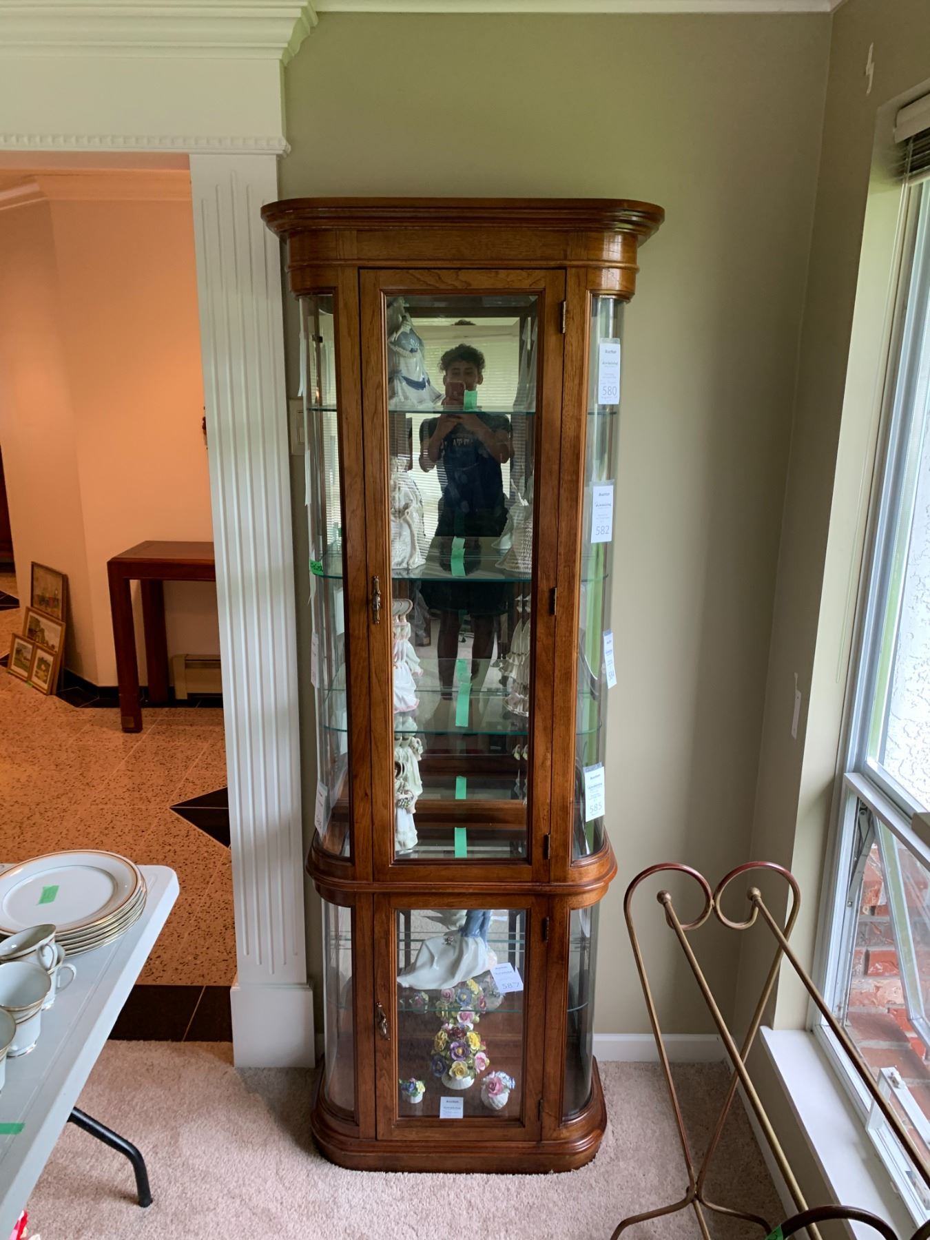 Curio cabinet, 26x13x76, with lights. Very heavy, bring appropriate help to move. Contents not included. Pickup at 11 am, cat. C.