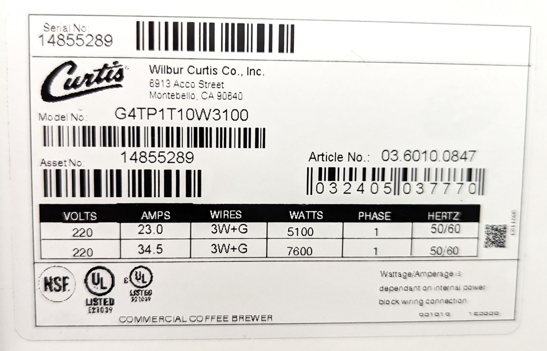[Used, Tested/Working,,] Model G4TP1T10W3100 Serial# 14855289, 11-1/8" x 20-5/8" x 24-3/4", 220V/50-60Hz/1Ph