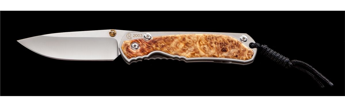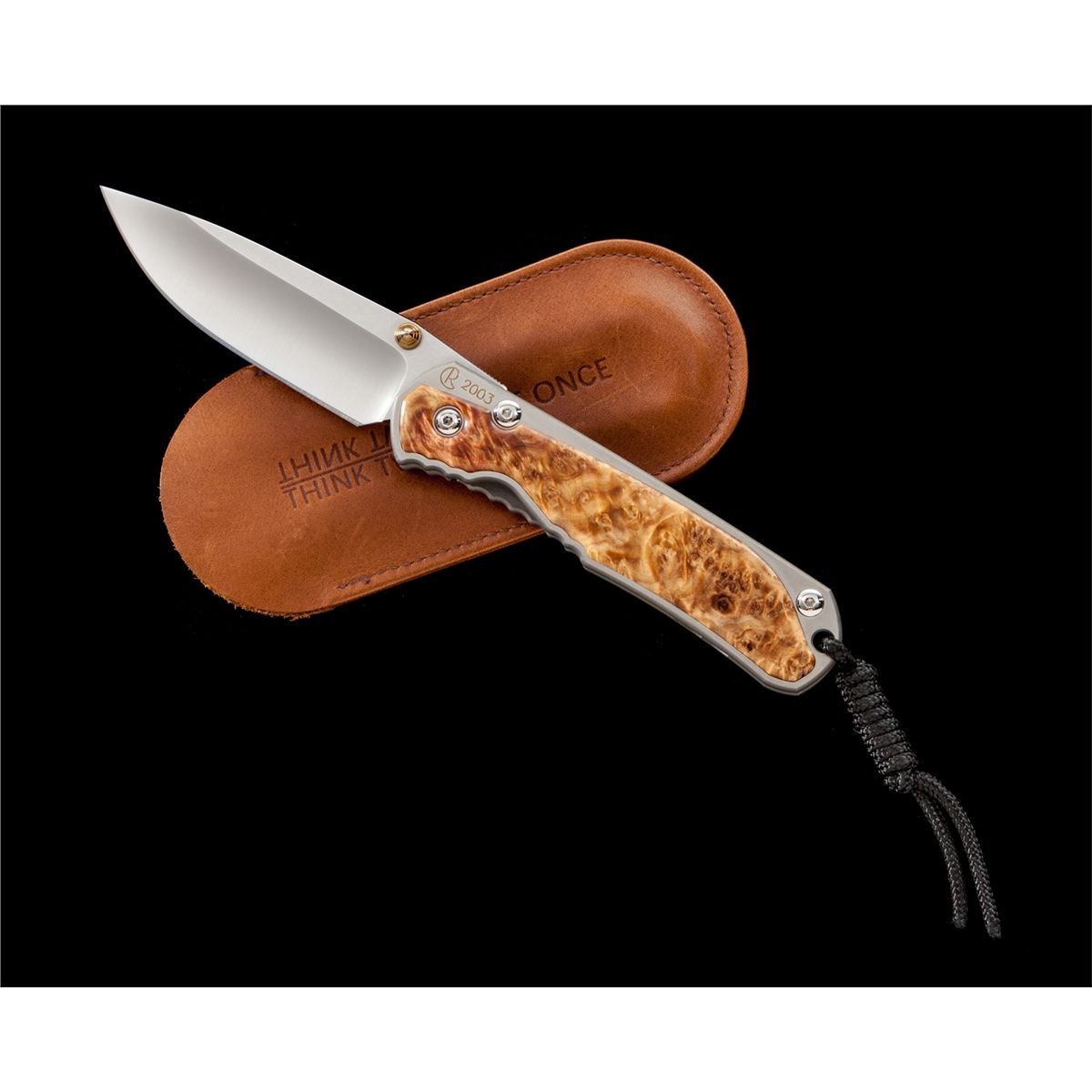 Custom Limited Edition 2003 Chris Reeve Sebenza Folding Knife, 3-1/2'' blade, with an overall closed length of 4-3/4''. The knife is marked ''CR, 2003.'' Titanium handle with Box Elder inlays. With brown leather Chris Reeve ''Think Twice, Cut Once'' case. Condition is excellent and as new, showing no use. With one 3/16'' long shallow scratch on the backside of the titanium handle. A near mint example of a hard to find knife. Est.: $450-$550. (Ernest A. Bryant III estate)