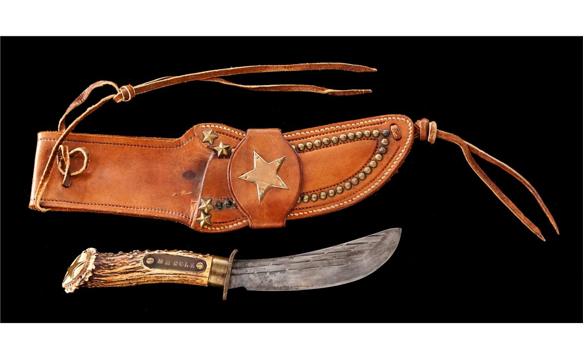 Custom Roebuck Works Skinning Knife, by M.H. Cole, with Certificate of Authenticity, 6'' curved blade with an overall length of approx. 11-1/2''. Brass guard is marked with the initials ''MHC''. Stag handle, with a inlaid brass name plate that reads ''M H COLE.'' Butt of knife with a large inlaid brass star. Tan leather sheath is decorated with 42 brass studs, 4 small stars, 1 large star and the back is stamped ''M H COLE/R BUCK WORKS''. The M.H. Cole authentication certificate is on Cole letterhead, signed by Cole, dated Dec. 31, 1991 and is notarized. The certificate states that it was made Circa 1965 and in detail describes the knife and includes a photo that is partially stamped through by the public notary. Included is a picture of Cole and second letter discussing Cole's books. Condition is very good. Blade with signs of use and additional sharpening. Brass parts with even toning. Leather sheath with tight stitching and seams. Est.: $