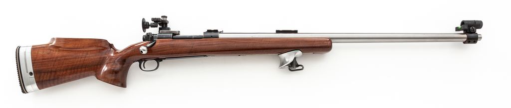 Custom Winchester Model 70 Bolt Action Target Rifle, #284899, .308 cal., 28'' medium-weight stainless steel target free-floating barrel with glass-bedded stock to blue frame, walnut target cheekpiece stock with adjustable aluminum buttplate and handstop; fine English-made rear sight marked MK.IV-403, and modern spirit level globe front sight. Top of receiver has been fitted with a case hardened stripper clip guide, as well as a two-piece dovetailed scope mount. Follower, ramp and bolt are polished. Condition is excellent as modified. Stock shows just the lightest marks from range use with small loss behind bolt handle. One-stage trigger is light and crisp. Finely grooved bore is mirror bright. Est.: $1,200-$1,800. (Modern)