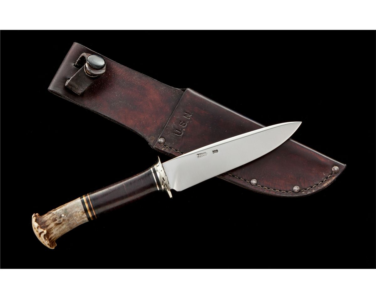 Custom Handmade William Scagel Small Game/Bird Knife, 4-1/2'' blade is marked ''W.SCAGEL/HANDMADE'' and ''USA.'' The reverse is marked with the trademark Scagel ''Kris'' knife. The overall length is Nickel silver guard, stacked leather washer handle with nickel silver, brass, and copper inserts. Pinned crown stag pommel. Dark leather sheath is stamped ''U.S.N.'' with five small rivets and smooth black button at the keeper strap. The sheath is a modern replacement but of the same style that might have been original to this knife. Similar to the sheath on page 62 of the Scagel Handmade Book. Condition is excellent as cleaned, nickel silver guard with small imperfections to the top side. Leather handle with signs of light wear. Each knife that Scagel made was done by hand without the use of modern tools such as a grinder, etc.. A high quality and hard to find knife. Est: $9,500-$12,000.