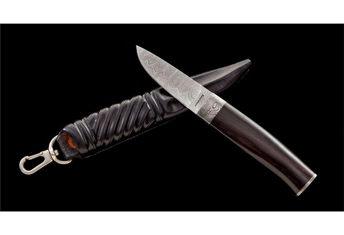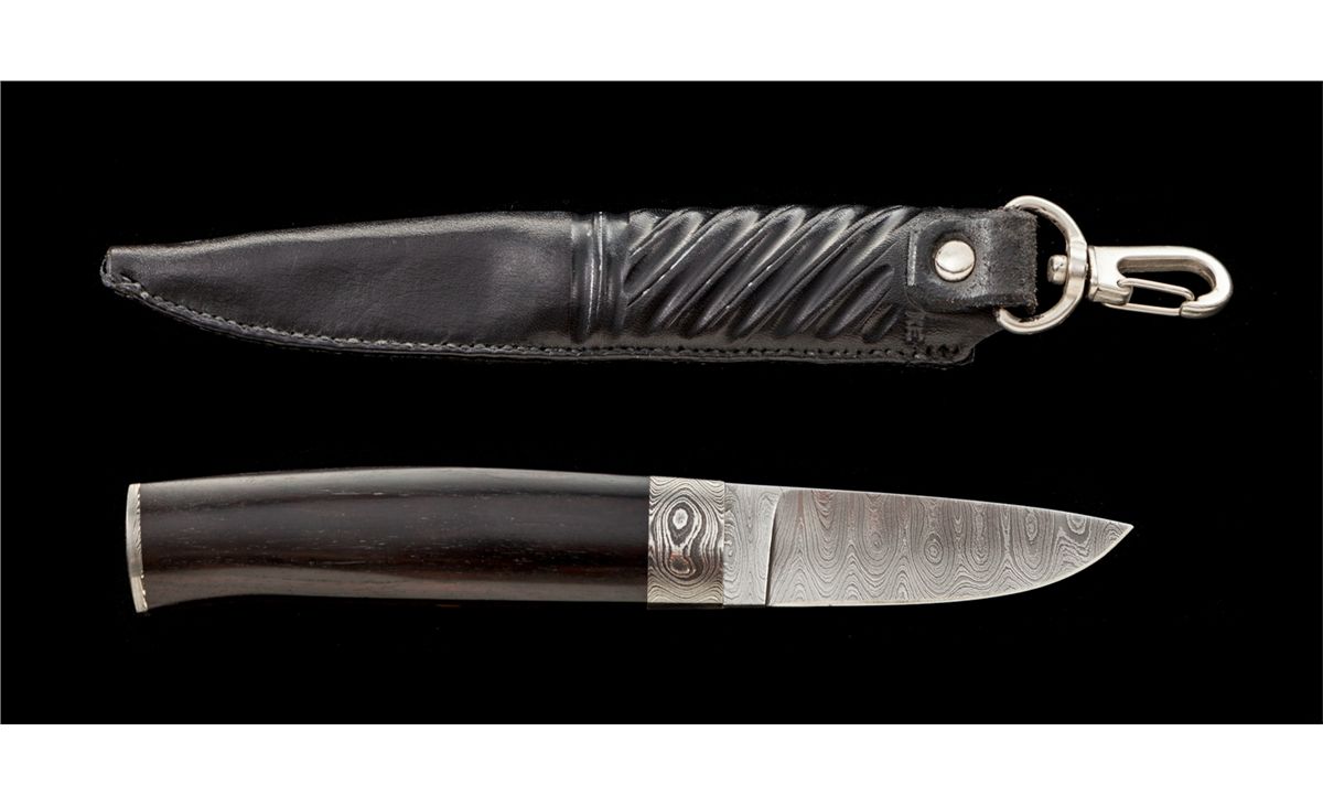 Custom made Damascus Blade Knife, by Kaj Embretsen, (Edsbyn, Sweden.) Damascus steel blade measures 2-3/4'' and is marked ''Embretsen.'' Overall length is 6-3/4''. Ebony wood handle, with Damascus steel bolster and pommel. With a form fitted leather sheath with the reverse stamped ''KE''. Condition is excellent and as new, showing no use. A nice knife by a highly sought after and respected European knife maker. Est.: $500-$700. (Ernest A. Bryant III estate)