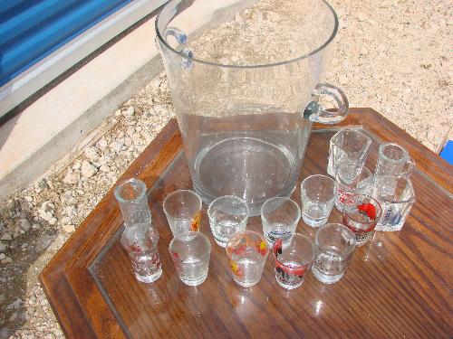 Crystal ice bucket w/apprx. 15 various shot glasses