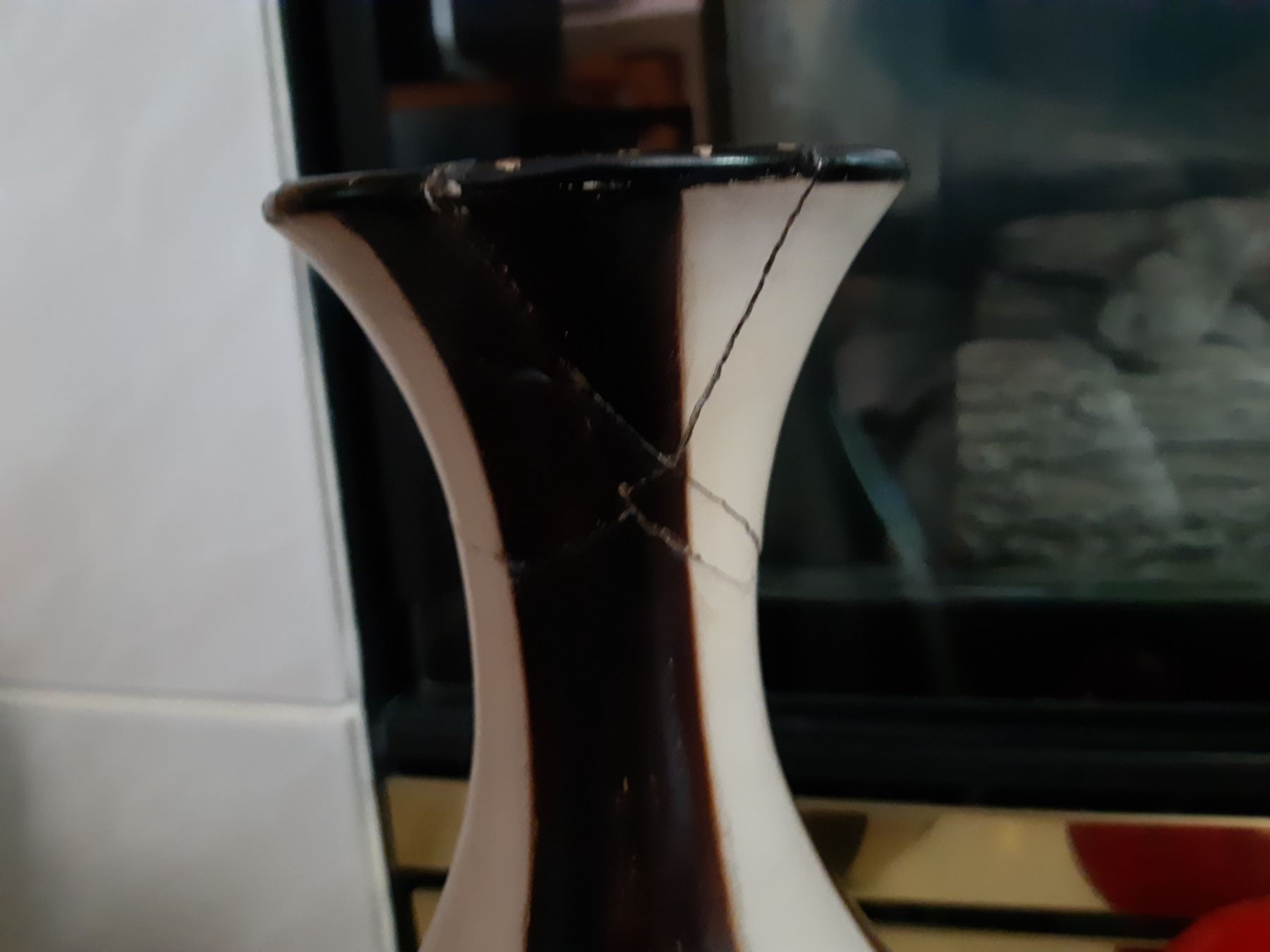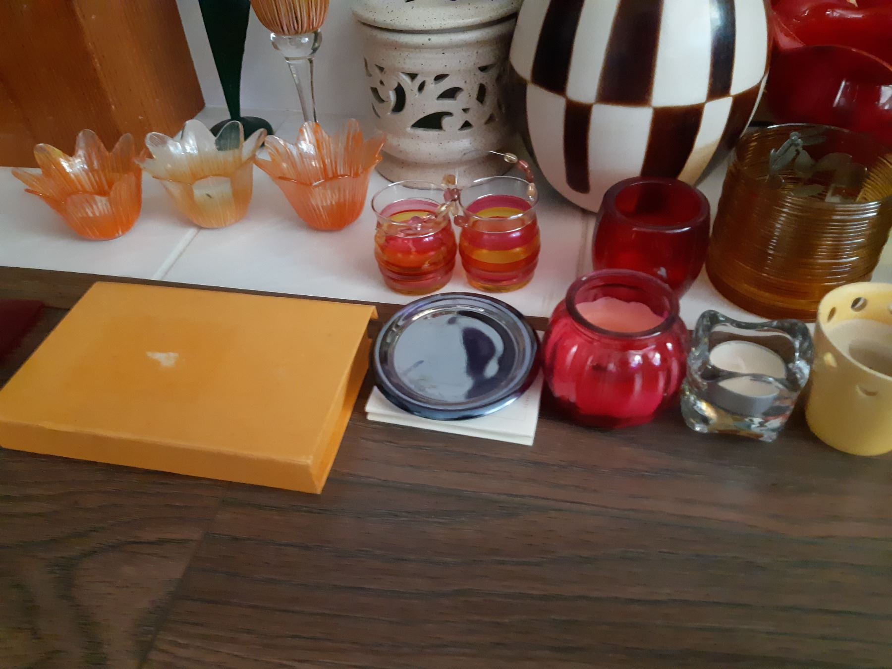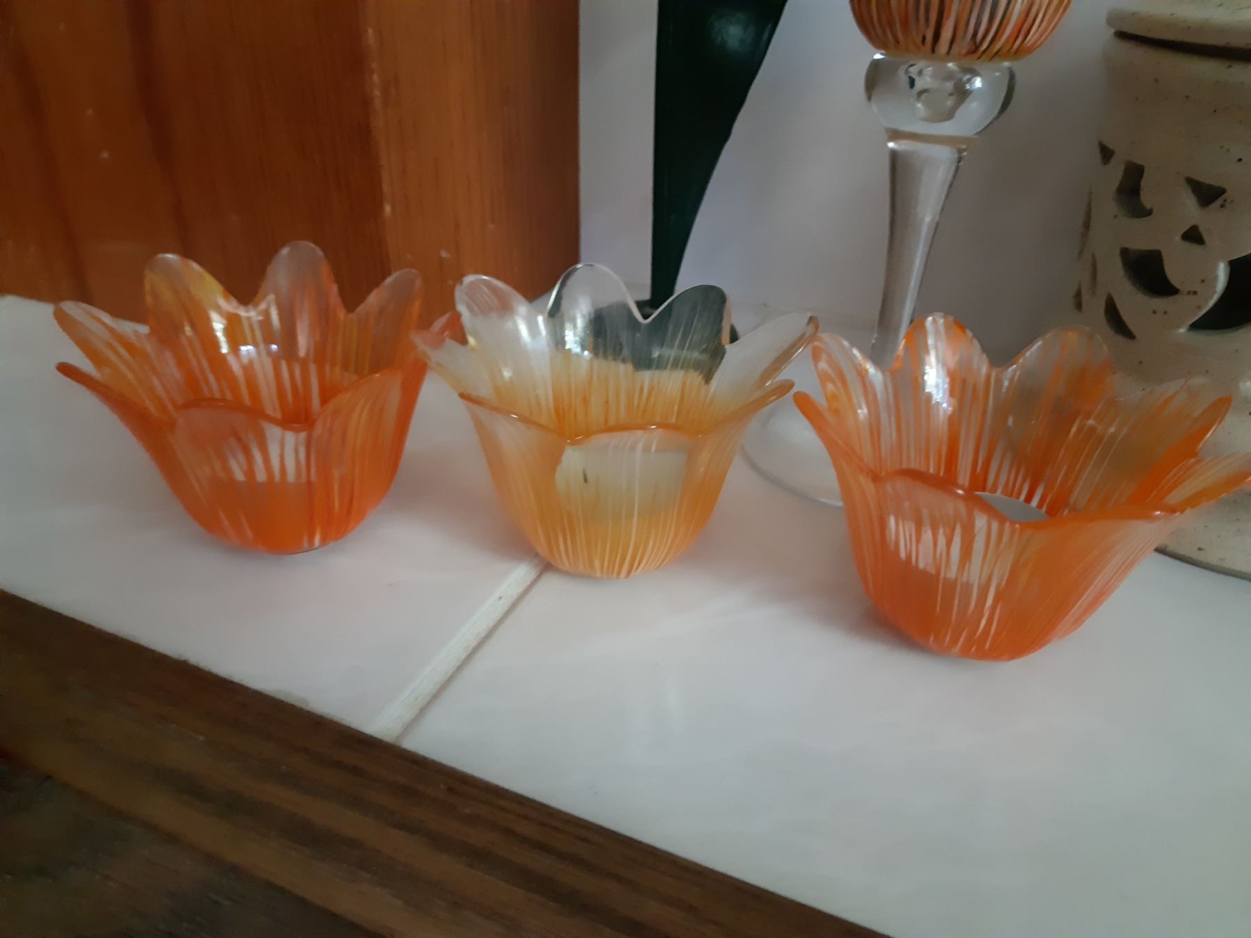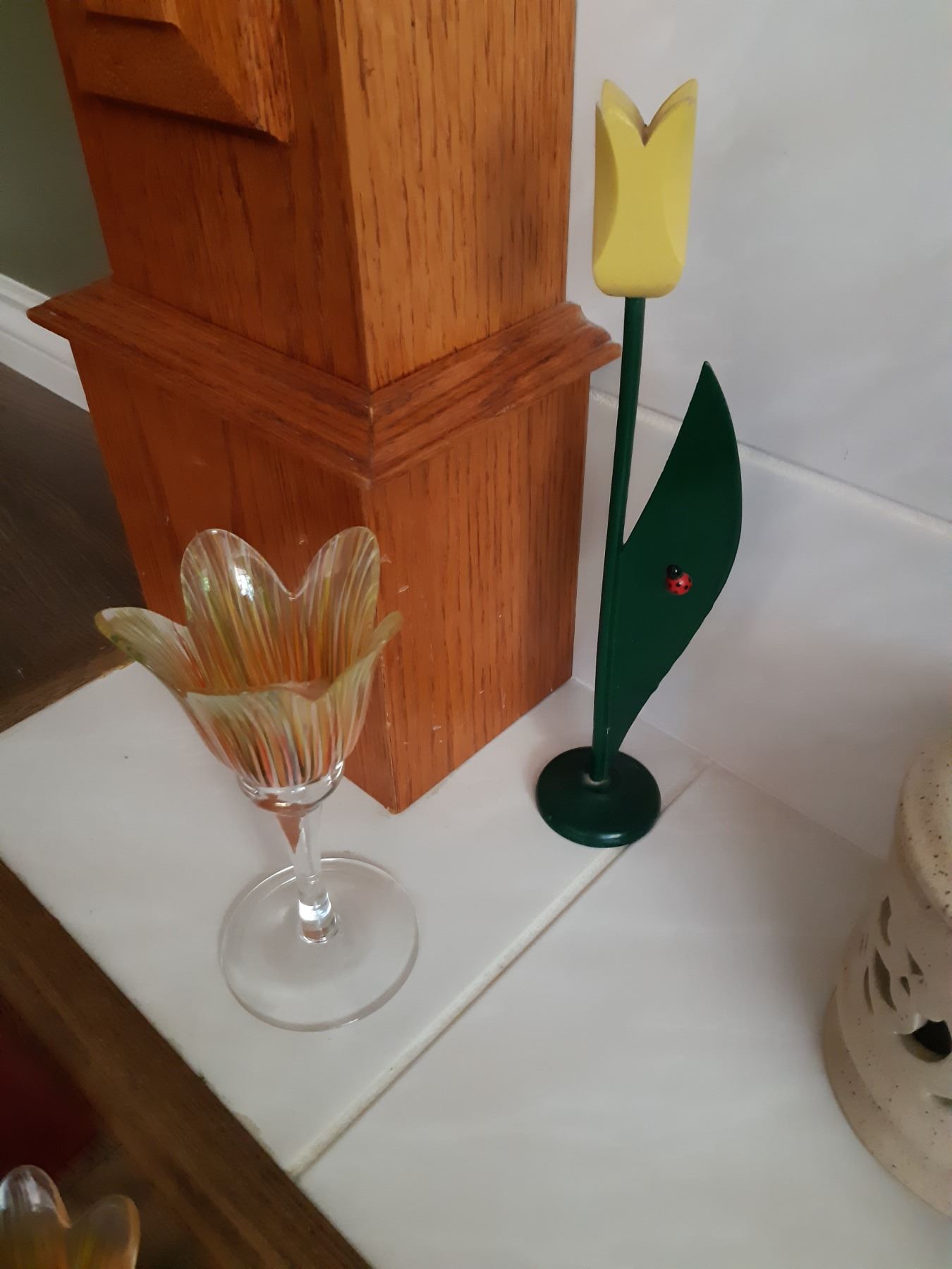 Assortment of decorative items, note the white and brown vase has been repaired. Glass flower candle holders, and more. Bring packing material and pickup at 9 am