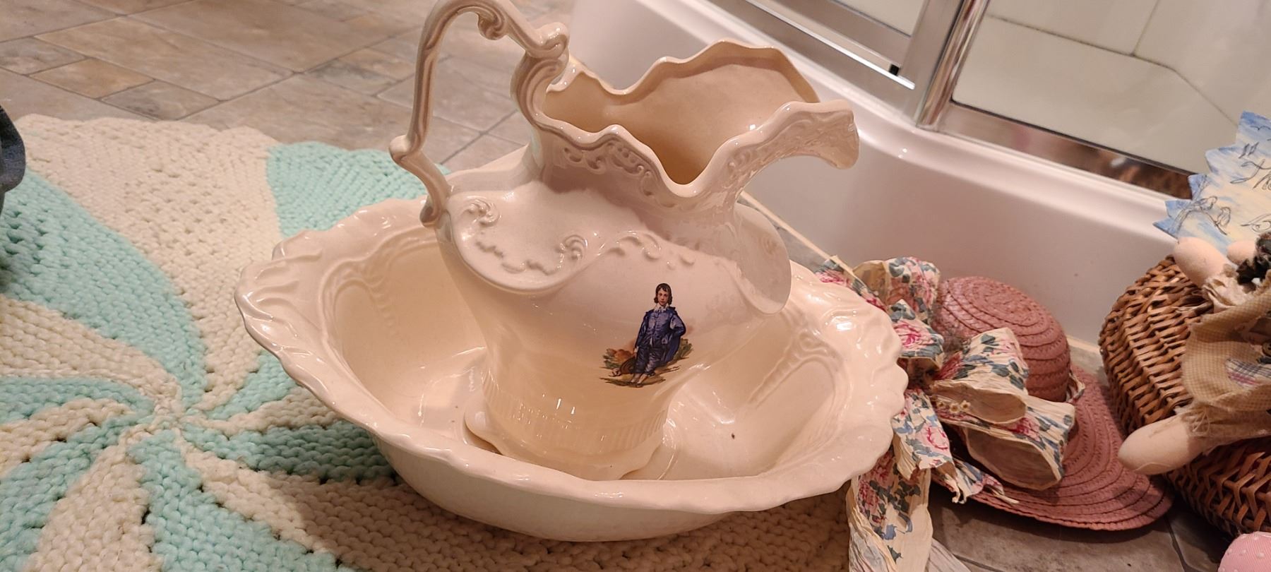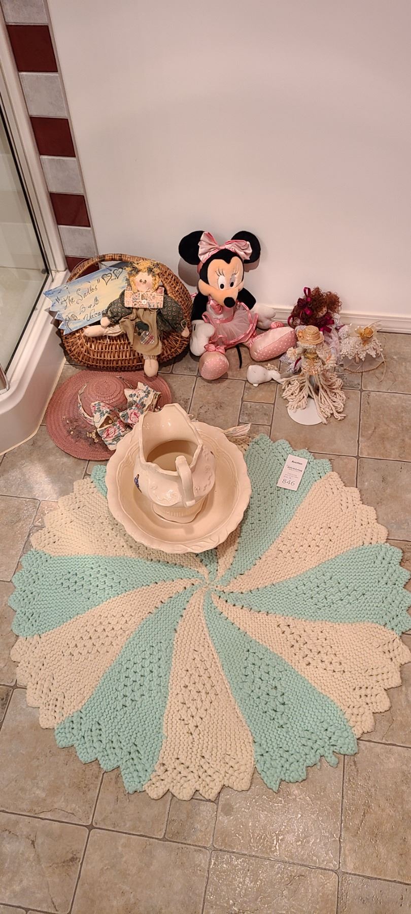 Round crochet table clothe, water pitcure and bowl plus decorative items. Bring wrapping and pickup at 9 am