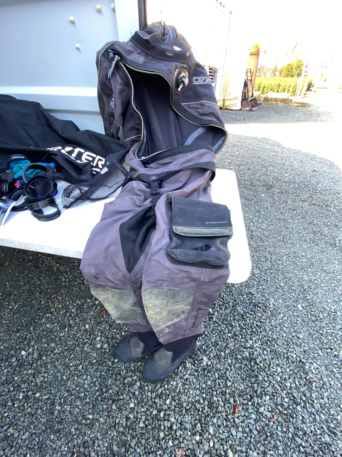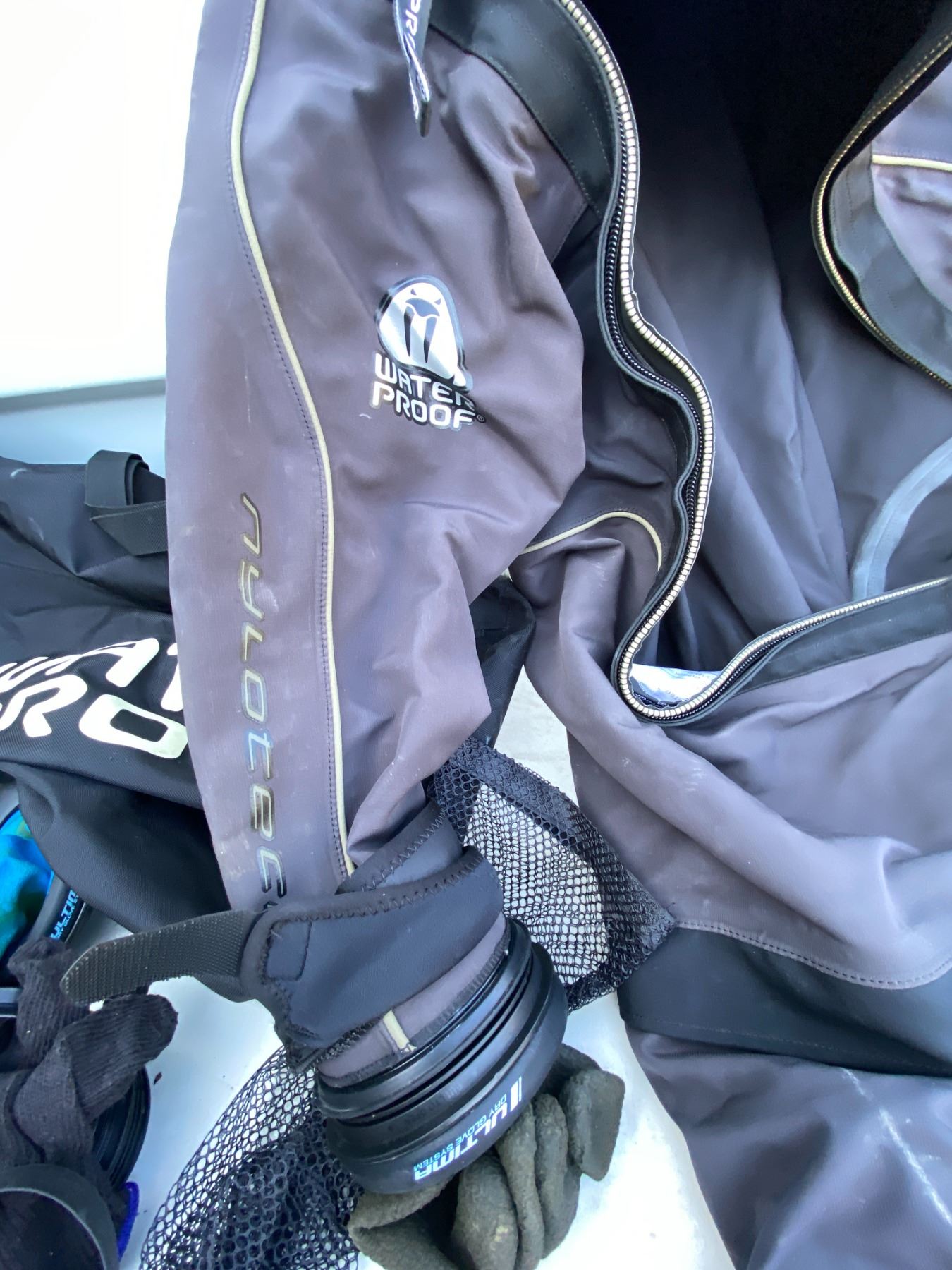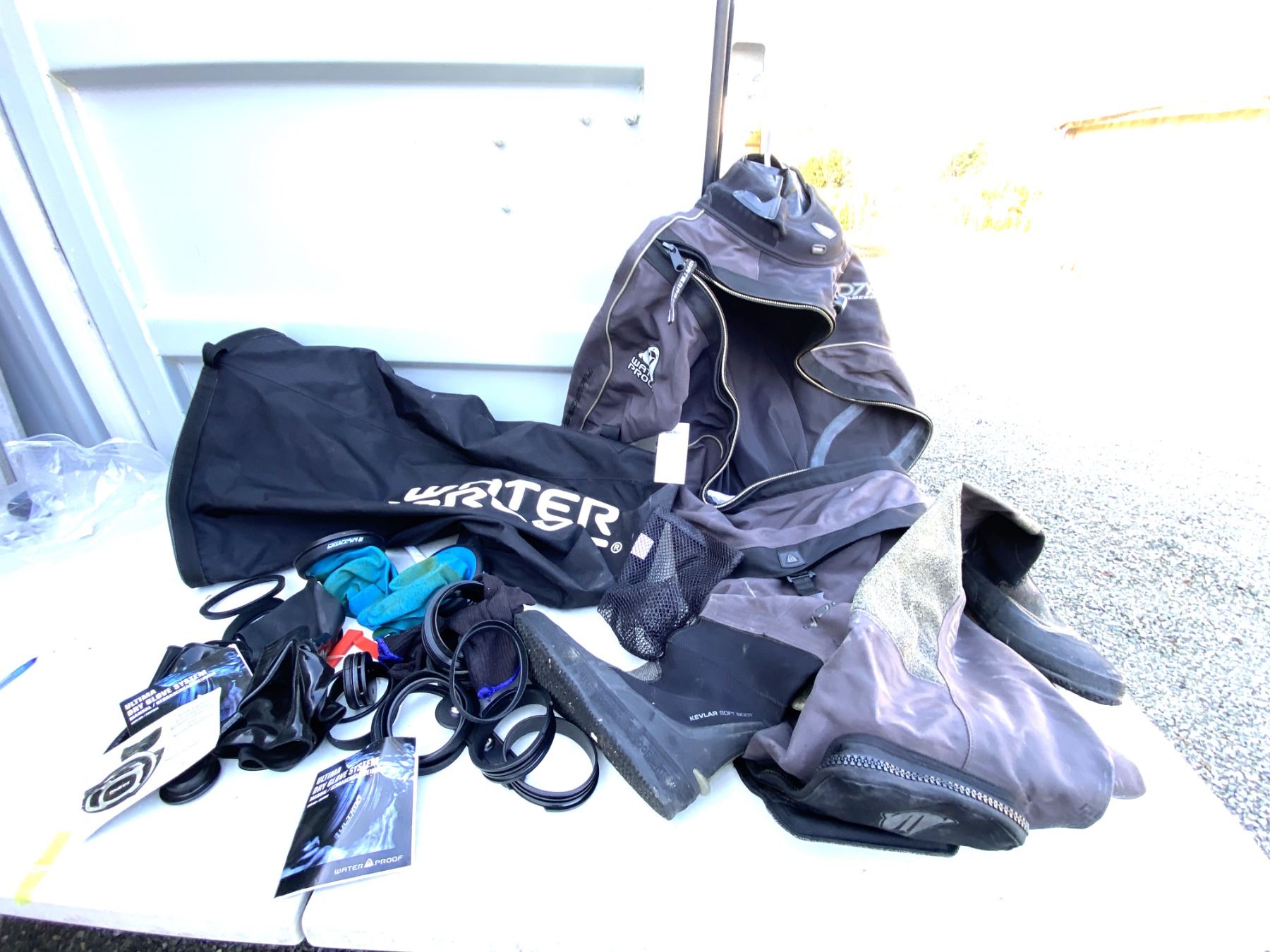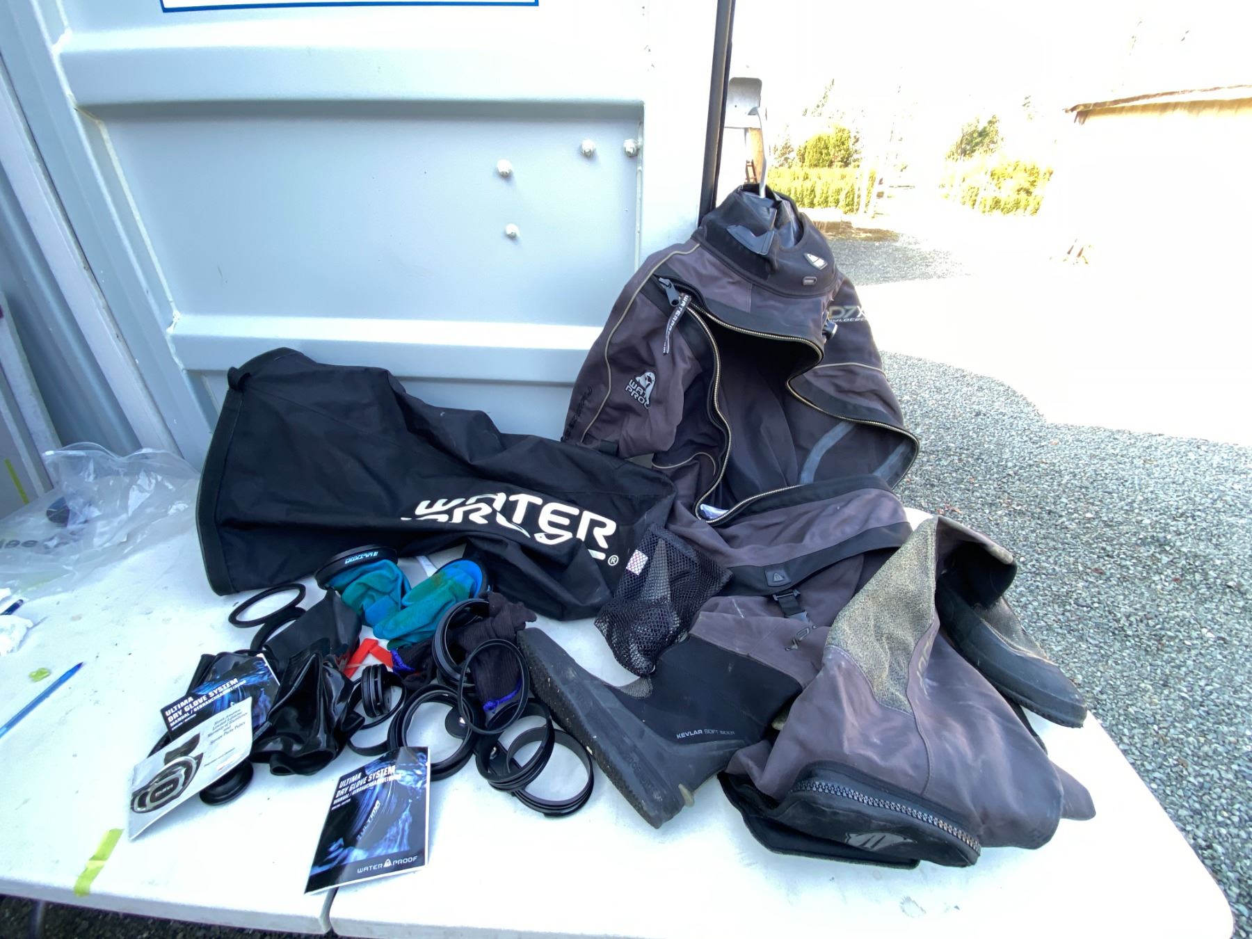 Water sport bag includes, Waterproof D7X nylotech Dry Suit with dry glove cuffs installed. Size Medium-Large, Spare cuffs and gloves. Pickup at 11 am