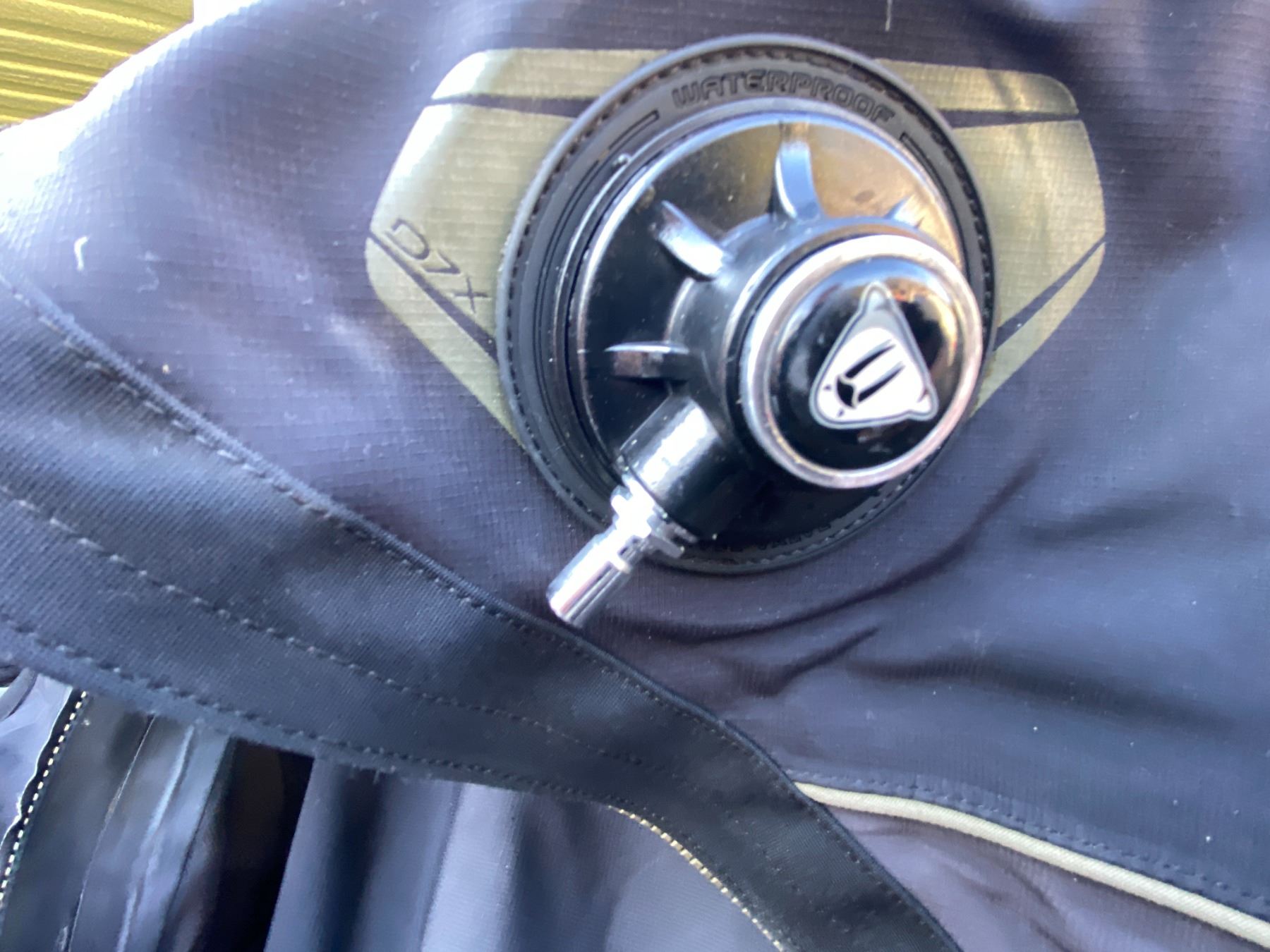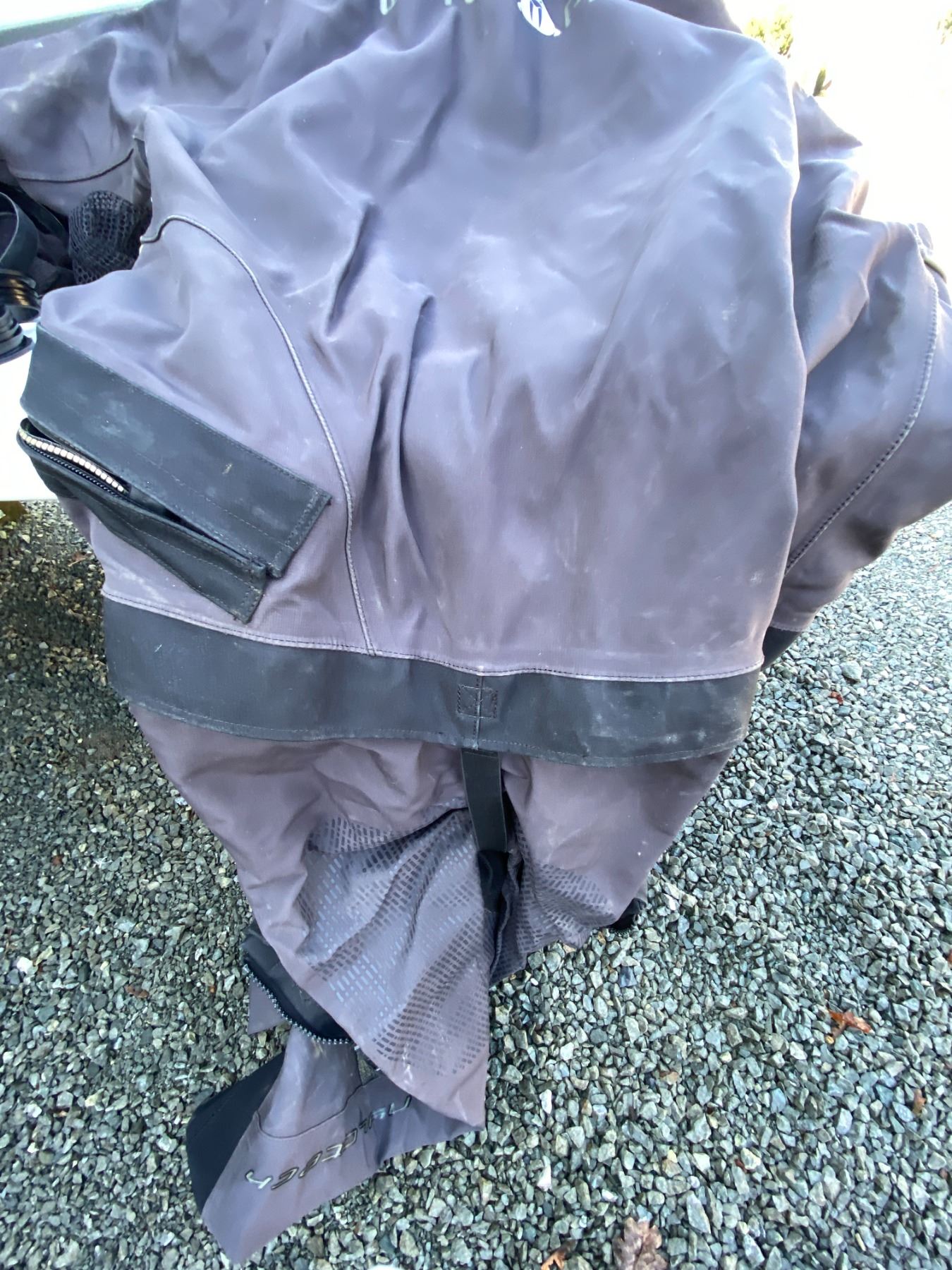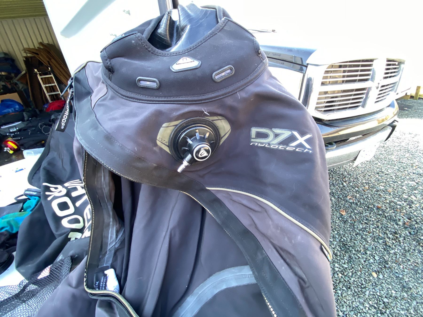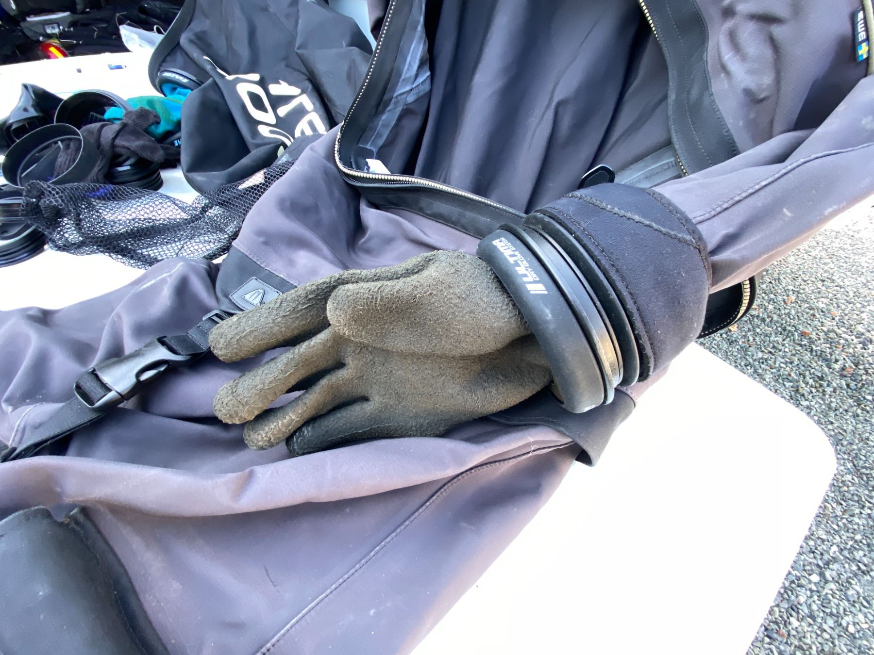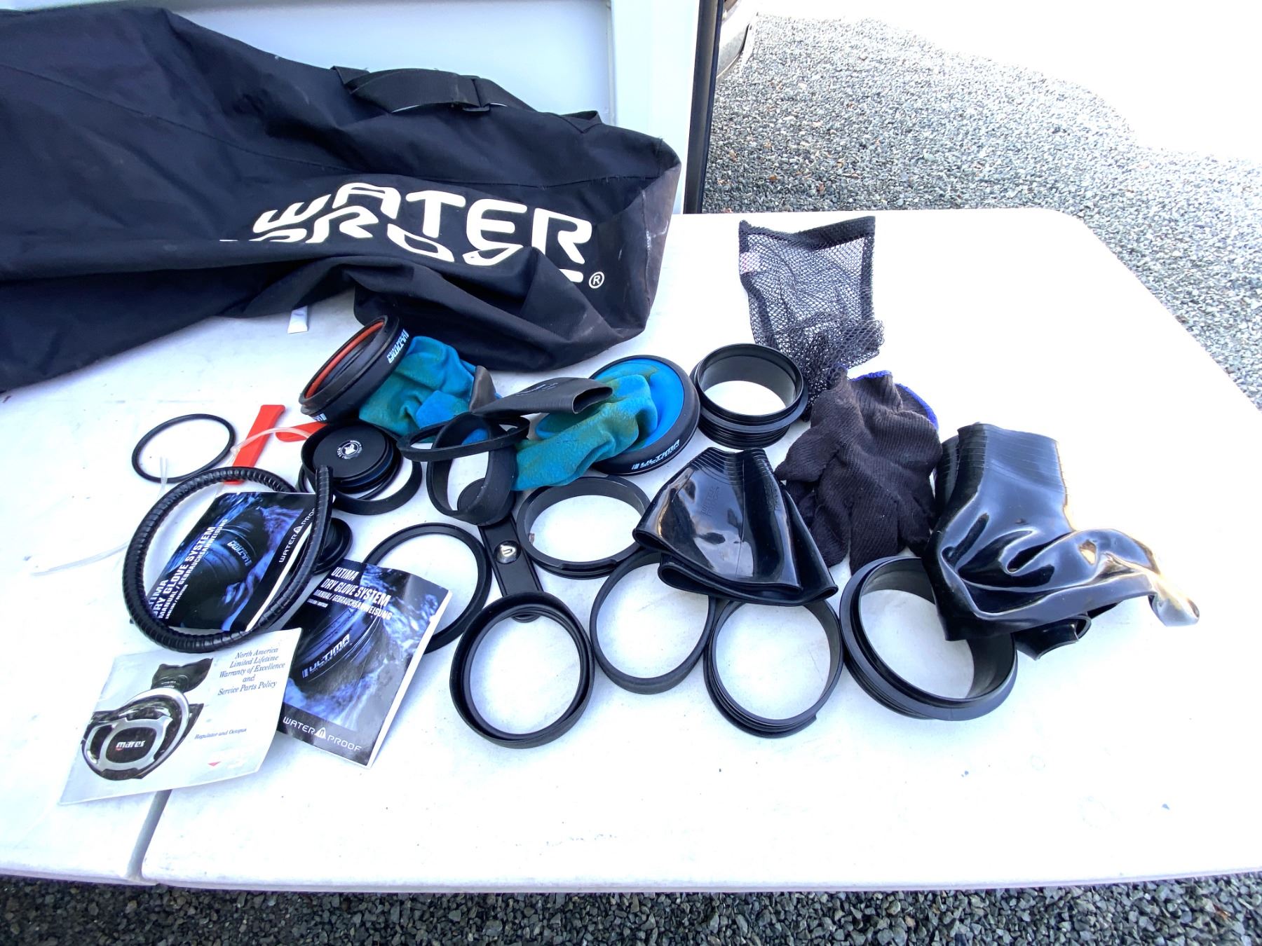 Water sport bag includes, Waterproof D7X nylotech Dry Suit with dry glove cuffs installed. Size Medium-Large, Spare cuffs and gloves. Pickup at 11 am