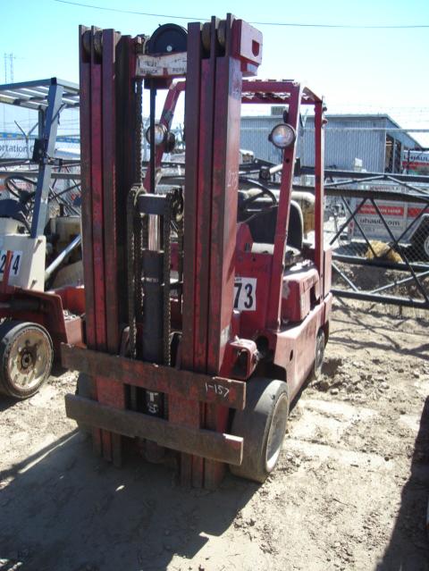 1983 DATSUN 40 WAREHOUSE FORKLIFT, s/n CPF02-021933: 3,300lb. CAPACITY, 4 CYL LP GAS ENGINE, 187in. LIFT HEIGHT, 2 STAGE MAST, CANOPY, SOLID TIRES (PARTS ONLY)