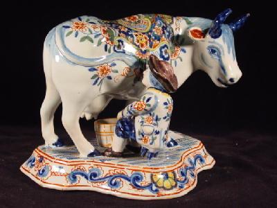 of a farmer milking a cow, makers: Cornelia Keyser and Adrien Pynaker, circa 1680-1700, height 6 ¾".