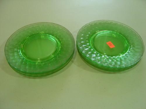LOT OF 6 GREEN DEPRESSION GLASS 8 INCH CAKE PLATES 1-HAS CHIP
