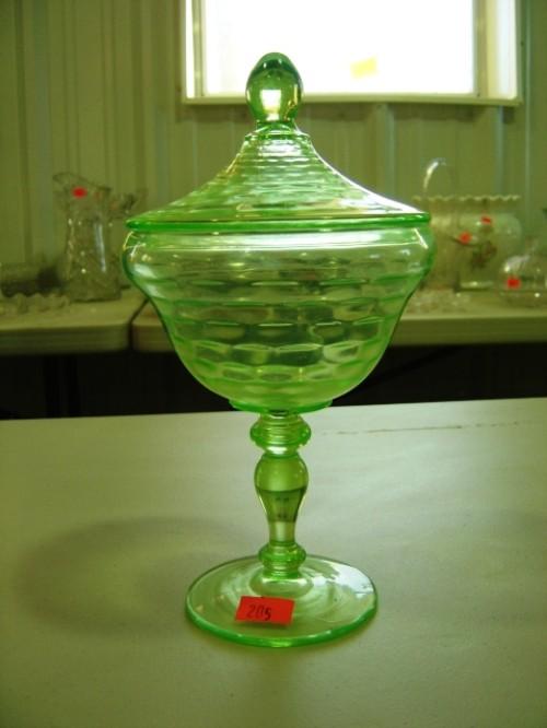 GREEN DEPRESSION GLASS PEDESTAL COVERED COMPOTE 10 INCH TALL