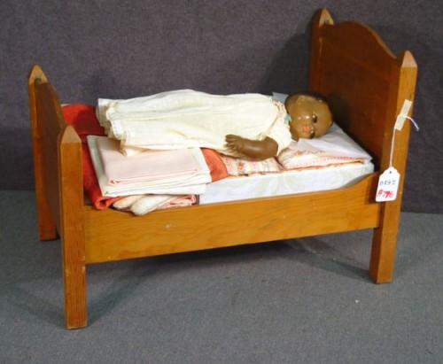 DOLL'S BED WITH BEDDING AND DOLL