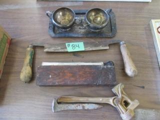 DRAW KNIFE, SILVER SUGAR AND CREAM, PENCIL CASE, BOTTLE CORKER, RAILROAD NAIL