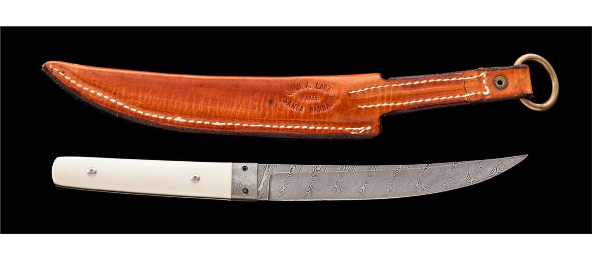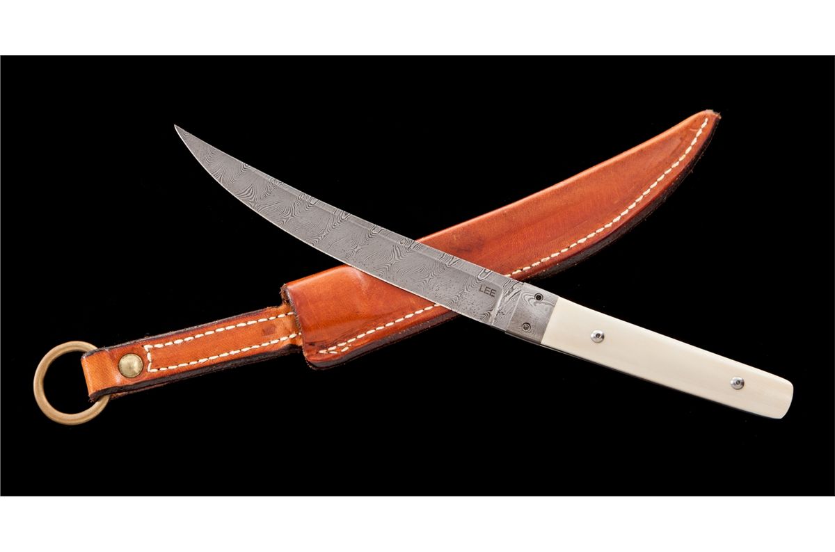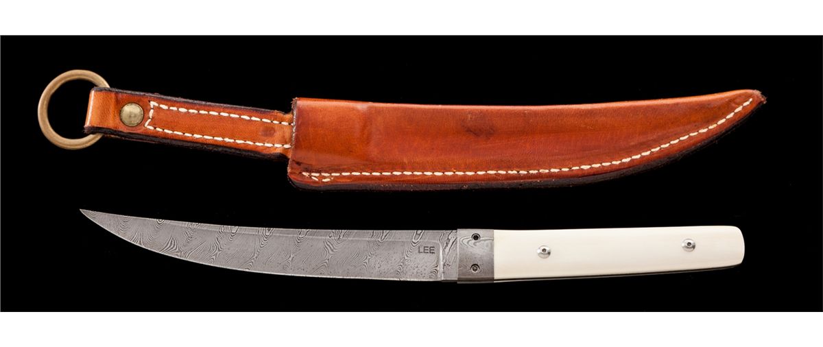 Damascus Blade Custom Fixed Blade Tanto, by Tommy Lee (Gaffney, SC) with sheath, 6-1/8'' Damascus blade marked ''Lee''; overall length is 10-5/8''. Damascus bolsters with smooth ivory handles. Leather sheath by Juan A. Lara (Santa Barbara, CA). Condition is excellent and as new, showing no use Ivory handles show very light handling marks. Leather sheath with minor scuffs and scratches. Est.: $300-$500.