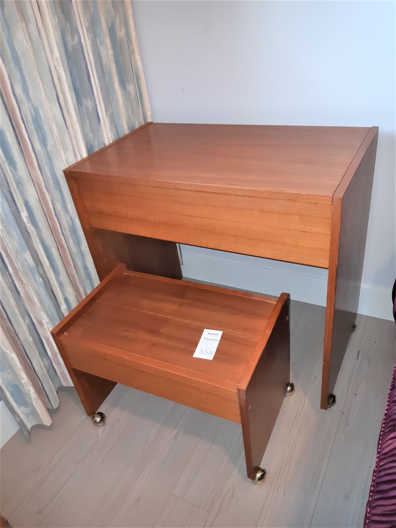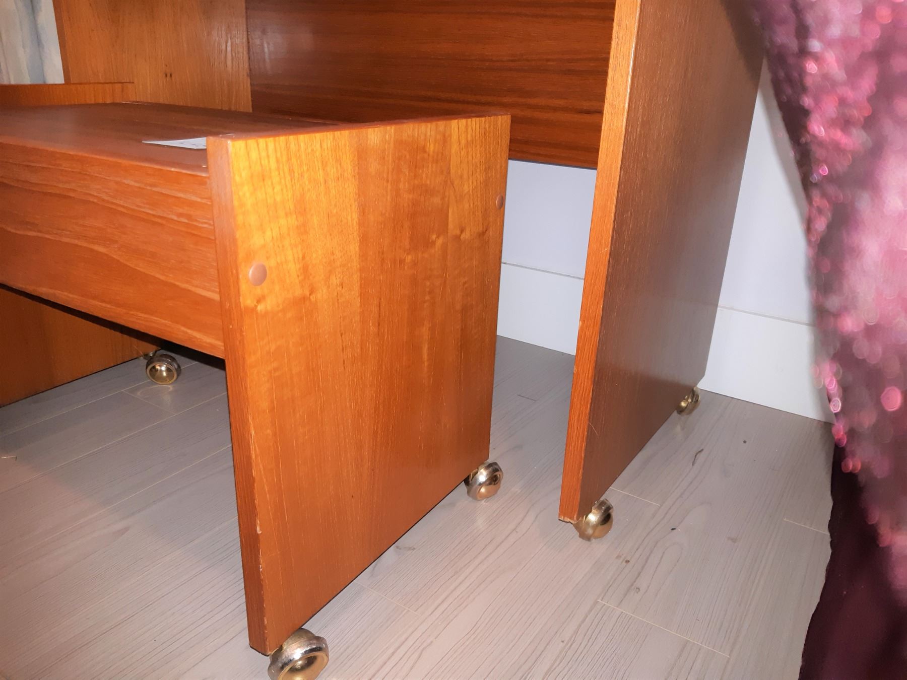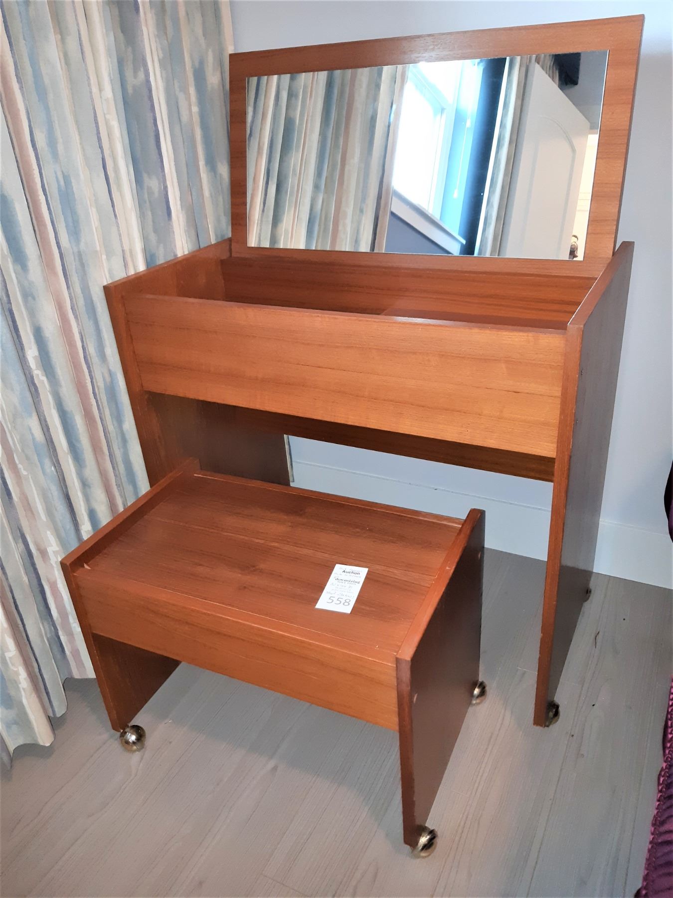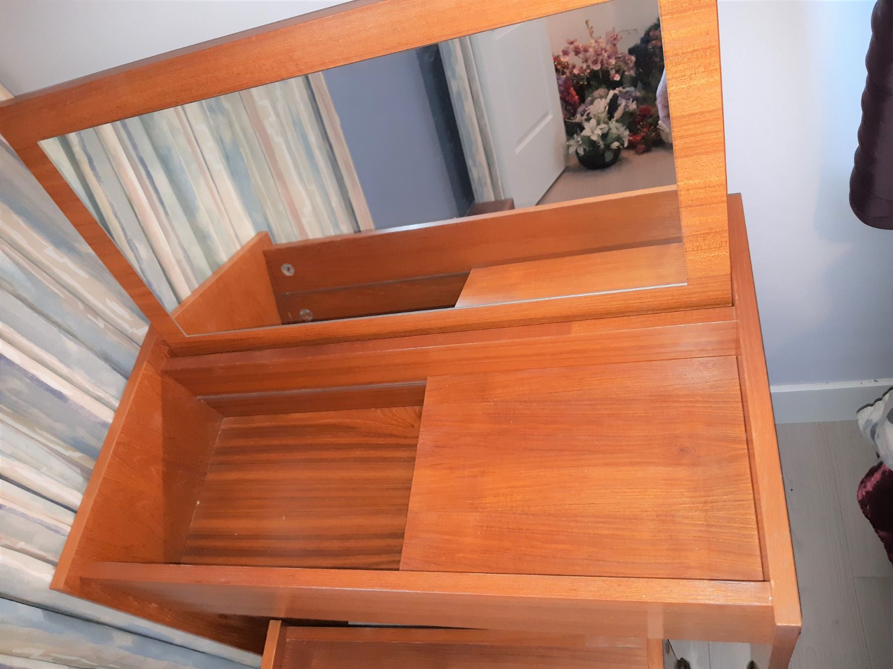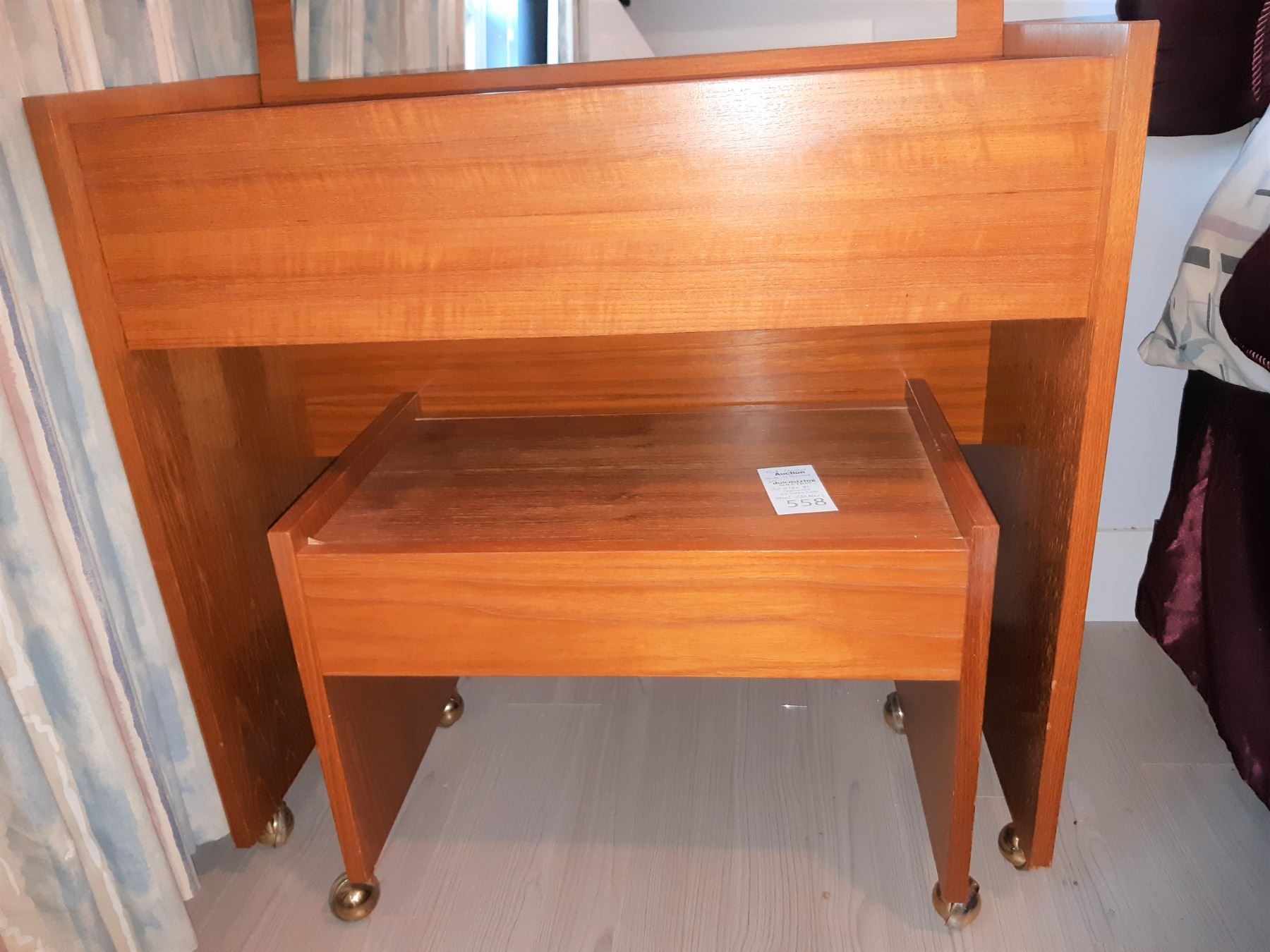 Teak veneer rolling vanity table from Denmark. Opens up to a makeup mirror with storage compartment note scratches. Danish matching rolling bench table, note veneer has pulled away in one corner 32x18x31 bench 23x14x13 note scratches pickup at 11 am