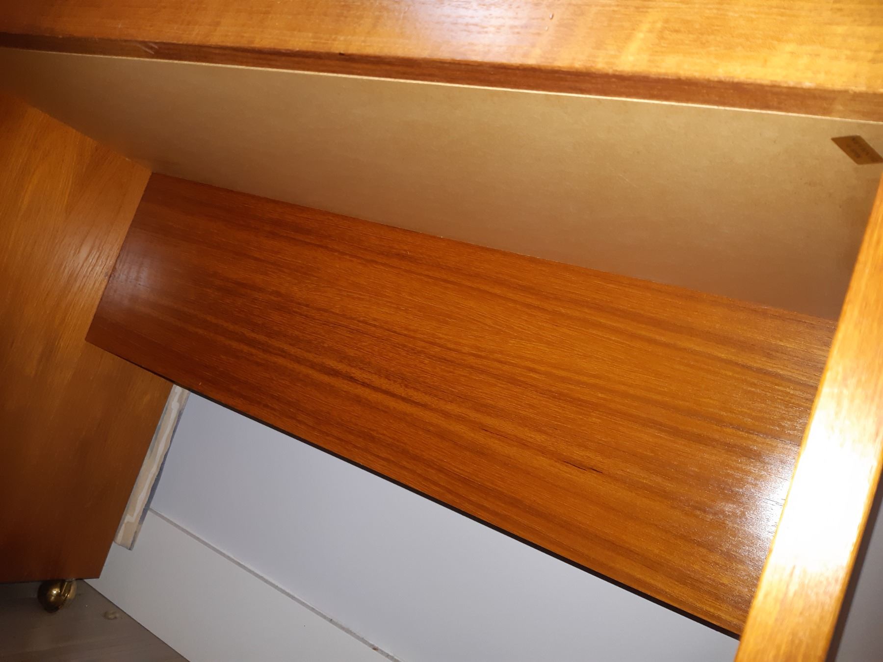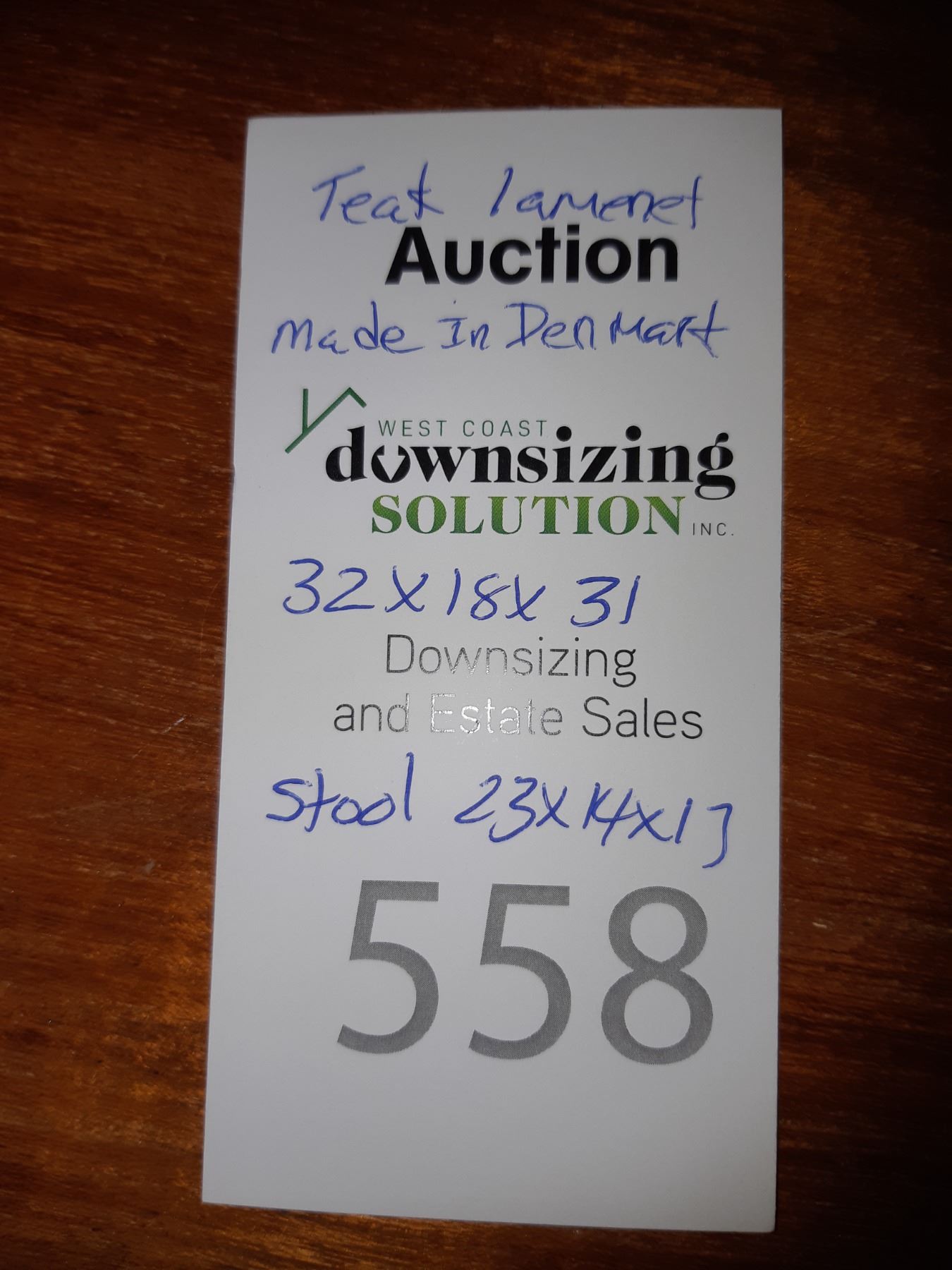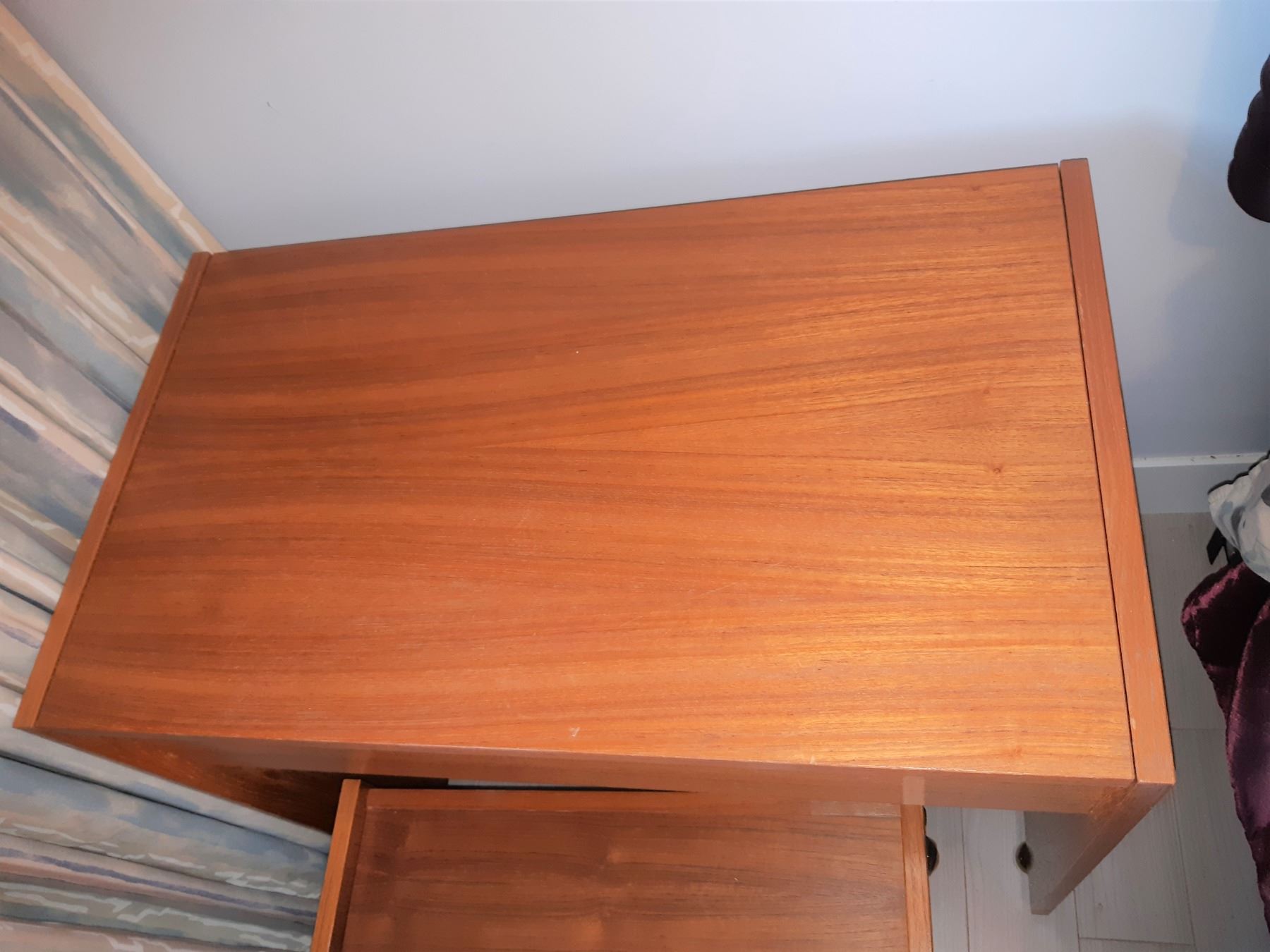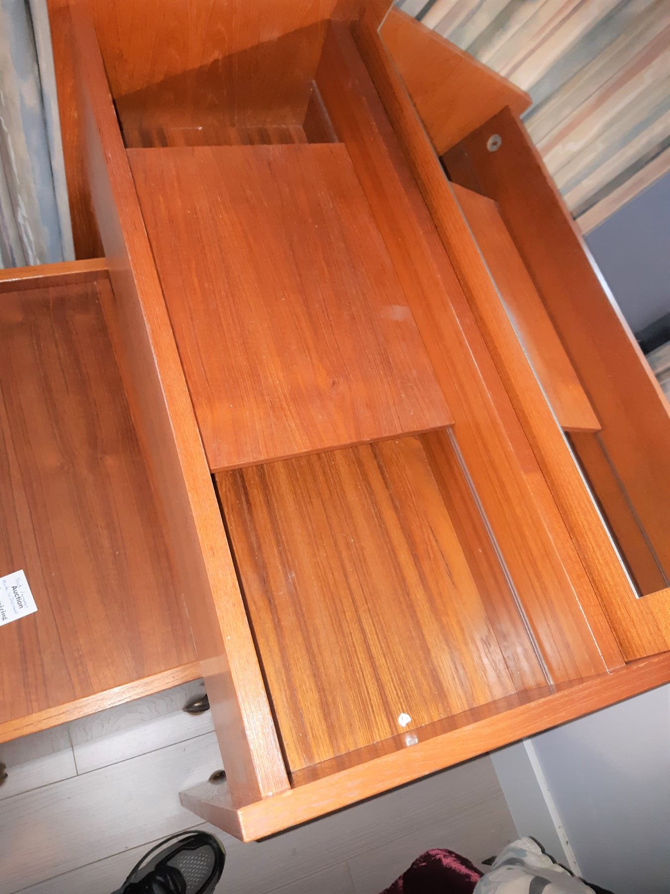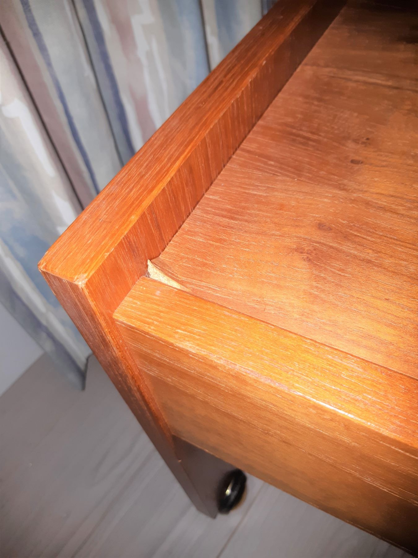 Teak veneer rolling vanity table from Denmark. Opens up to a makeup mirror with storage compartment note scratches. Danish matching rolling bench table, note veneer has pulled away in one corner 32x18x31 bench 23x14x13 note scratches pickup at 11 am