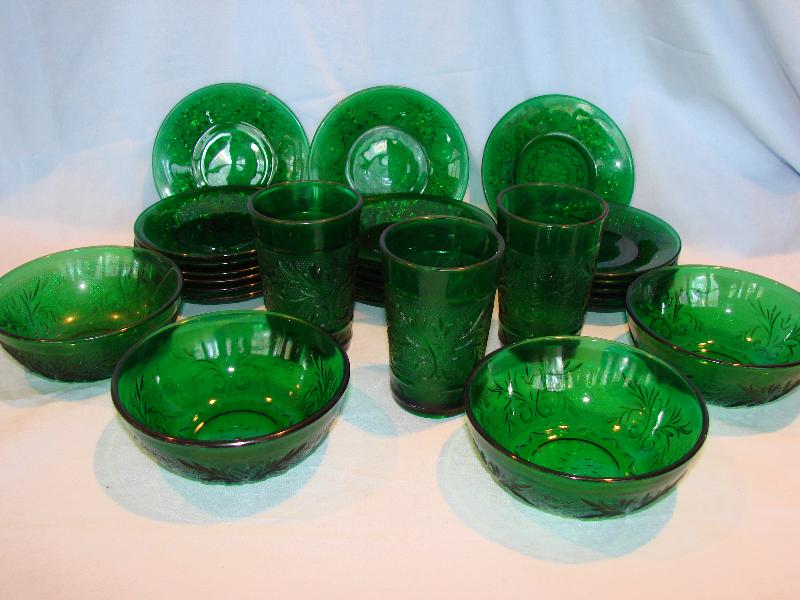 Dark green sandwich glassware:20 sm.plates,3 juice glasses 4 bowls