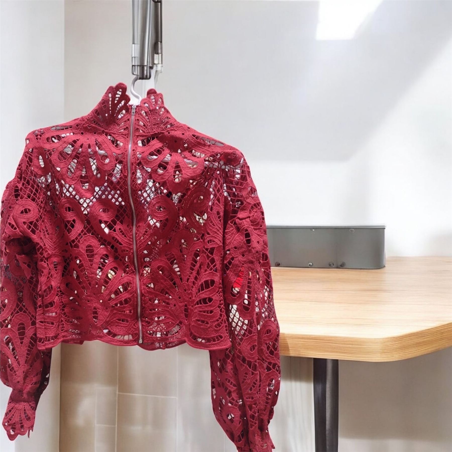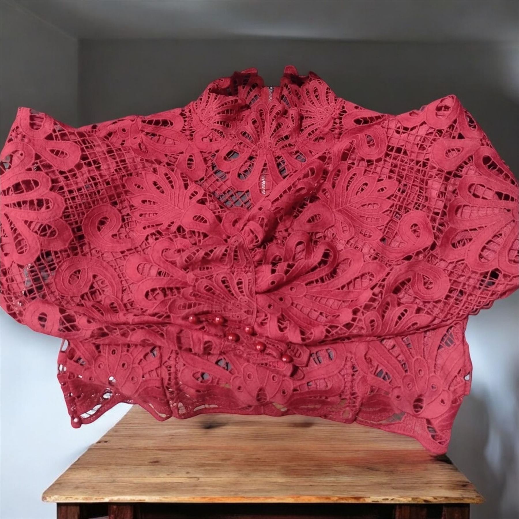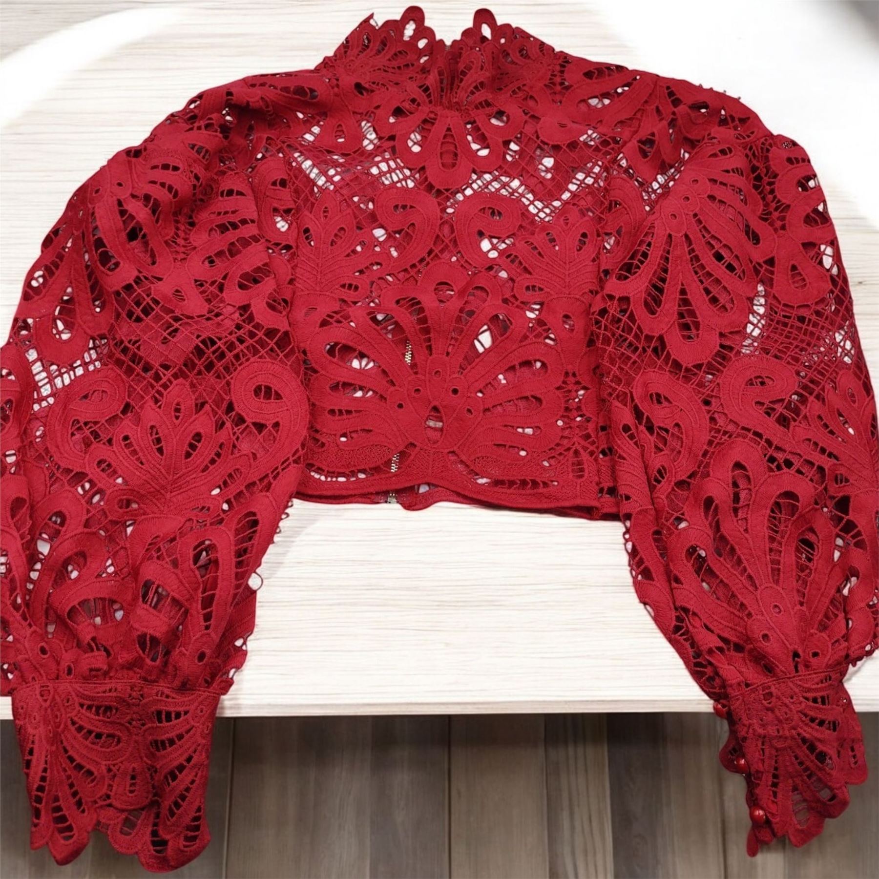 Dark Red Net and Lacy Blouse with full umbrella sleeves Size M