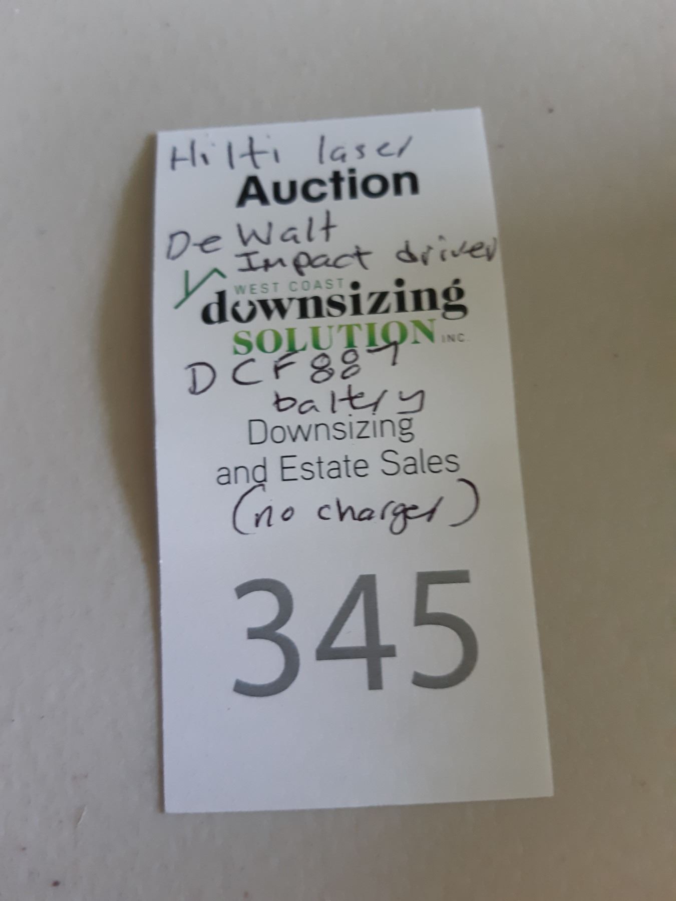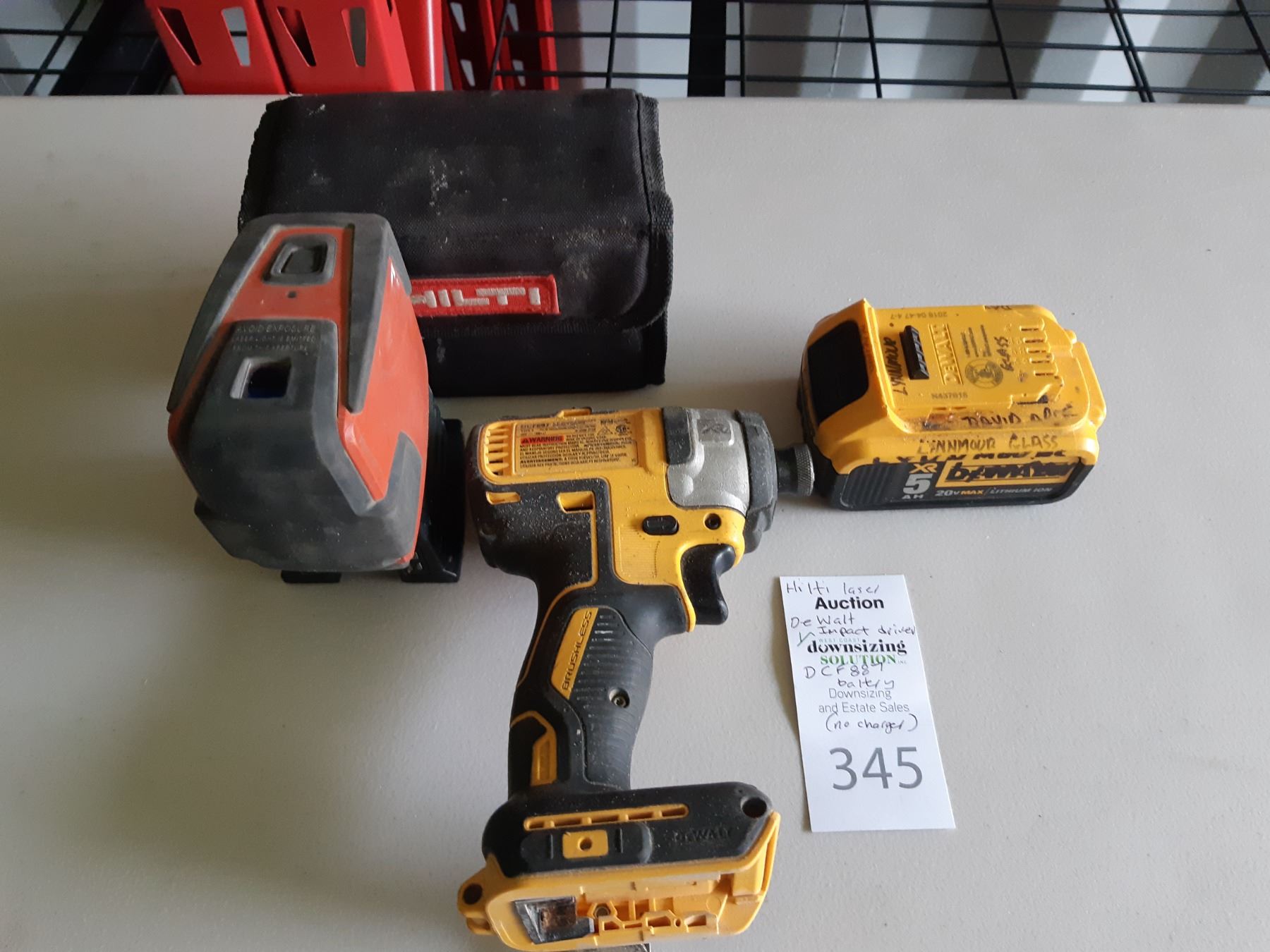 DeWalt impact driver DCF887 & battery, note there is no charger, untested. Hilti Laser. Pickup at 11 am