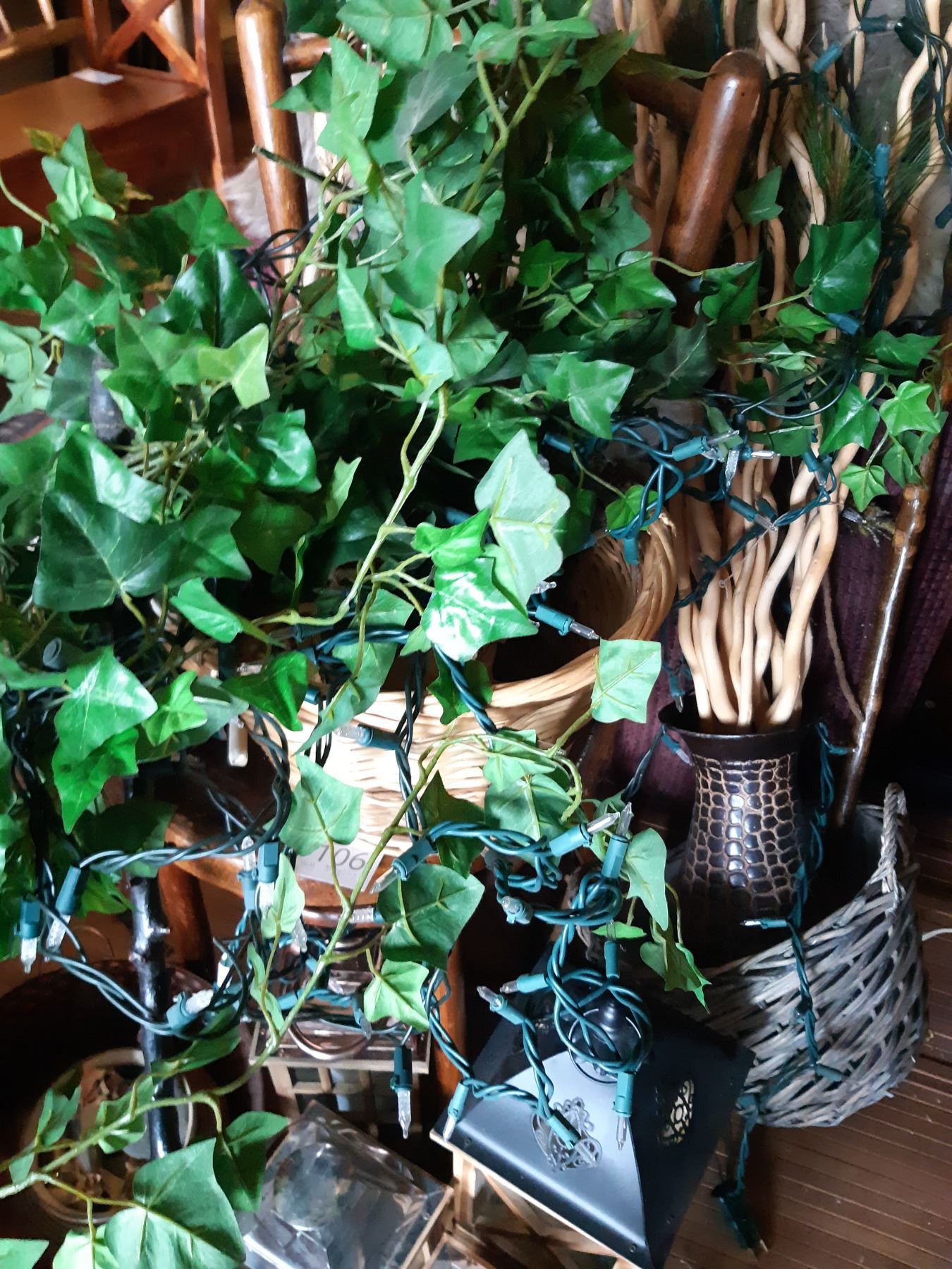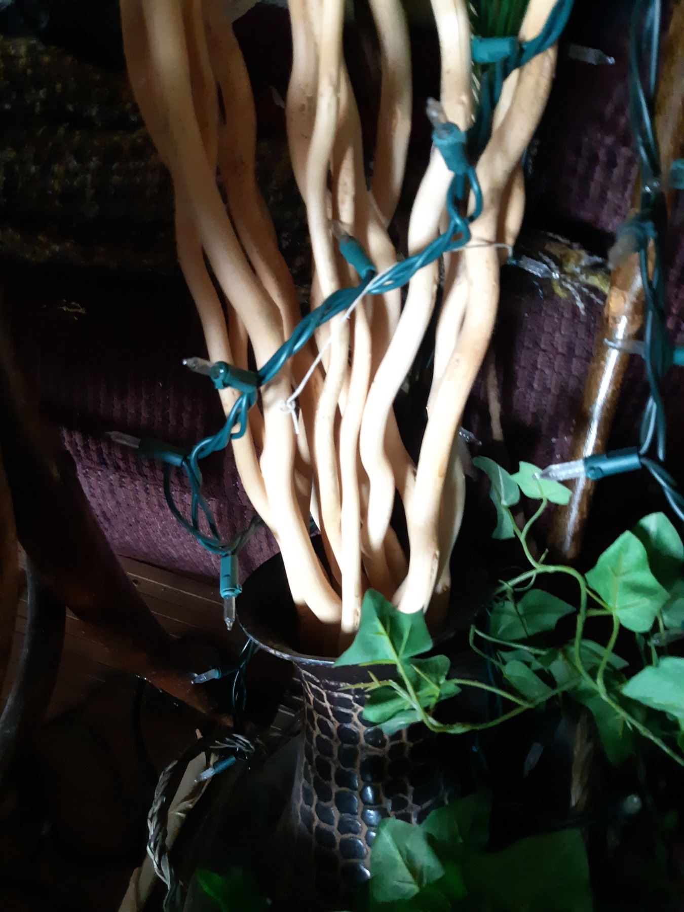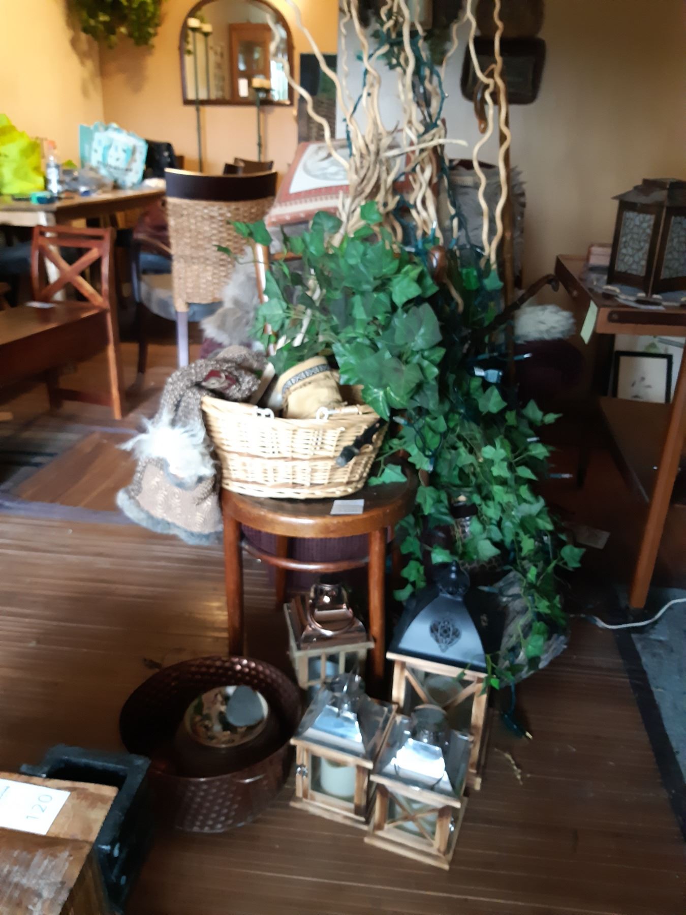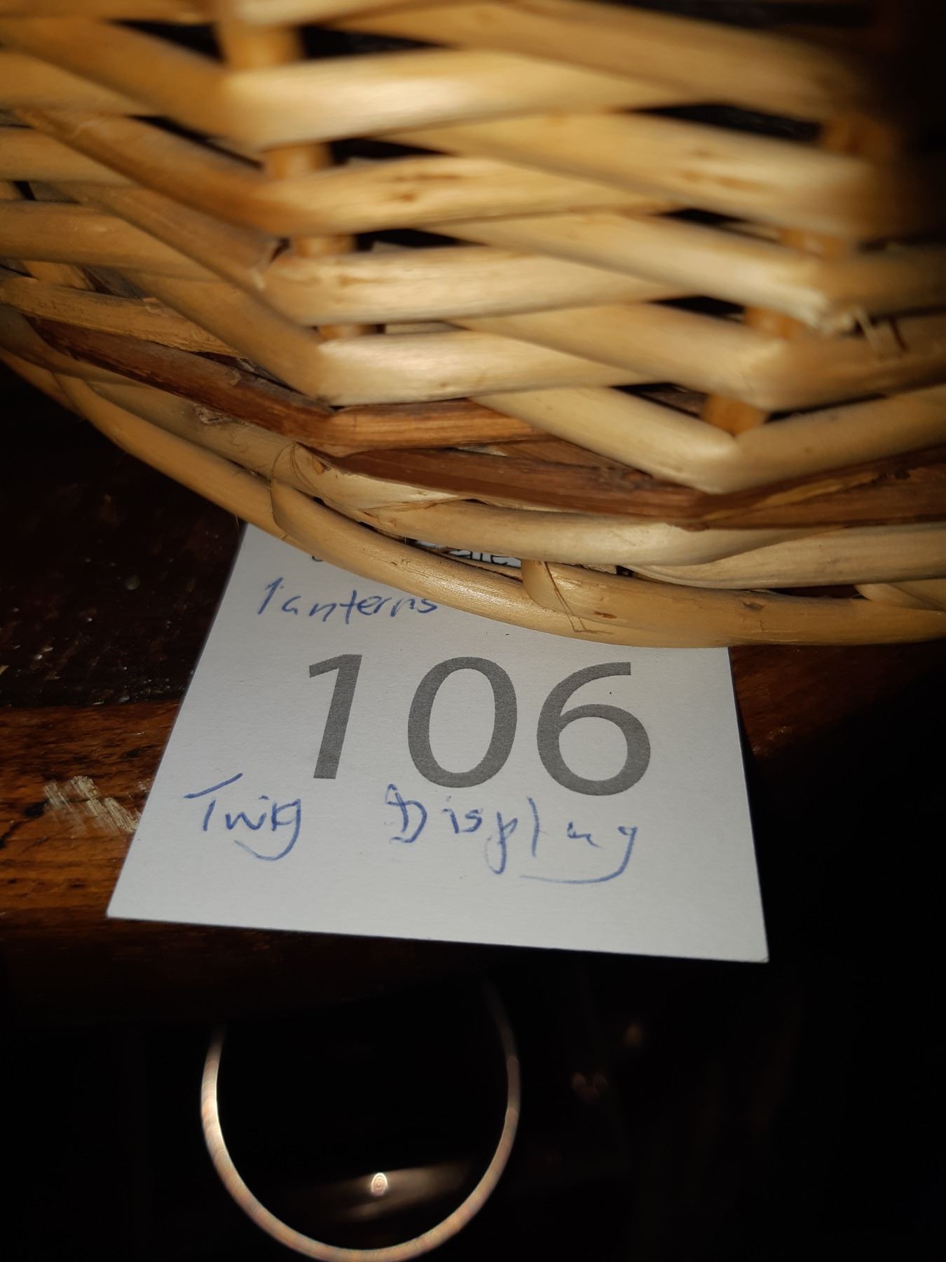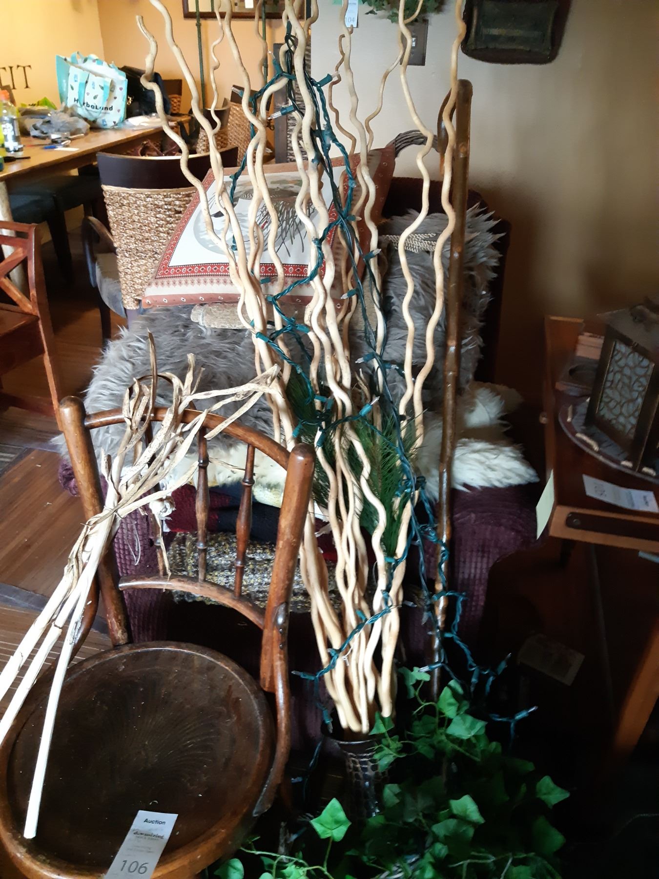 Willow sticks, faux plant with lights, 4 candle lanterns, baskets, chair 15x13x34, tall cane, and more included. Bring packing supplies. Pickup at 9 am.
