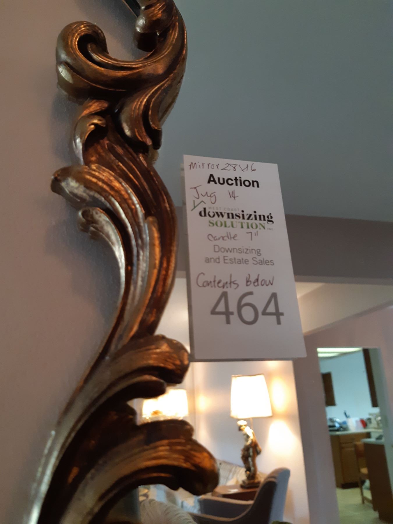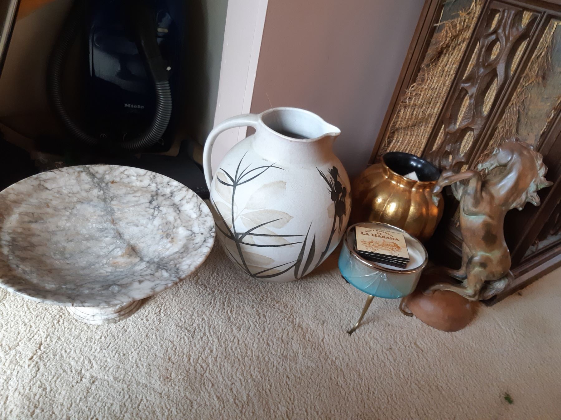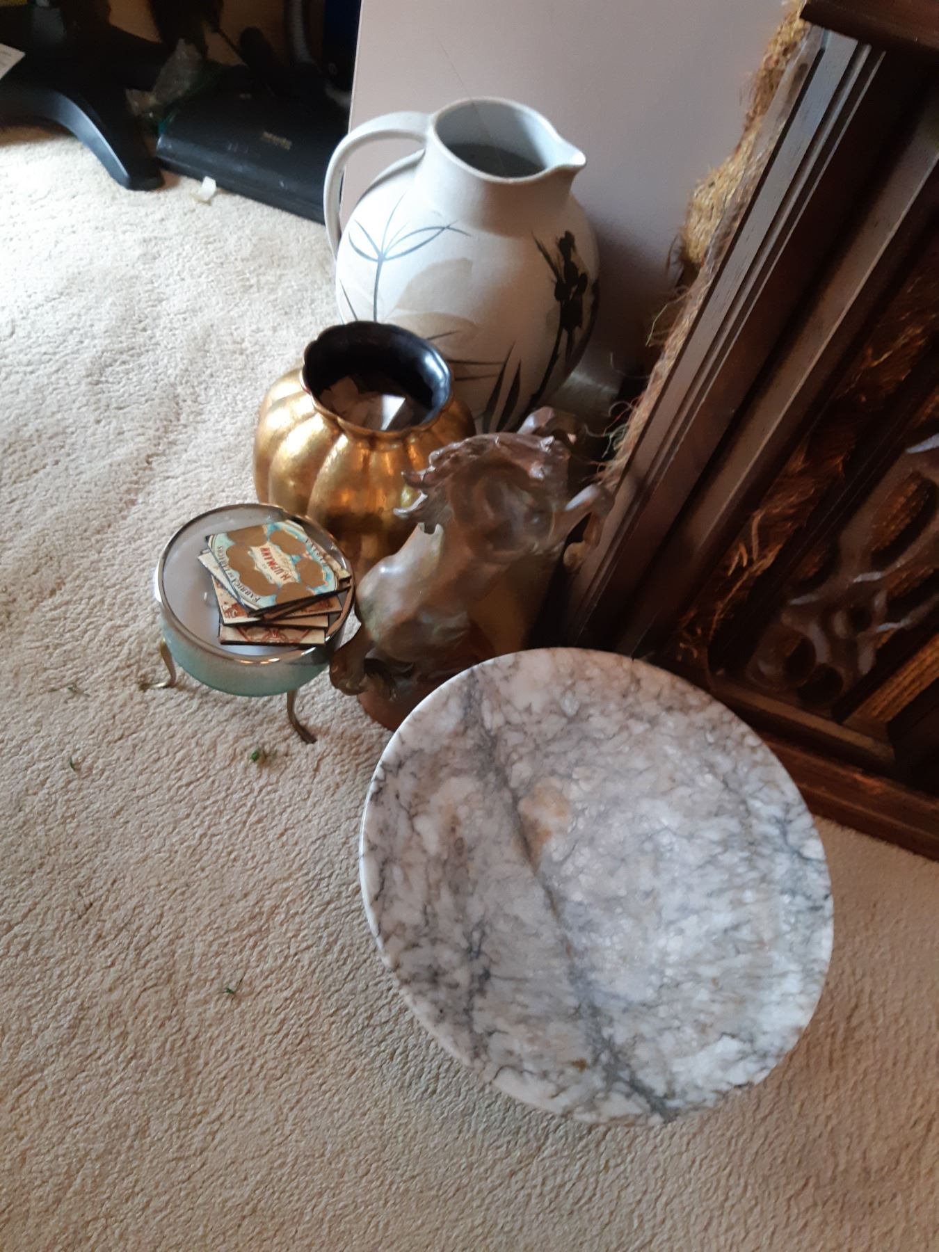 Decor includes mirror 28x16, jugs, horse, candle holder, and more. Pickup at 9 am.