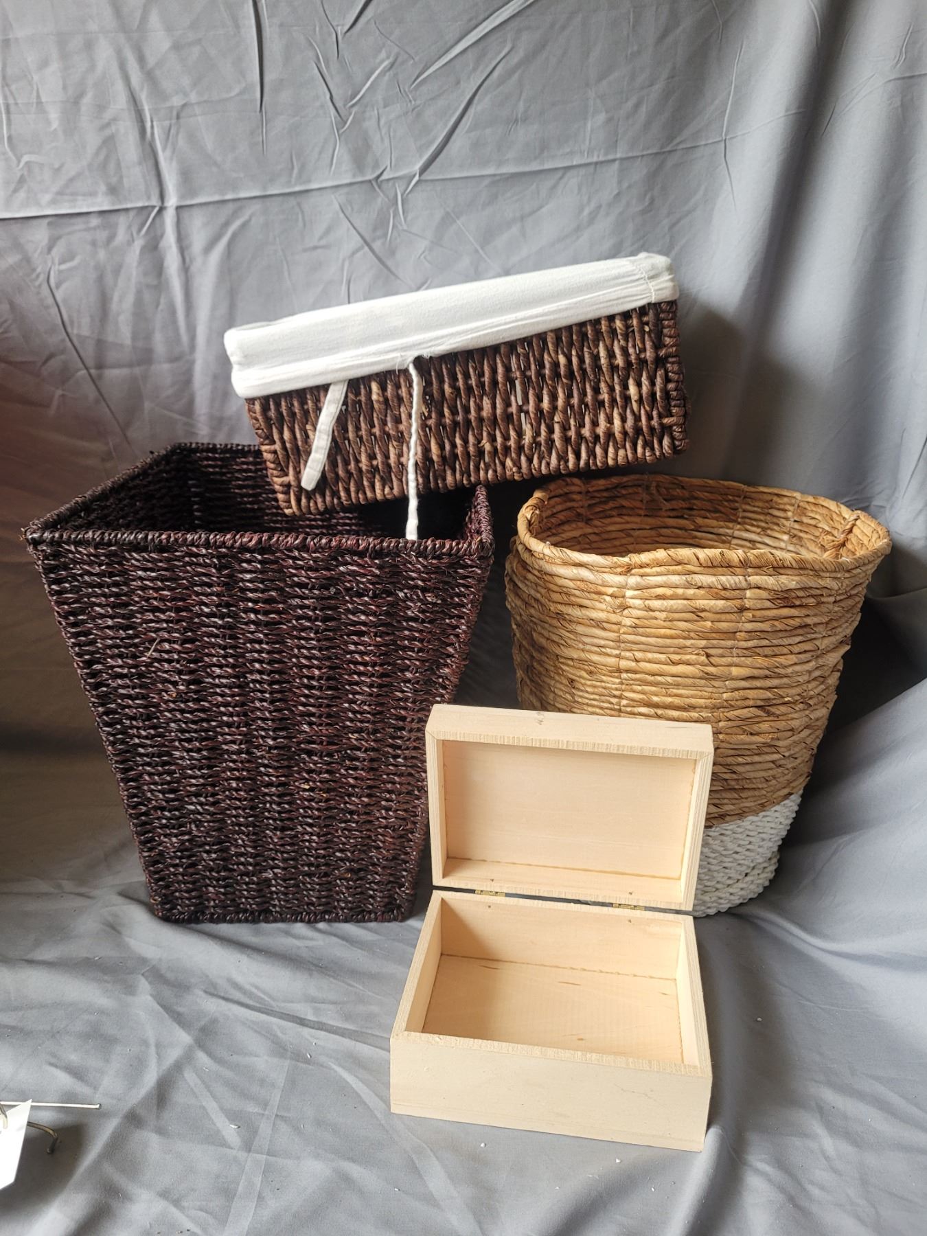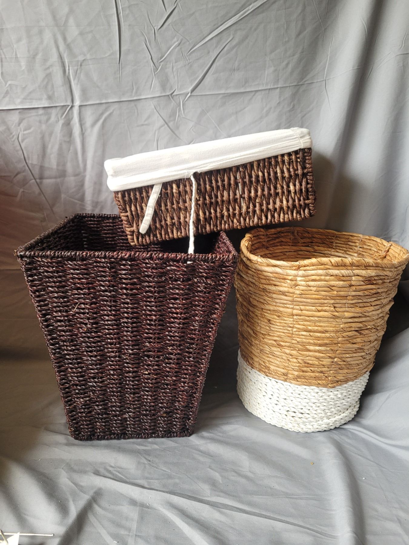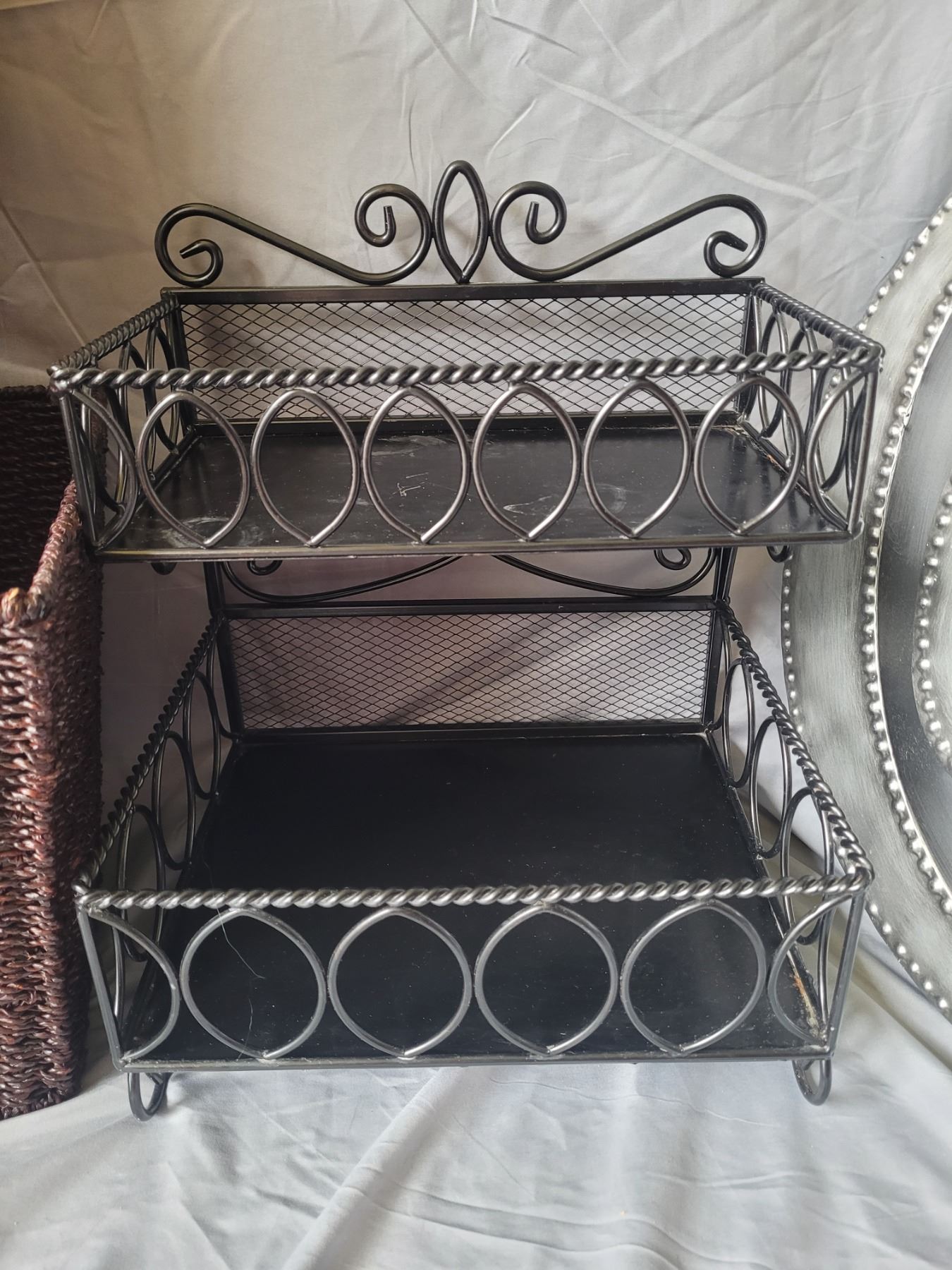 Storage baskets, metal hangin shelf, set of candle holders. Monotone rotary phone. pickup at 10 am