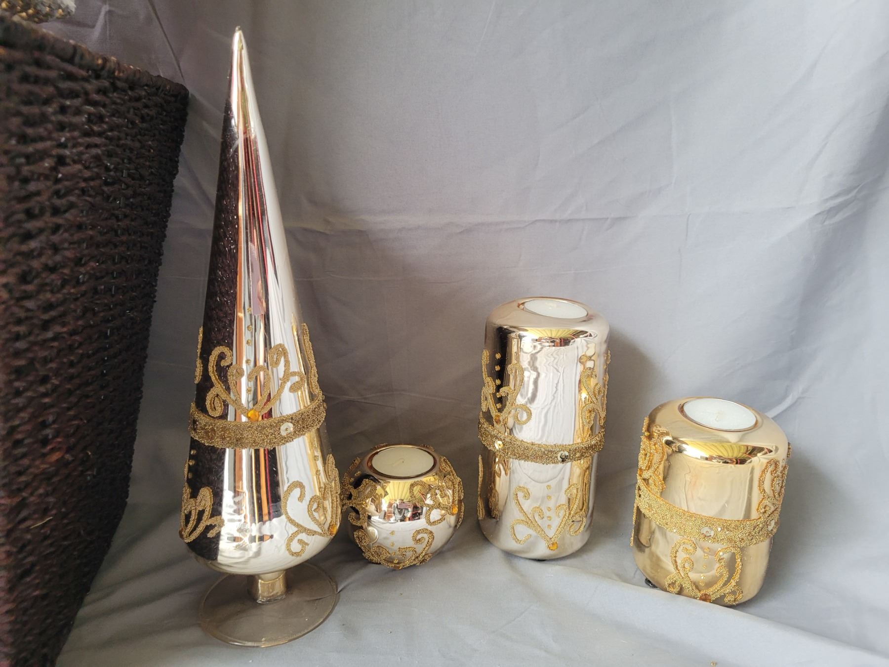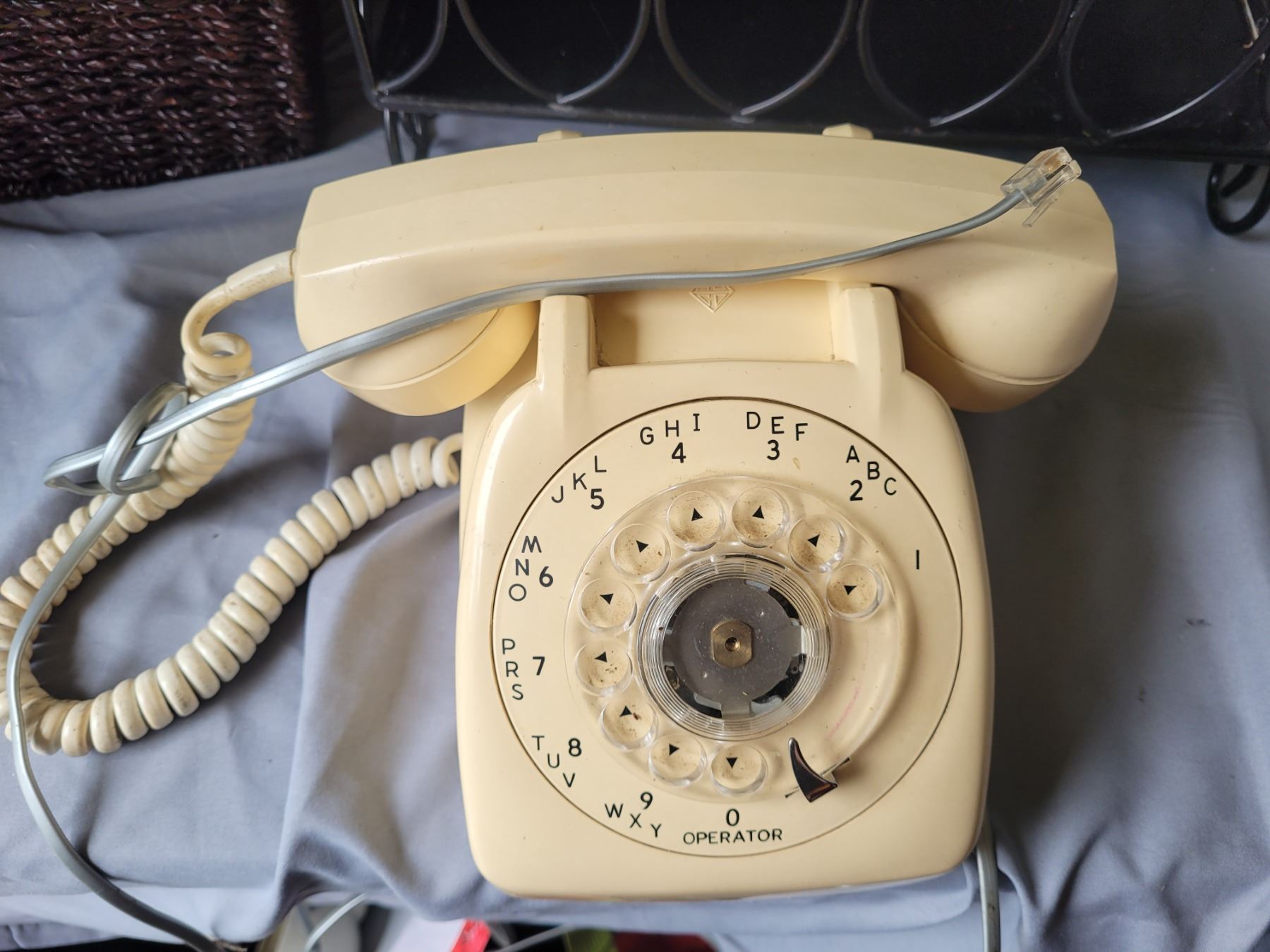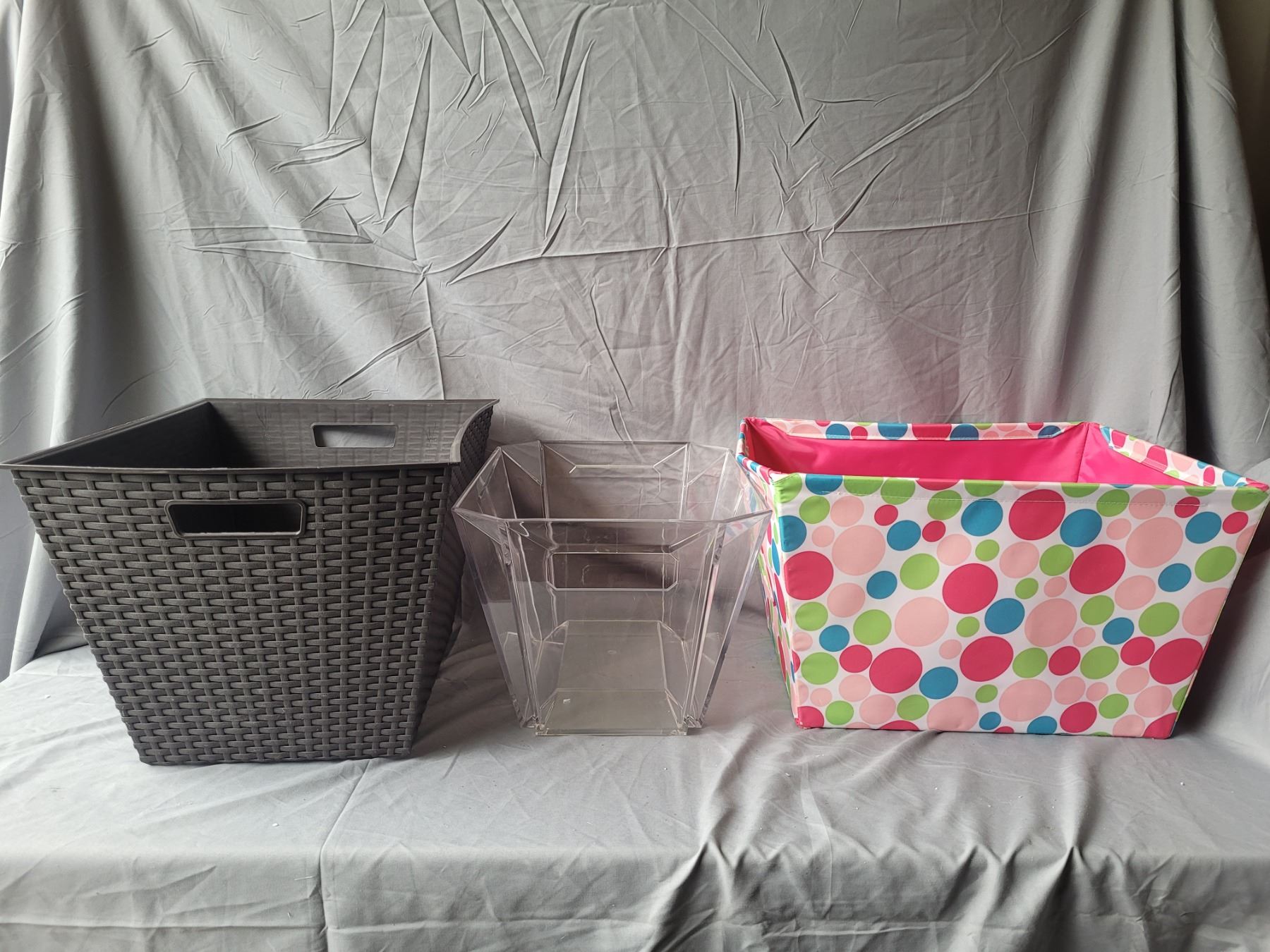 Storage baskets, metal hangin shelf, set of candle holders. Monotone rotary phone. pickup at 10 am
