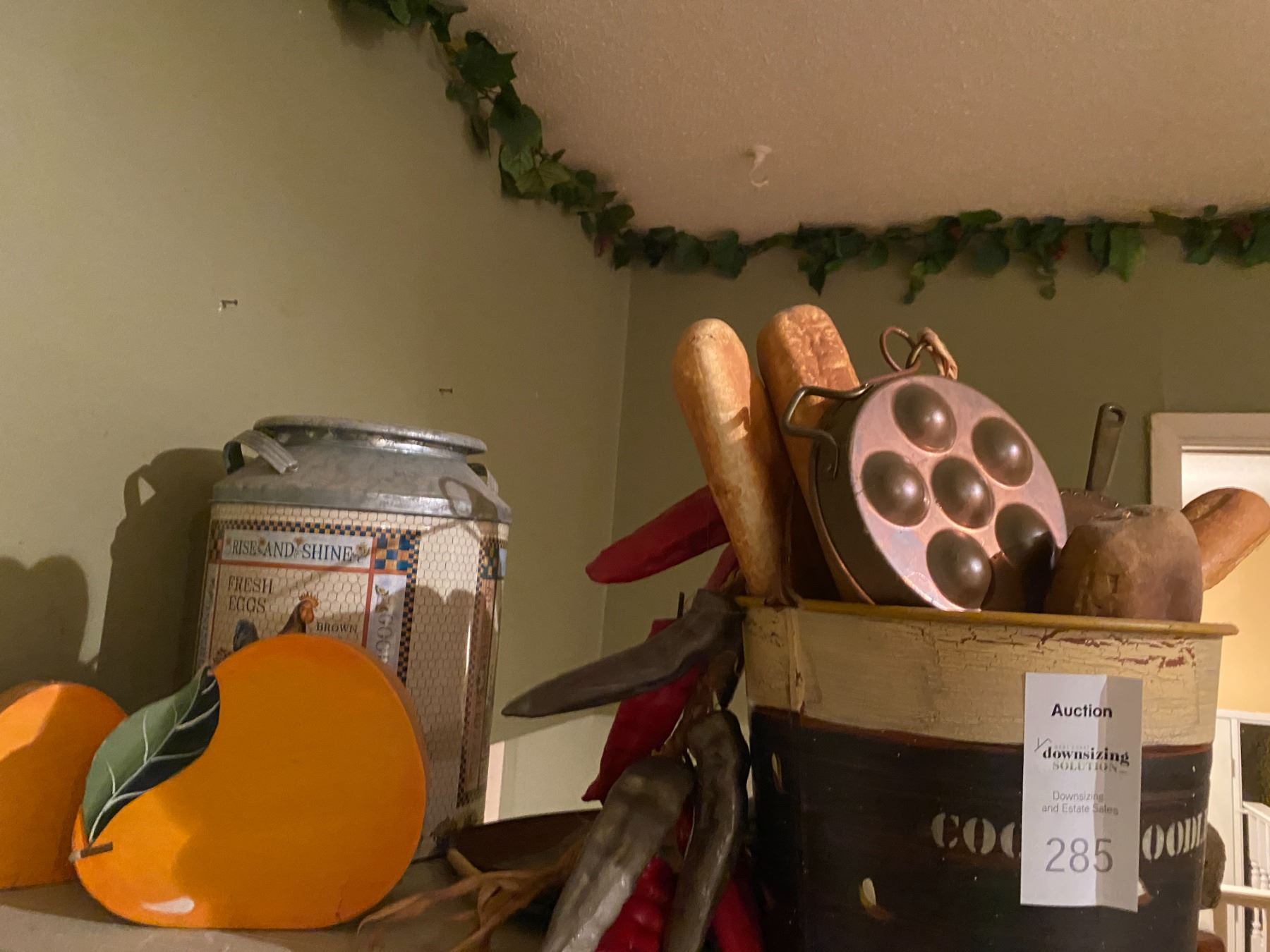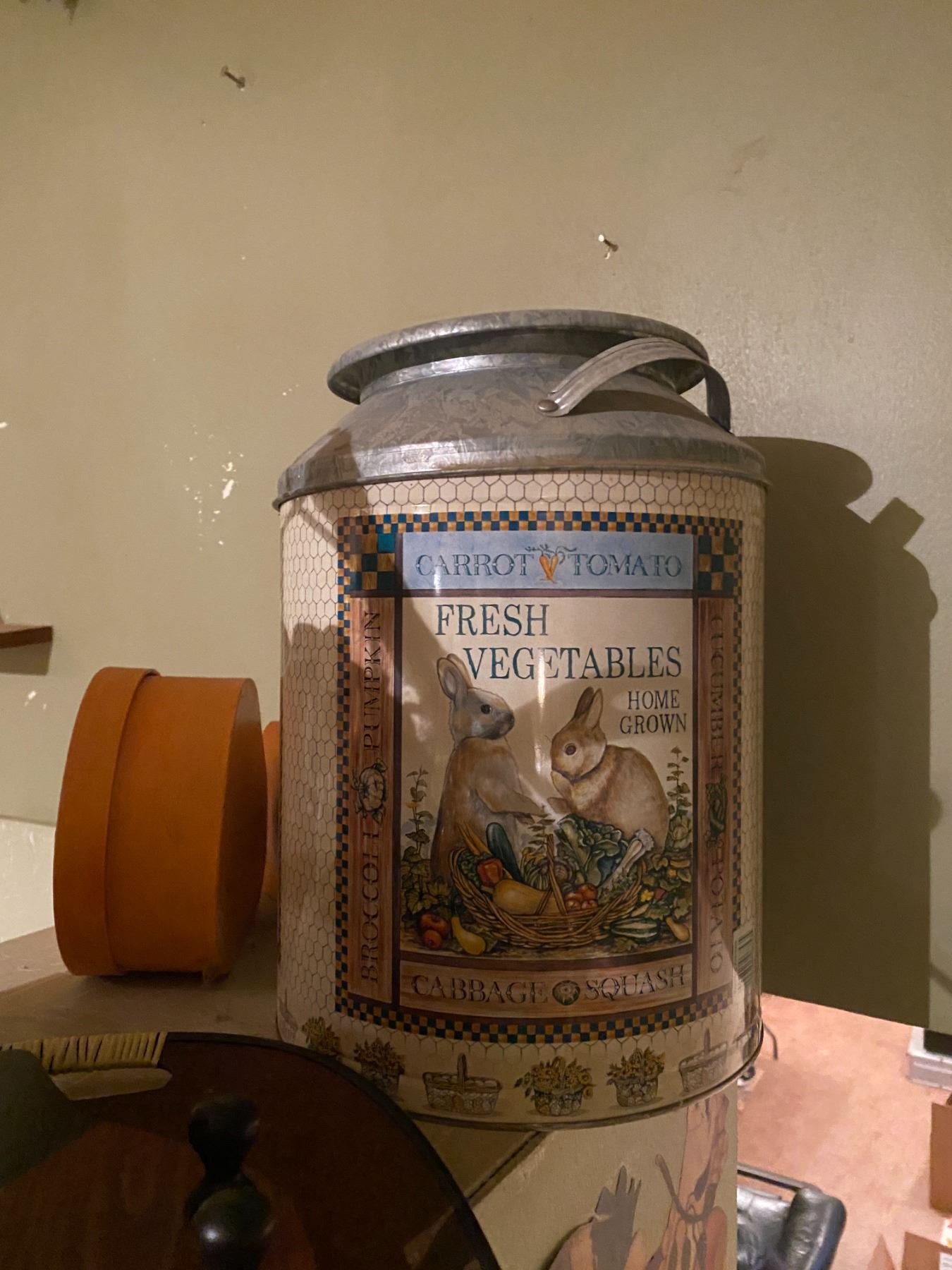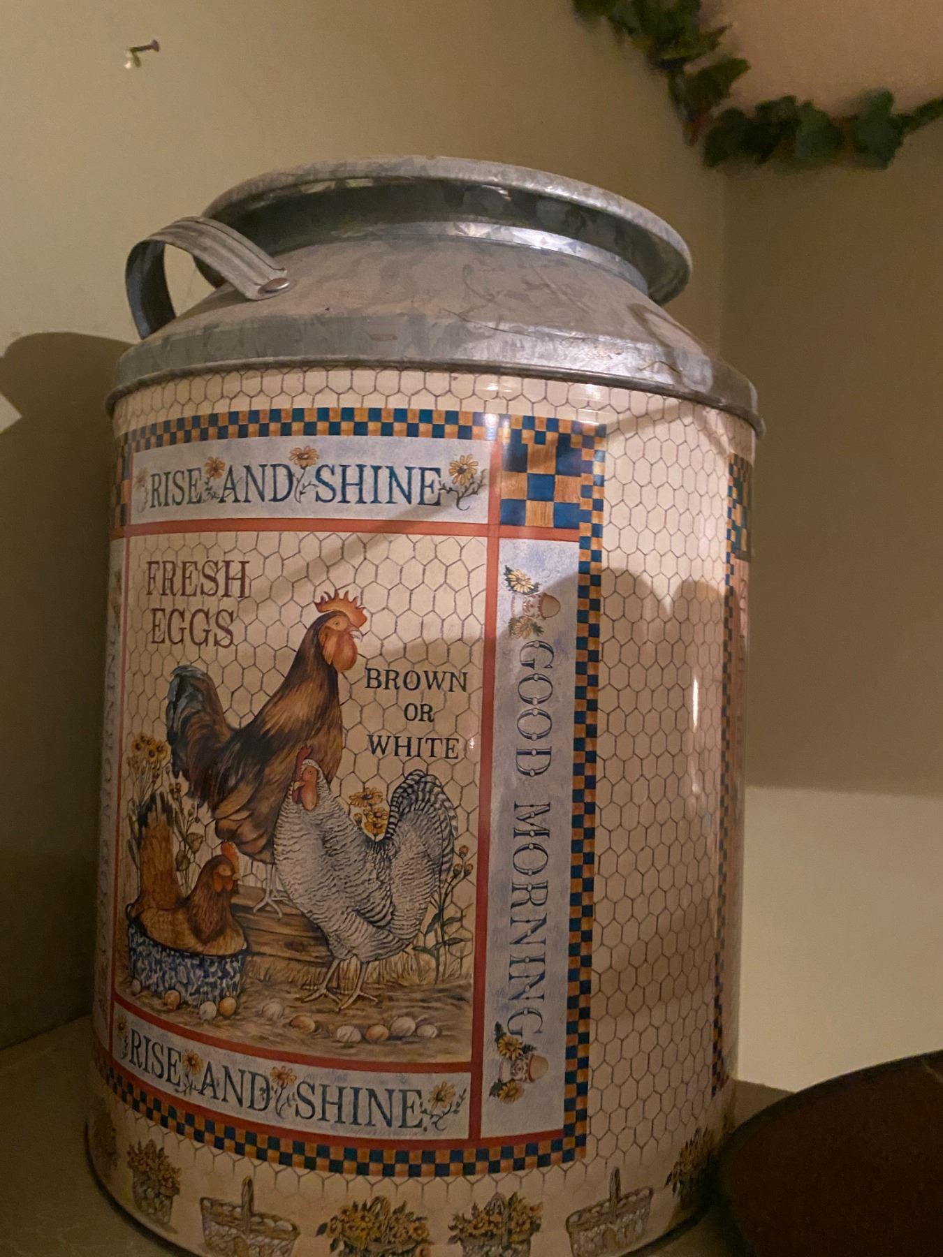 Metal decorative milk can, calkware and more. pickup at 10 am