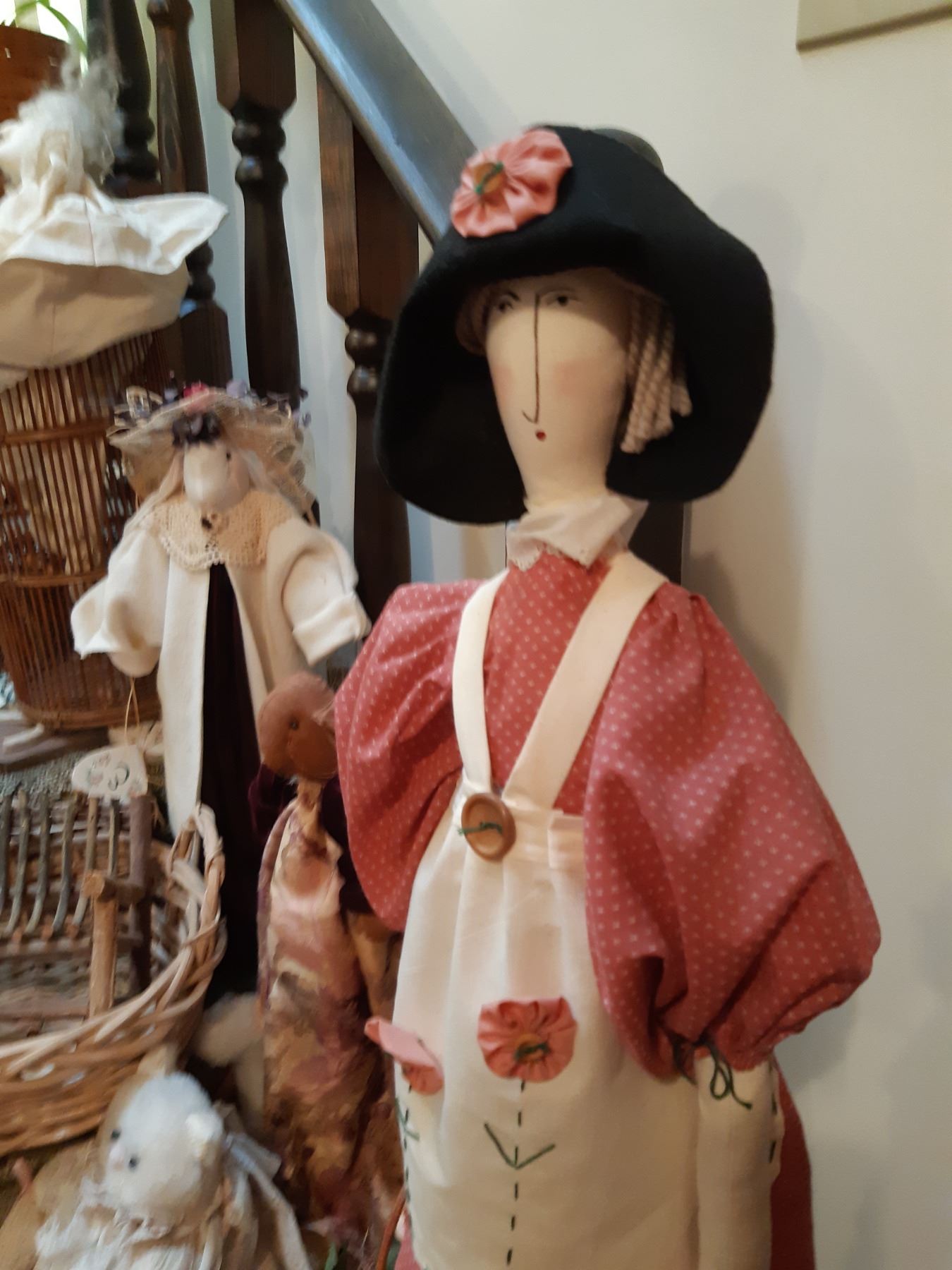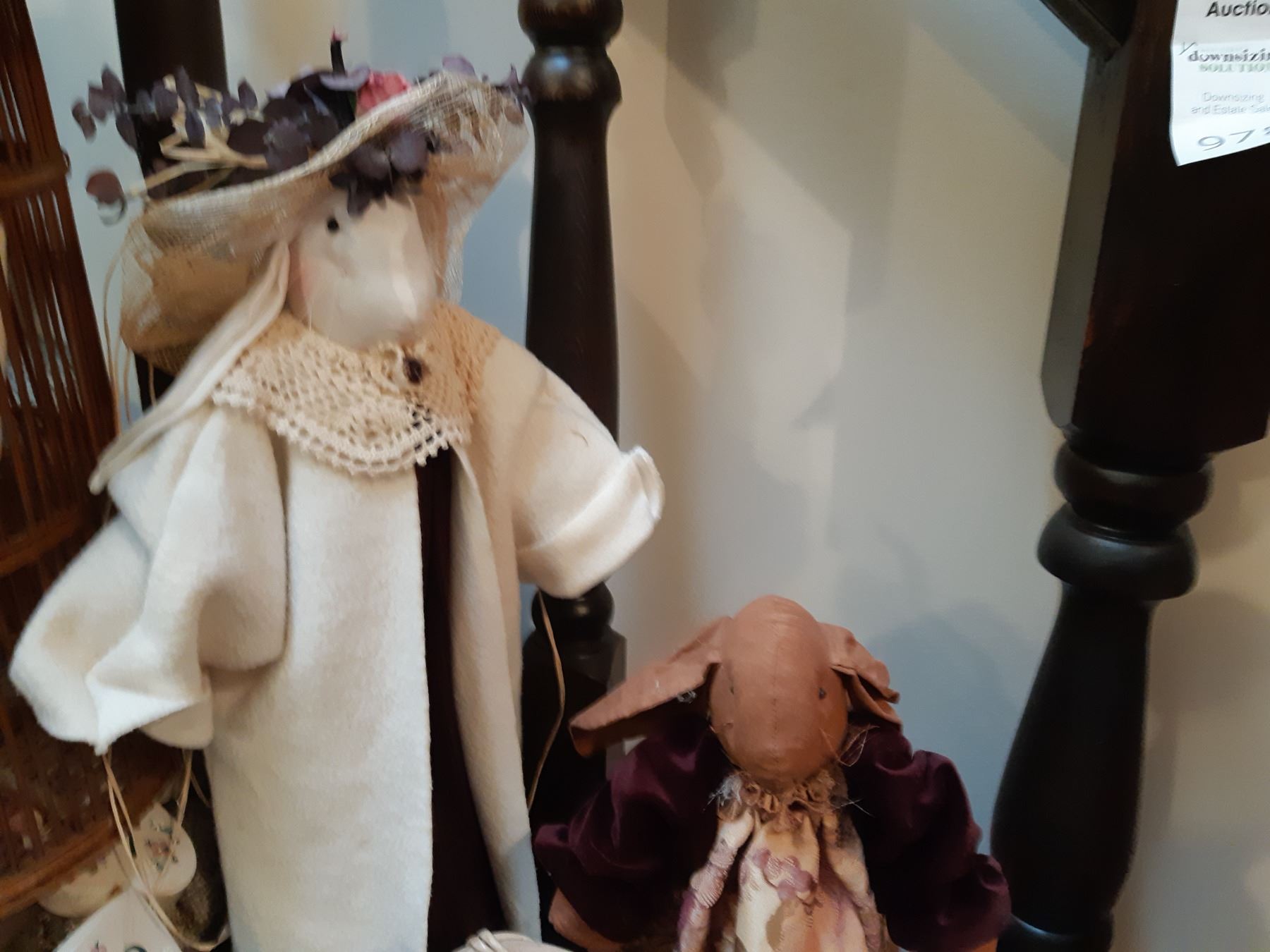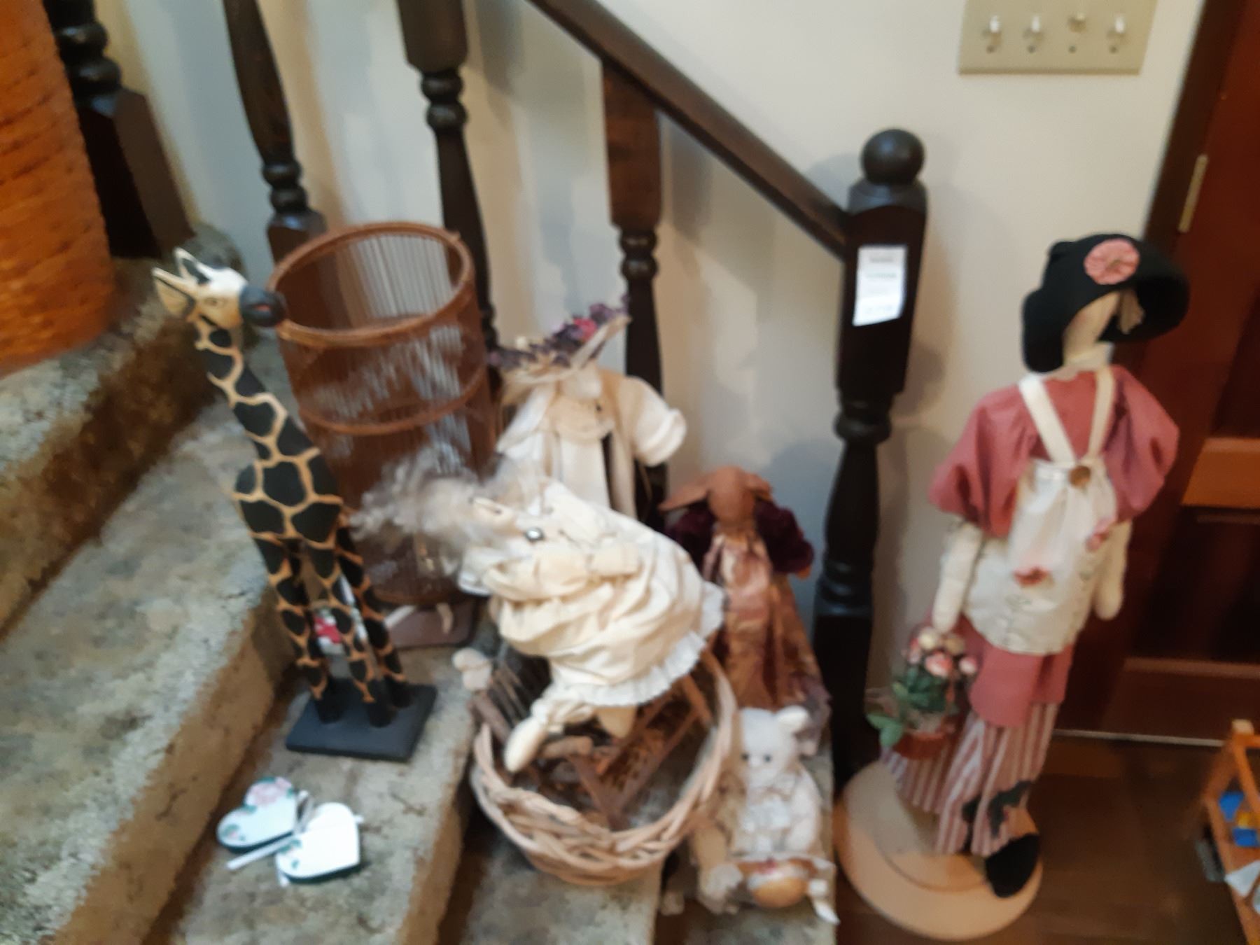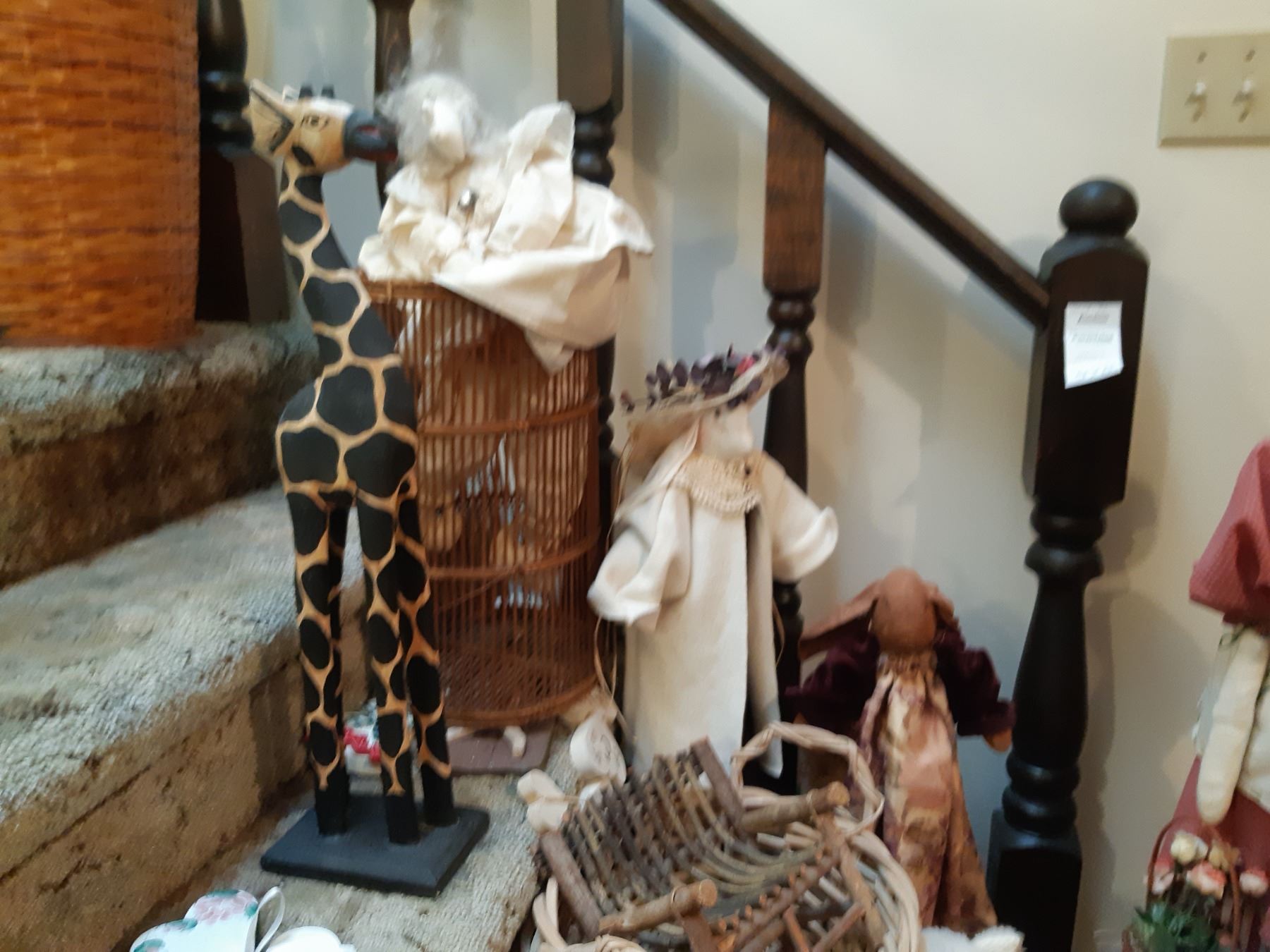Tall 44” Country doll on stand, rabbit, kitty and grandma on bench, basket and Giraffe. Bring packing supplies and pickup at 9am